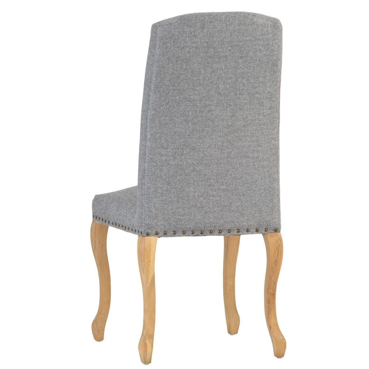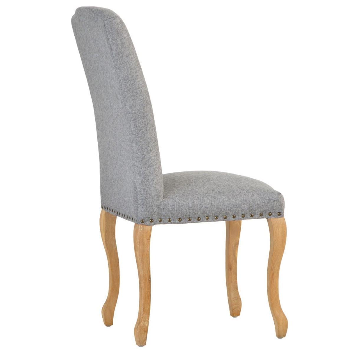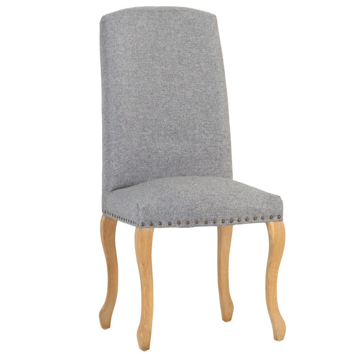 This elegant Lucerne light grey luxury dining chair with studs promises to sit pretty at your dining table. Pale upholstery fabric is paired with our solid oak legs to bring freshness and light to any style of space. Metal studding around the base of seat, along with the bow-shaped legs, add classic details to the modern dove-grey hue. This chair is generously padded to keep your dinner guests sitting comfortably, and its adaptable design complements any style of dining table. You can also use it on its own in your living room to show off its eye-catching features in full.