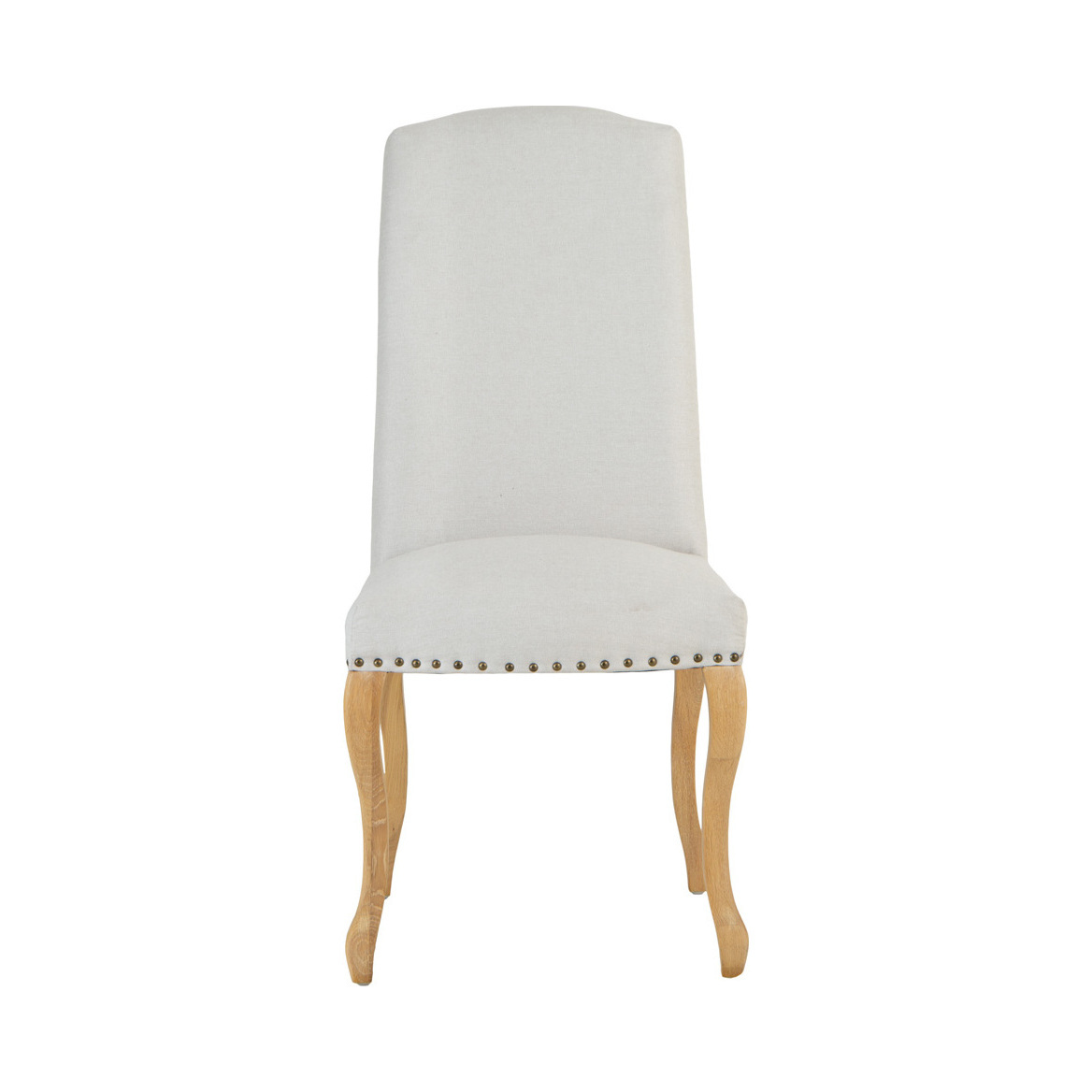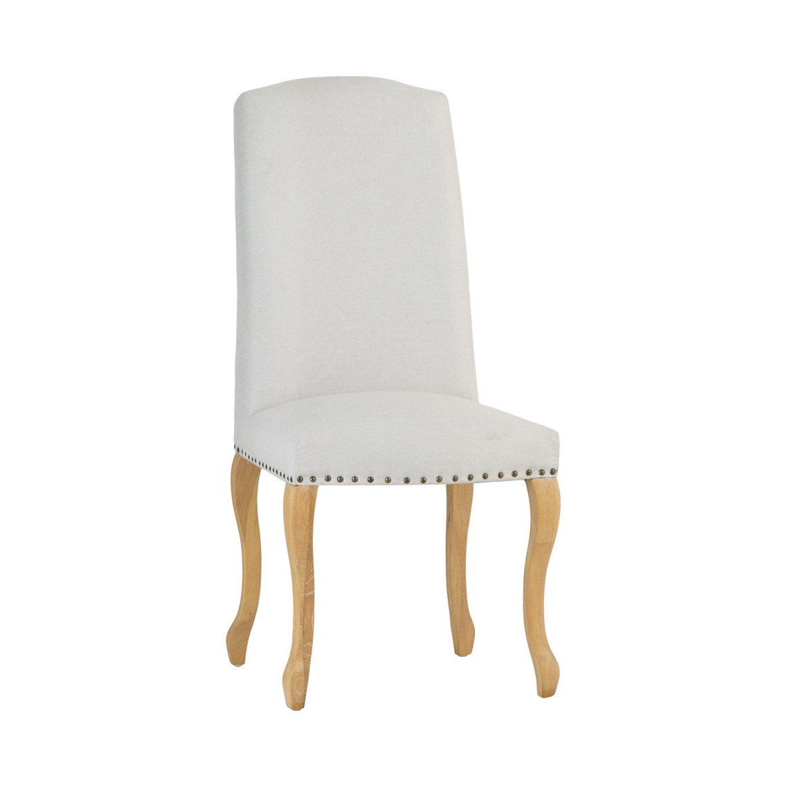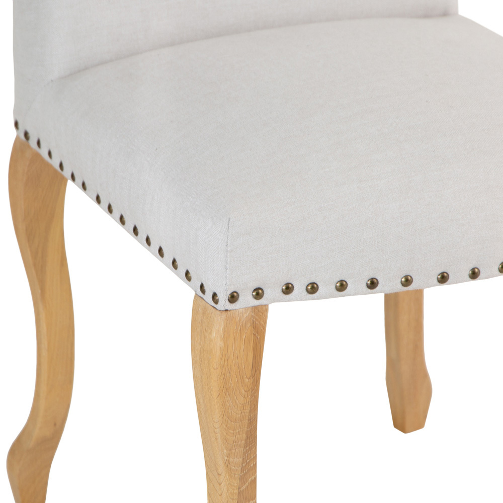 I love this chair for its timeless elegance and versatility. The neutral toned upholstery makes it easy to combine with both classic and contemporary interior schemes, while the studs add just a touch of subtle detail that elevates its aesthetic. It works particularly well in traditional or country-style interiors, but can also bring warmth and texture to modern spaces when paired with sleek dining tables. Practical styling tips include layering with textured table runners or place settings in contrasting colours to create visual interest, and incorporating complementary furnishings like light wood or neutral-toned accessories to maintain a cohesive look. This piece offers both comfort and style, making it a practical yet refined choice for any dining area.