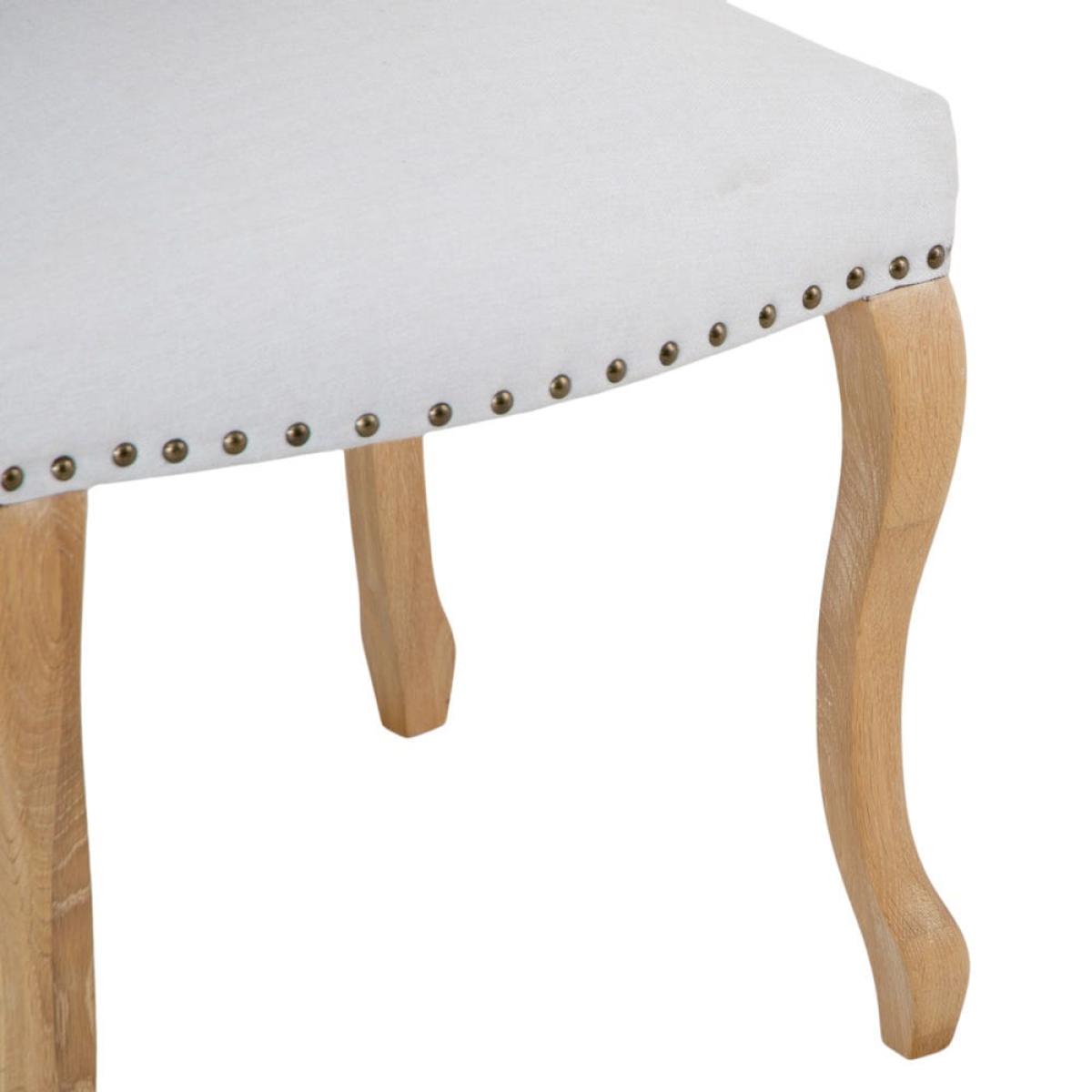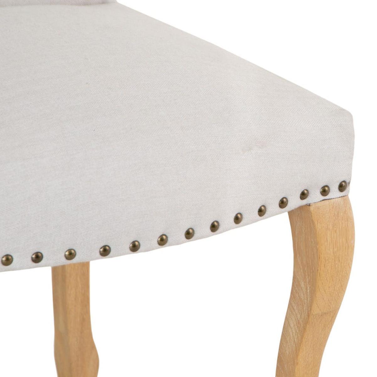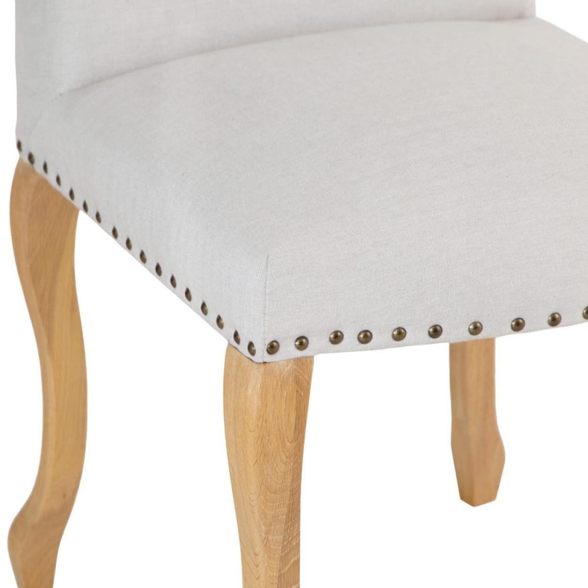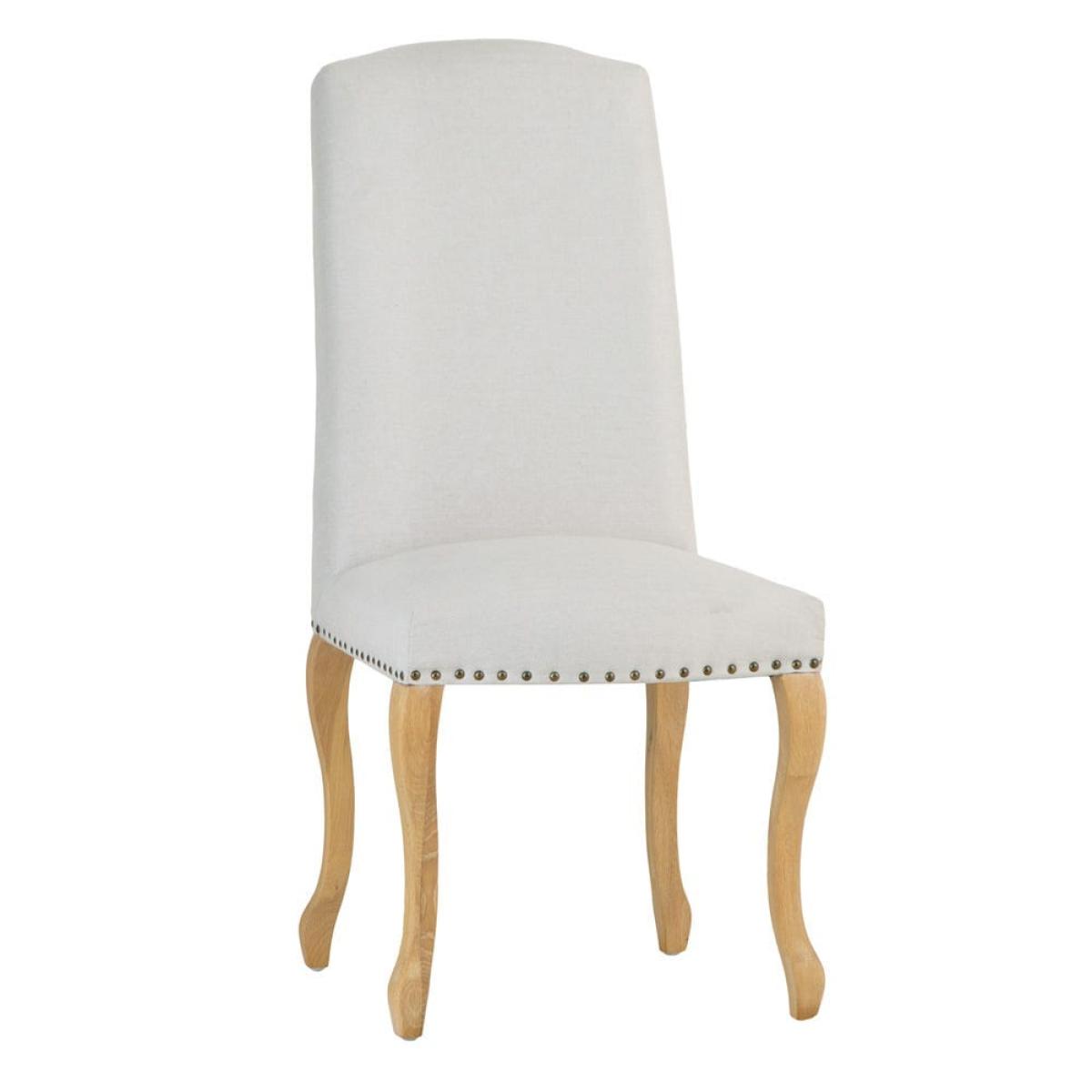 Bring instant elegance to your dining space with this Lucerne natural luxury dining chair with studs. The creamy upholstery fabric enhances any style of table and home, and a clutch of classic details add traditional charm. The base of the seat features metal studding for texture and style, and the solid oak legs are gently bowed to form a shapely quartet. The tall seat back curves slightly for comfort and support. This chair has ample padding to keep you sitting in comfort as well as style. Its eye-catching looks and soft finish suit a living room or bedroom as well as your dining table.