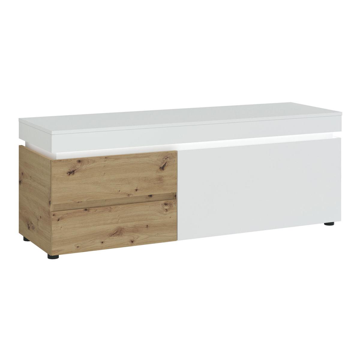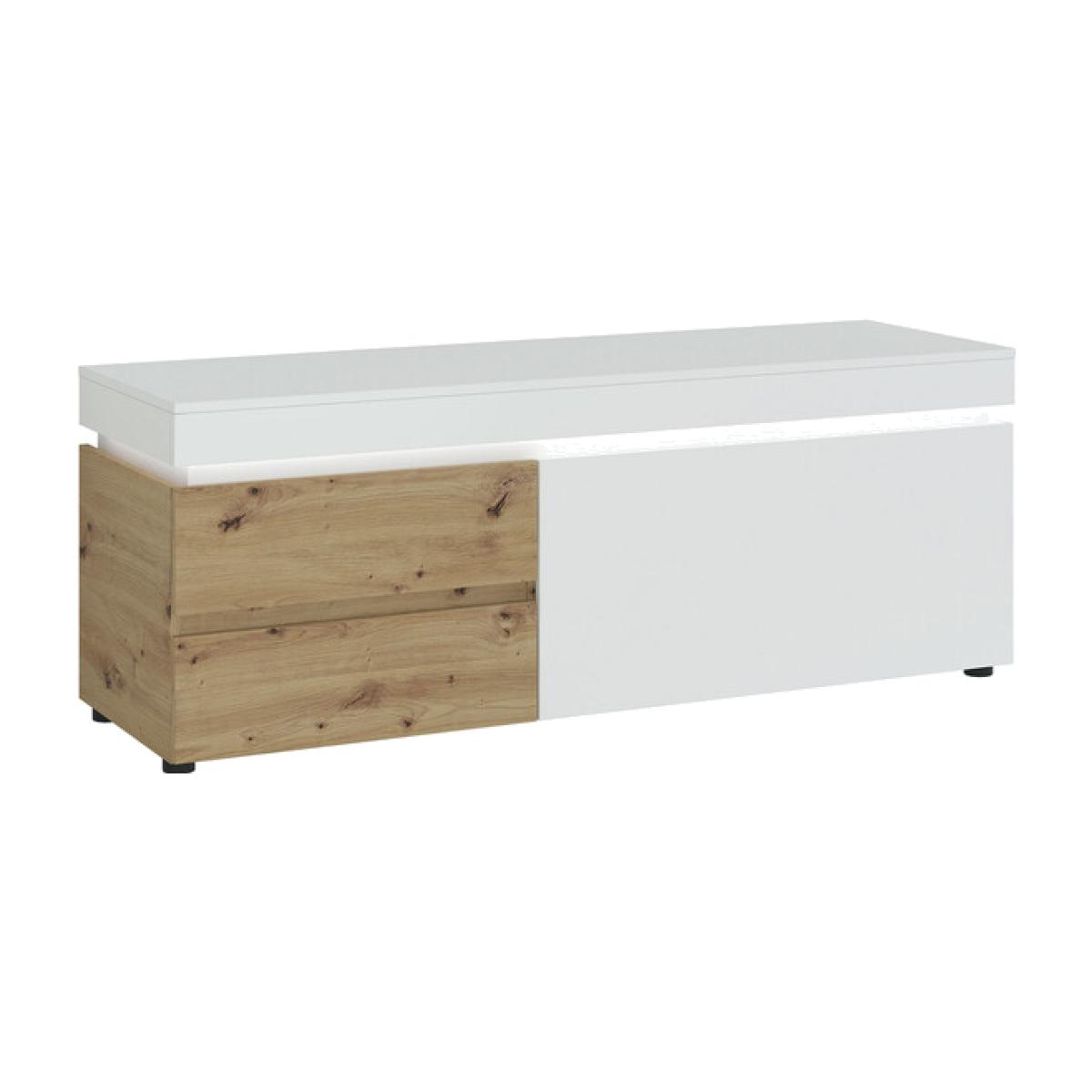 This practical Luci 1-Door 2-Drawer TV Unit is an ideal solution for anyone looking for plenty of storage space. It features two roomy drawers and quite a bit of space hidden behind the white door. The tabletop will allow you to display your remotes, ornaments, and more for a touch of personal style. The timeless combination of monochrome colour and Artisan Oak will work in many interiors, and the geometric form of the furniture makes it unique. The fronts are equipped with soft-close hinges guaranteeing comfortable use.