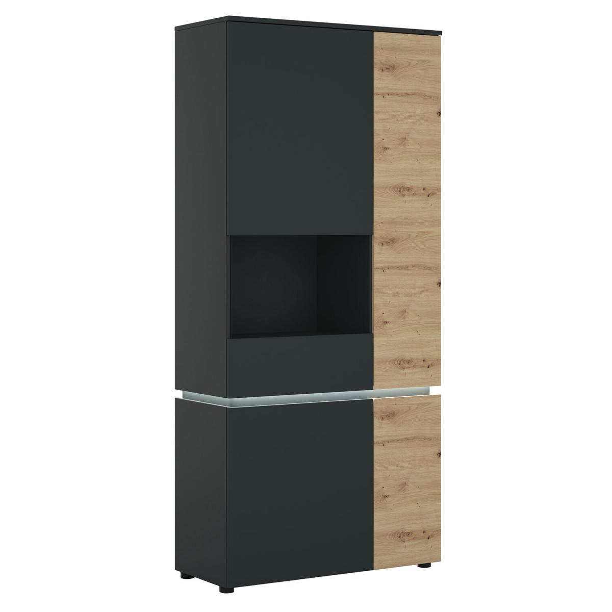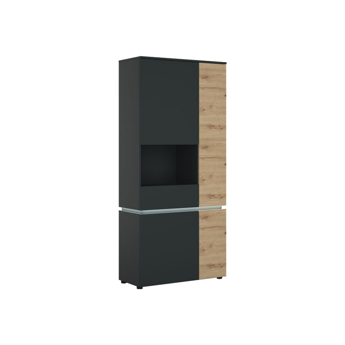 The tall black display cabinet with the wood-toned accent door offers a sleek, modern feel that works well in contemporary and minimalist interiors. I love how it combines function with style, providing valuable storage and display space without overwhelming the room. It’s versatile enough to sit in living rooms, kitchens, or home offices, especially when styling with a mix of decorative pieces, books, or curated collections. For practical styling tips, consider positioning it against a neutral wall to highlight its colour and textures, and use the open shelving to showcase statement accessories or plants. The left-hand door design lends itself well to asymmetrical styling, making the space feel thoughtful yet practical.