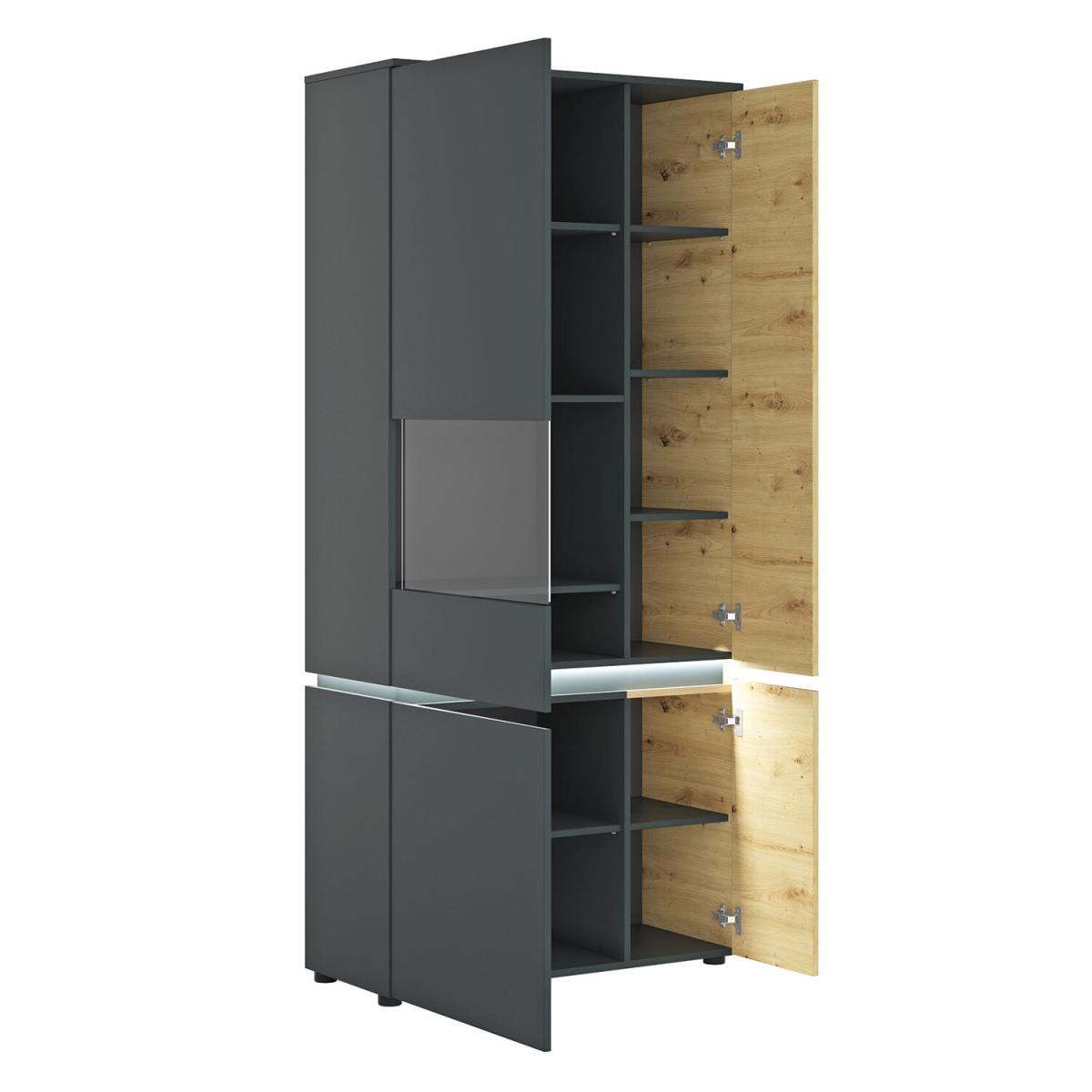 The Luci 4-Door Tall Display Cabinet features a glass panel and has a geometric feel and modern design, all of which combine to make your interior appear lighter. The inside of the vitrine has a lot of storage space and features room behind the glass, where you can display interesting accessories and highlight their charm with optional lighting (sold separately). The piece features an ergonomic handleless solution, soft-close accessories and tempered glass.