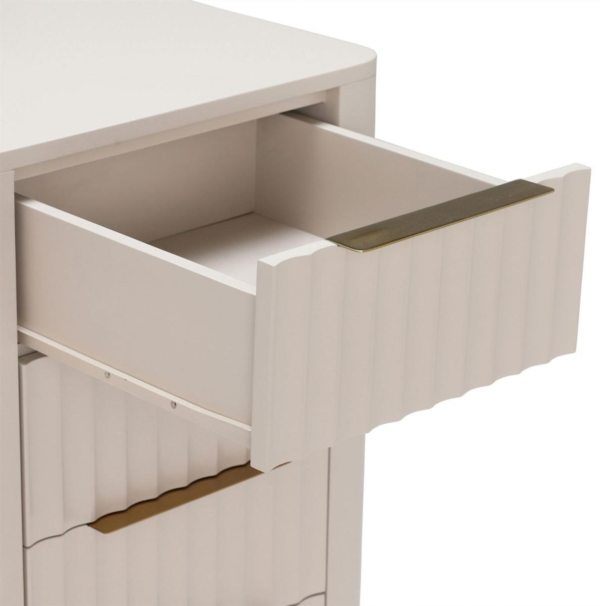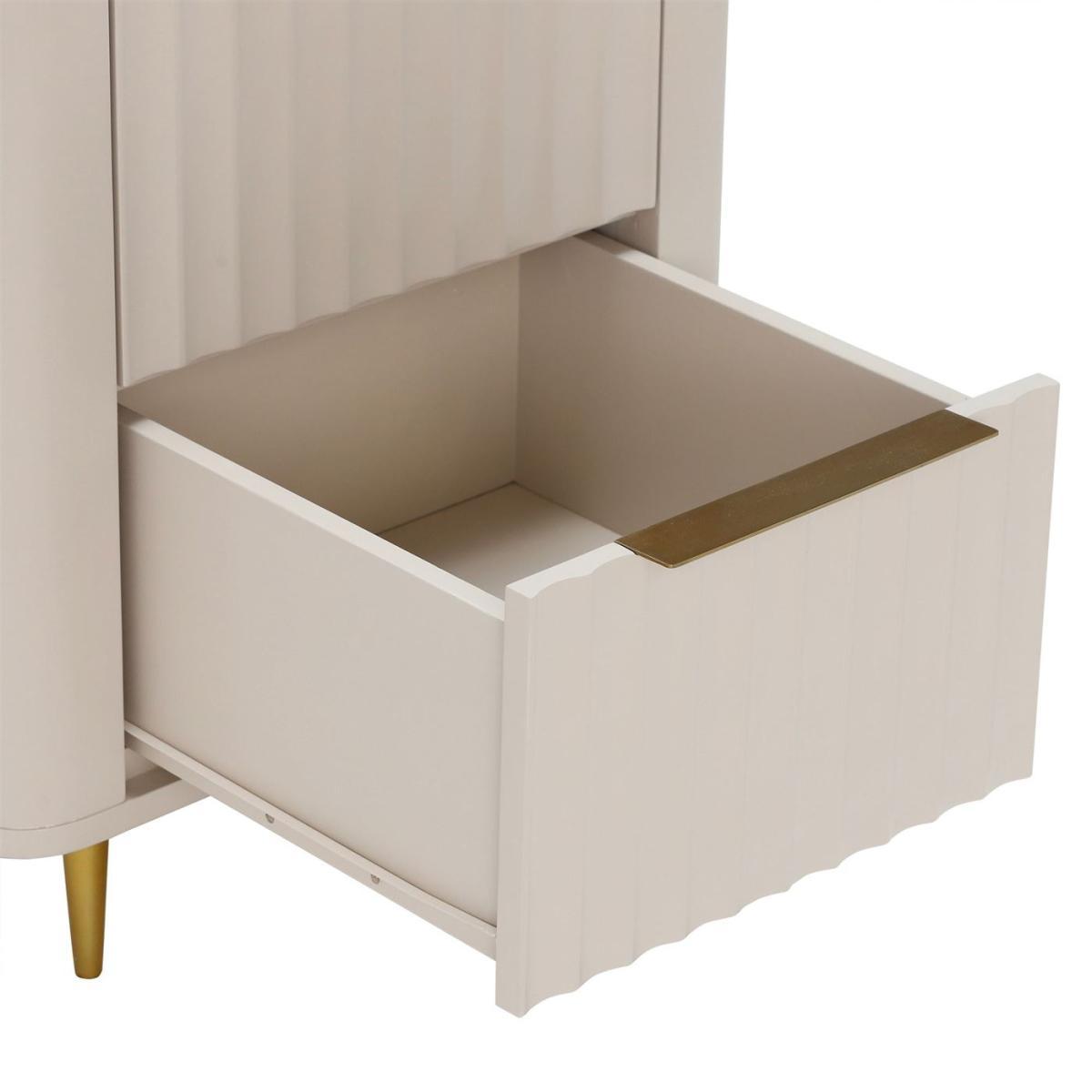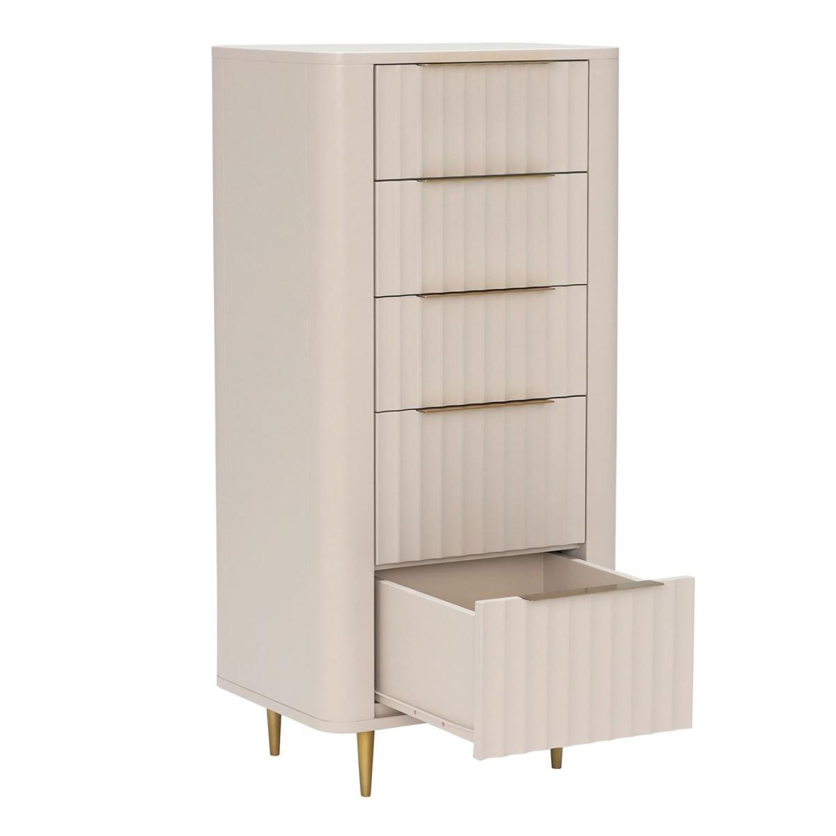 Design. Ensure your bedroom is kept neat and tidy with the Lucia 5 Drawer Tall Chest. The curve detailing to each drawer gives it a contemporary finish, offset with brass metal handles and feet to keep with the modern classic theme. The Lucia 5 Drawer Chest can be paired with the Lucia 2 Door Wardrobe for even further storage options and a unified look.