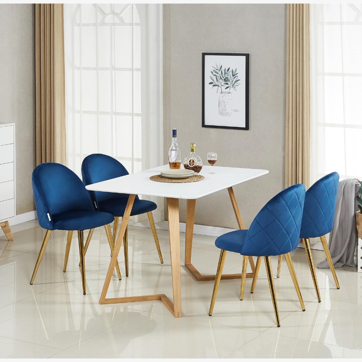 The dining set includes the Dallas table that is simplistic and has a versatile design with a twist! The legs provide not just sturdy support but a stunning and unique design feature that will get your guests talking. The solid birch legs feature floor protectors to avoid scratching your floors, and the laminated table top is wipe-clean with a subtle satin sheen. The Luciana Velvet dining chairs are crafted with careful attention to detail to provide a seat worthy. The Chairs feature a lush velvet finish, the quilted detail on the backrest, and the gentle taper of the legs. The Luciana is made with premium-quality materials, including wood-effect metal legs, to guarantee a durable chair suitable for everyday use. The design is elegantly simple, with a curved padded backrest offering comfortable support.
