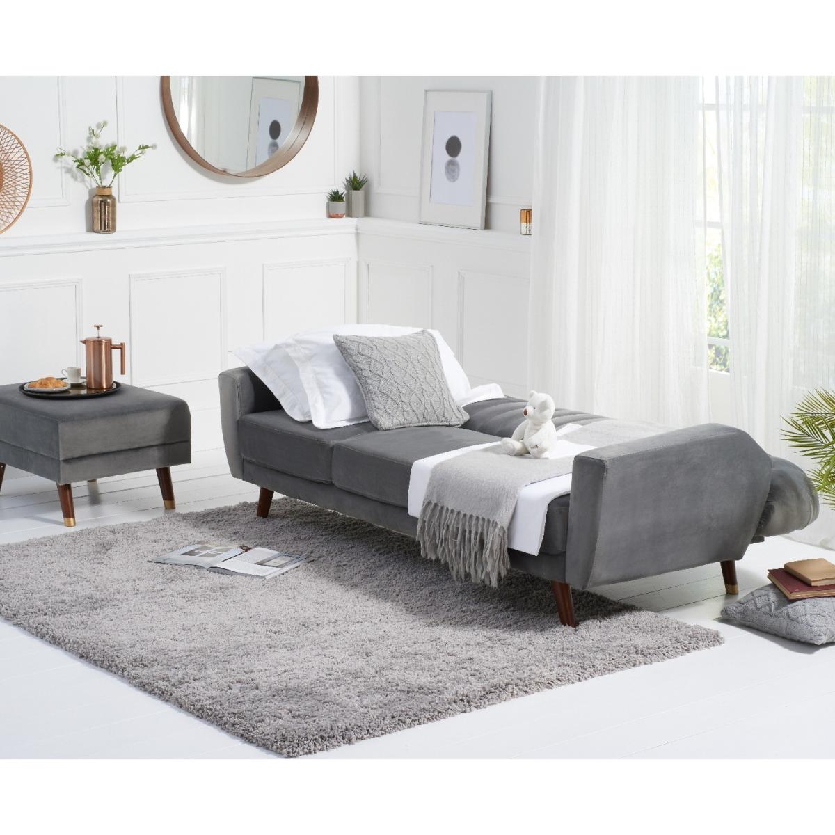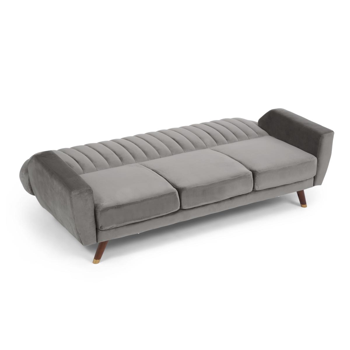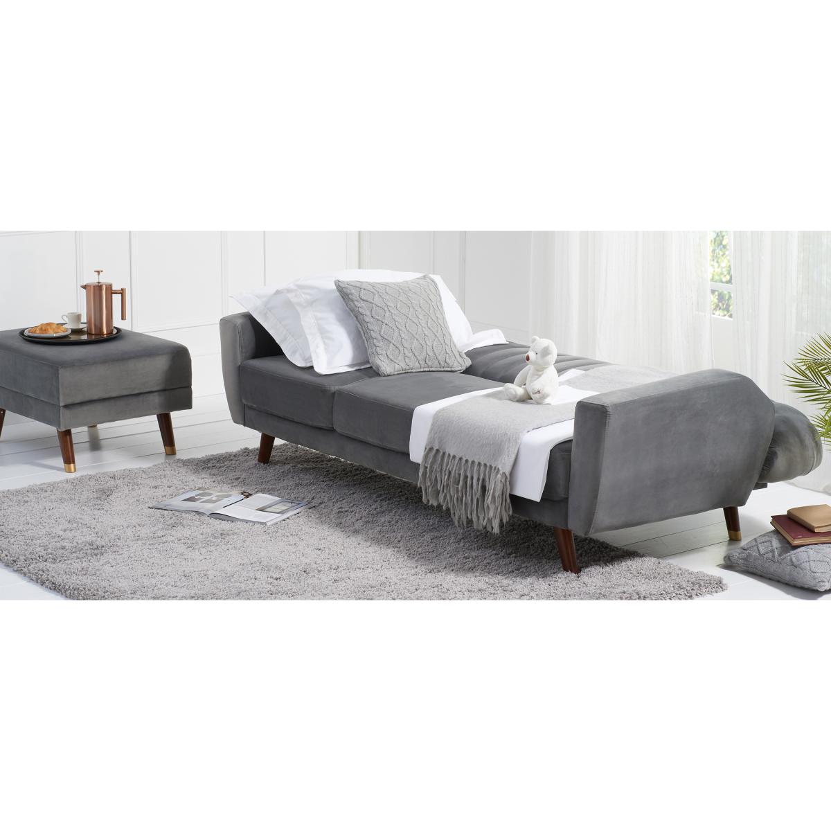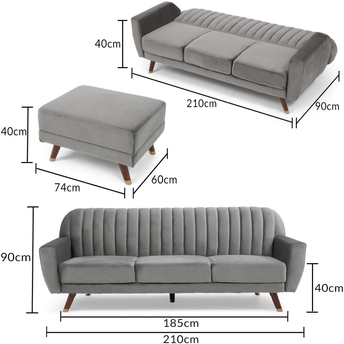 A stunning focal piece for your living room or spare room, the statement Velvet Lucia Sofa Bed in our lush Grey Velvet offers a striking lined design, curved edges, 3 plump and soft cushioned seats and a separate ottoman feature. Handily opening out into an additional bed, to then be effortlessly be hidden and stored again. Modern and eye-catching in design. Deep lines to the back add retro detailing. Upholstered in a lush, sumptuous Grey Velvet. Comes with an additional Velvet ottoman section. Opens out into a functional bed. Also available: Lucia Grey Linen Sofa Bed Additional Measurements:Seat Depth:55cm Seat Width: 185cm. Seat Height:15cm Armrest Width:15cm Backrest Height:50cm Floor to Seat Height:40cm Leg Thickness:5cm Chaise Depth:150cm. Chaise Cushion Depth:110cm