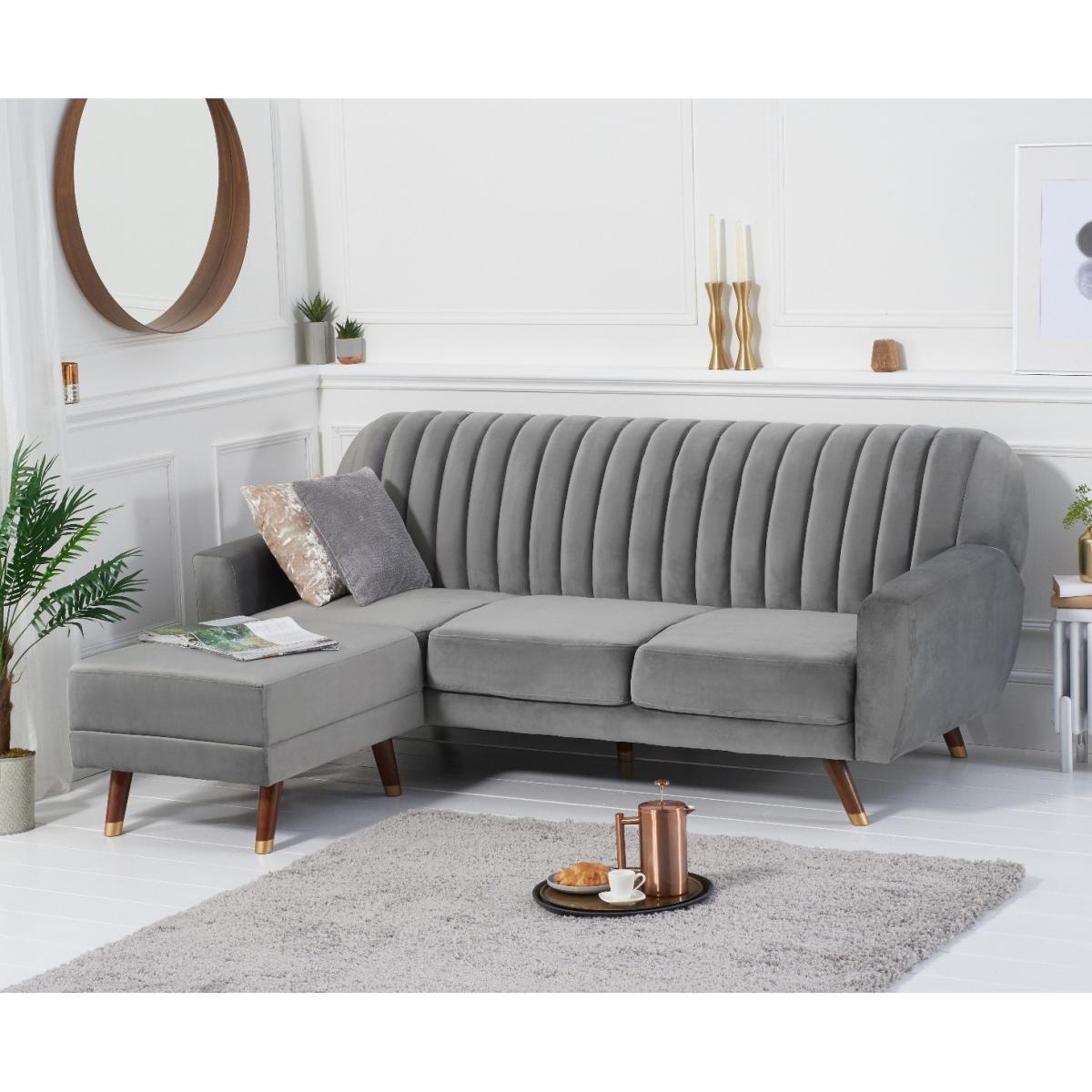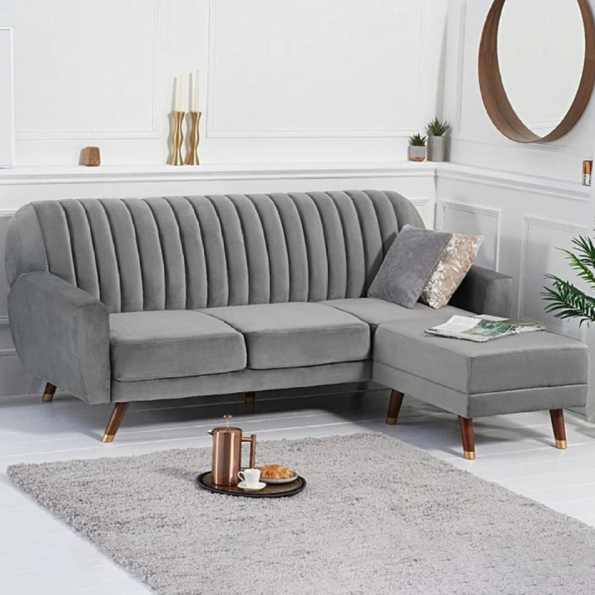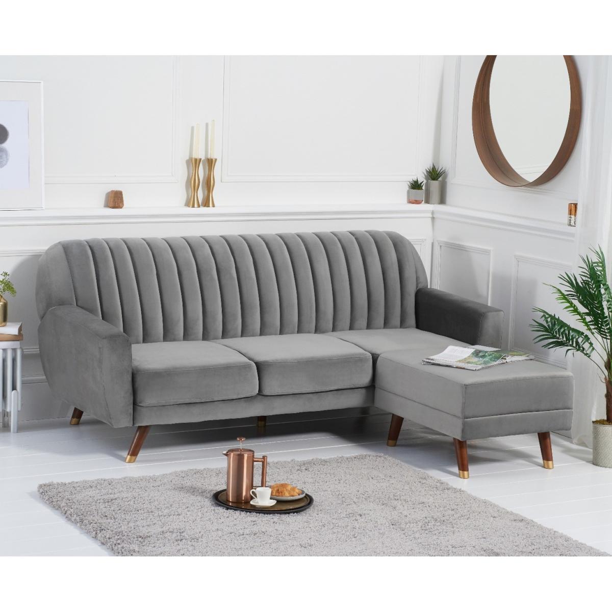 A stunning focal piece for your living room or spare room, the statement Velvet Lucia Sofa Bed in our lush Grey Velvet offers a striking lined design, curved edges, 3 plump and soft cushioned seats and a separate ottoman feature. Handily opening out into an additional bed, to then be effortlessly be hidden and stored again. Modern and eye-catching in design. Deep lines to the back add retro detailing. Upholstered in a lush, sumptuous Grey Velvet. Comes with an additional Velvet ottoman section. Opens out into a functional bed. Also available: Lucia Grey Linen Sofa Bed Additional Measurements:Seat Depth:55cm Seat Width: 185cm. Seat Height:15cm Armrest Width:15cm Backrest Height:50cm Floor to Seat Height:40cm Leg Thickness:5cm Chaise Depth:150cm. Chaise Cushion Depth:110cm