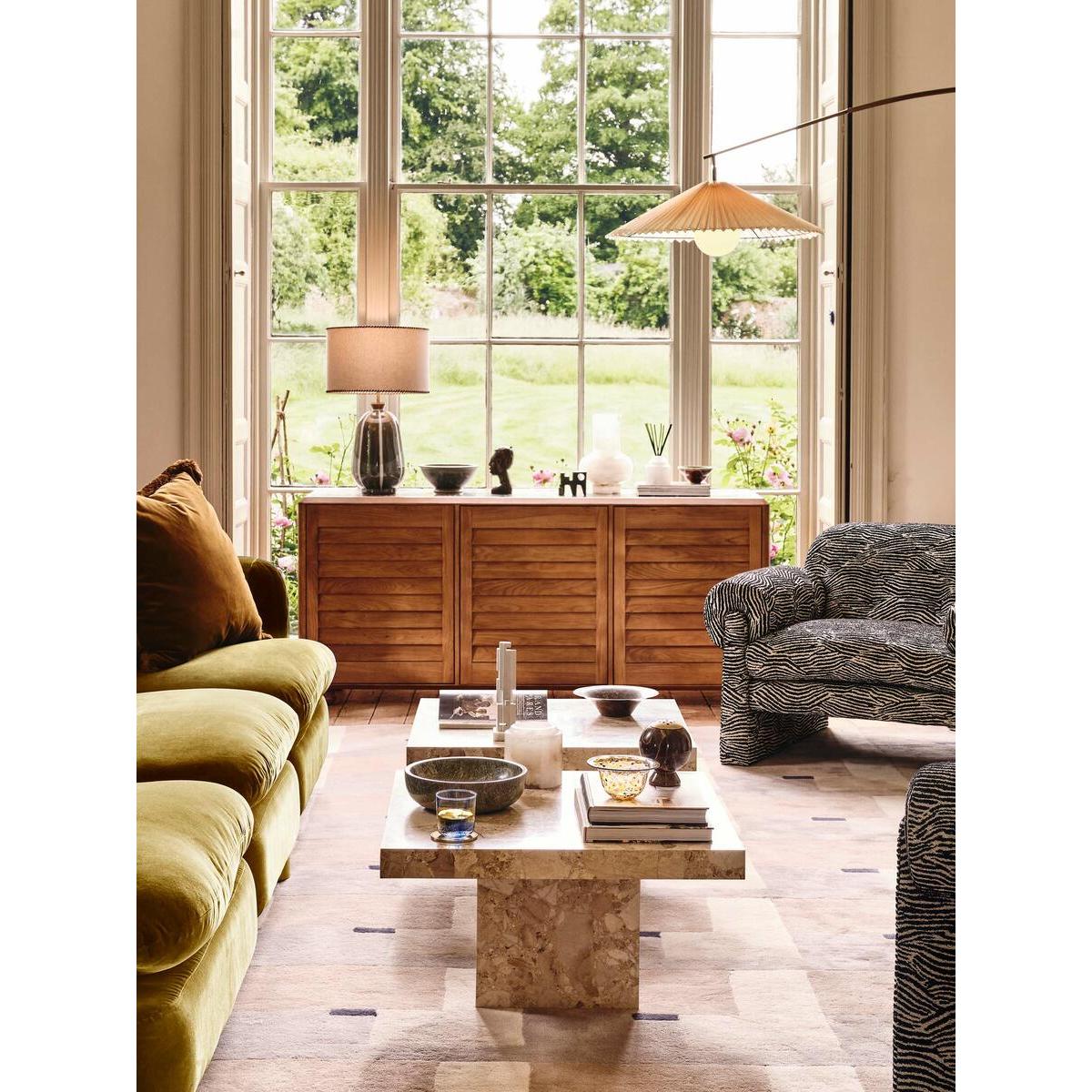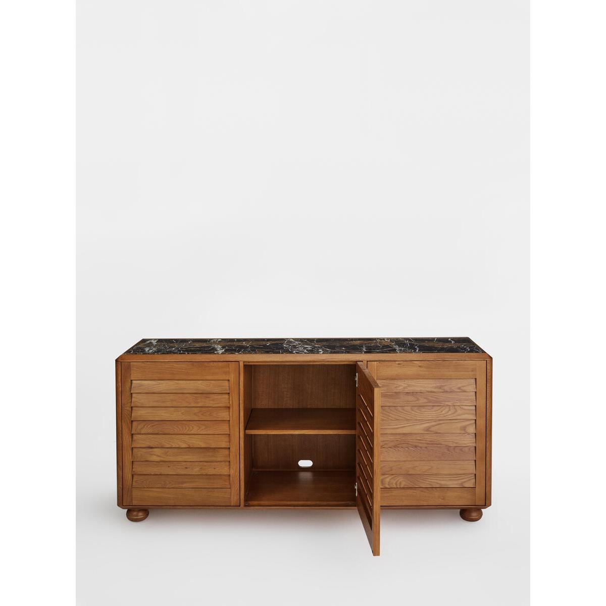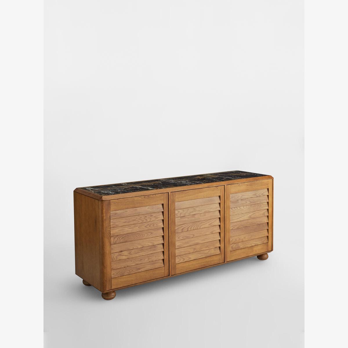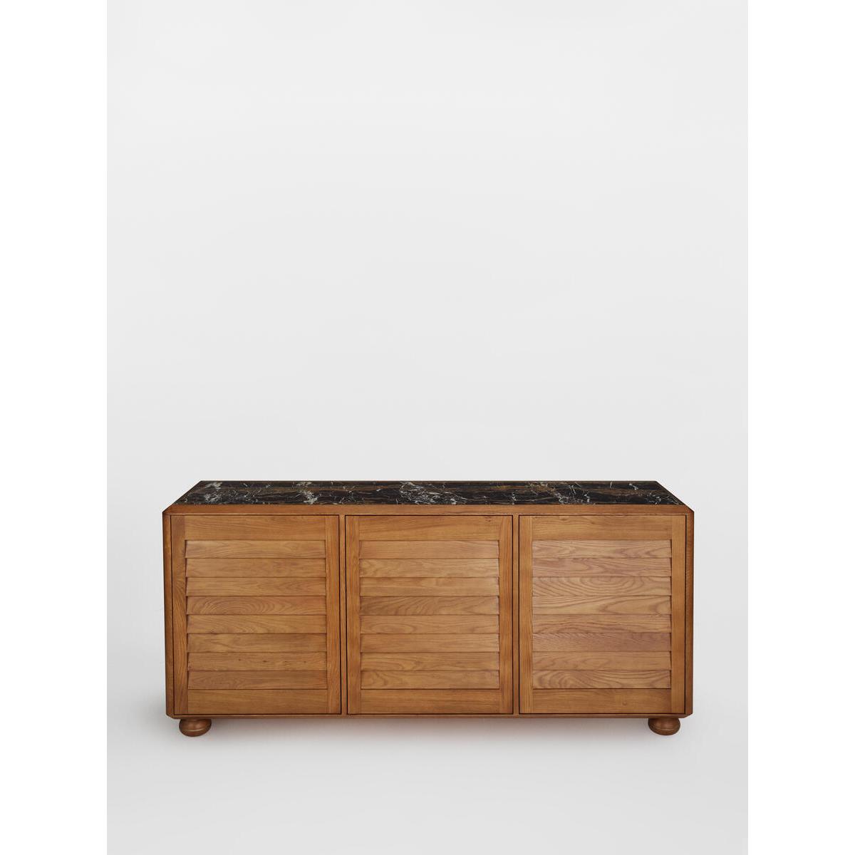 Characterised by a louvre slatted front, the oak Lucia sideboard takes its cues from Soho House Rome. Suitable for large living spaces or offices, it has hidden recessed handles, three doors, and a michelangelo marble inset top with a brass trim. The black marble can be found in the mountains of Balochistan, a province located in the south-west of Pakistan. The wooden bun legs are complete with brass rings in the centre. Oak and oak veneer sideboard Louvre slatted front Hidden recessed handles Three doors Michelangelo marble inset top Bun legs with brass ring in the centre Intense black background marble Gold features with white veining As seen on the counter top in Westbourne Grove Inspired by Soho House Rome