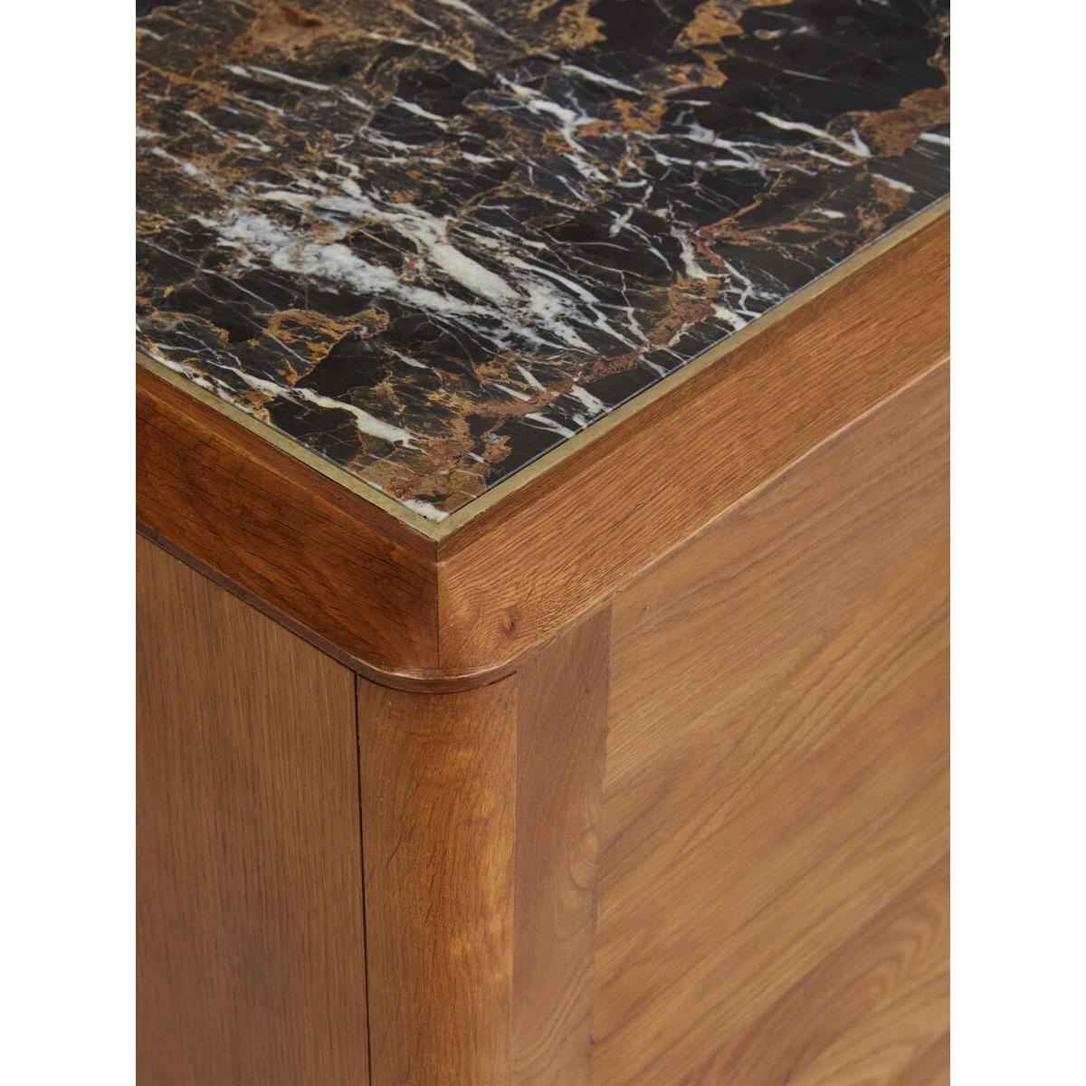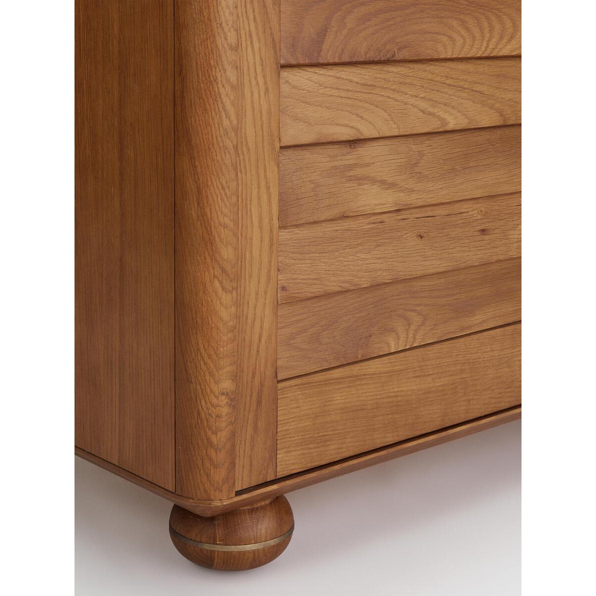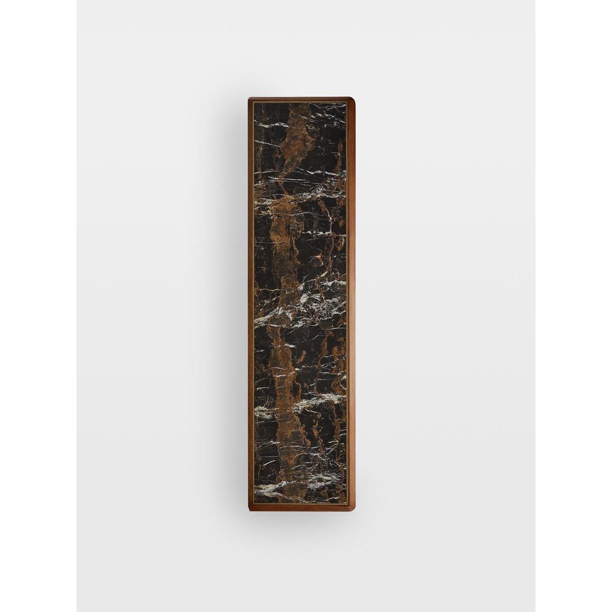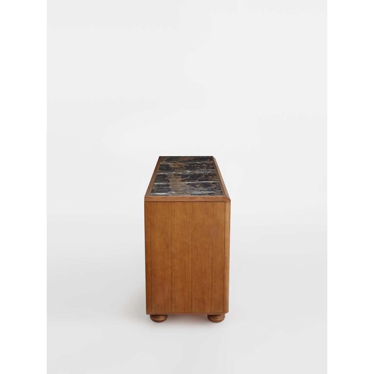 Characterised by a louvre slatted front, the oak Lucia sideboard takes its cues from Soho House Rome. Suitable for large living spaces or offices, it has hidden recessed handles, three doors, and a michelangelo marble inset top with a brass trim. The black marble can be found in the mountains of Balochistan, a province located in the south-west of Pakistan. The wooden bun legs are complete with brass rings in the centre. Oak and oak veneer sideboard Louvre slatted front Hidden recessed handles Three doors Michelangelo marble inset top Bun legs with brass ring in the centre Intense black background marble Gold features with white veining As seen on the counter top in Westbourne Grove Inspired by Soho House Rome