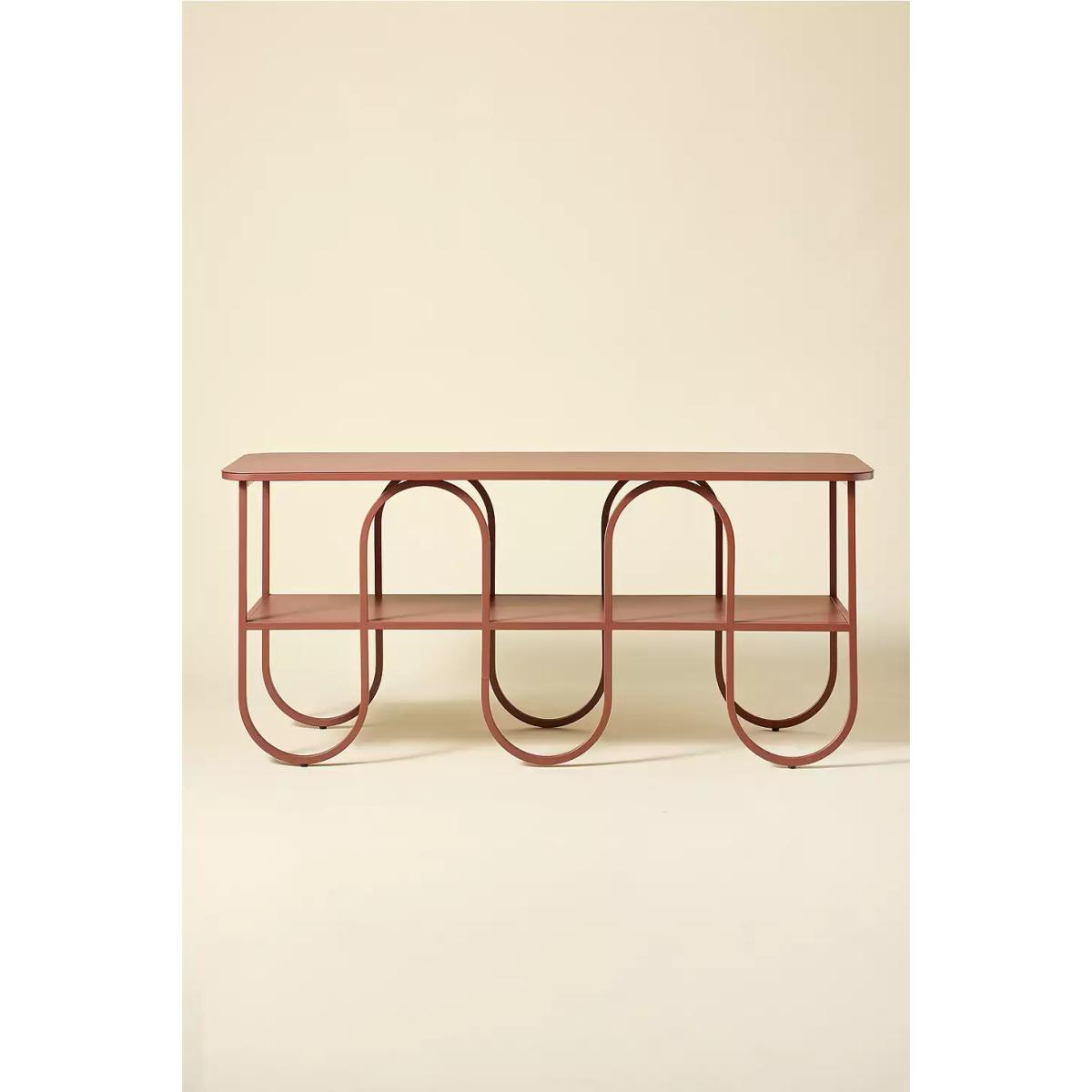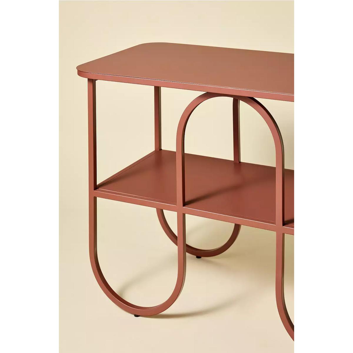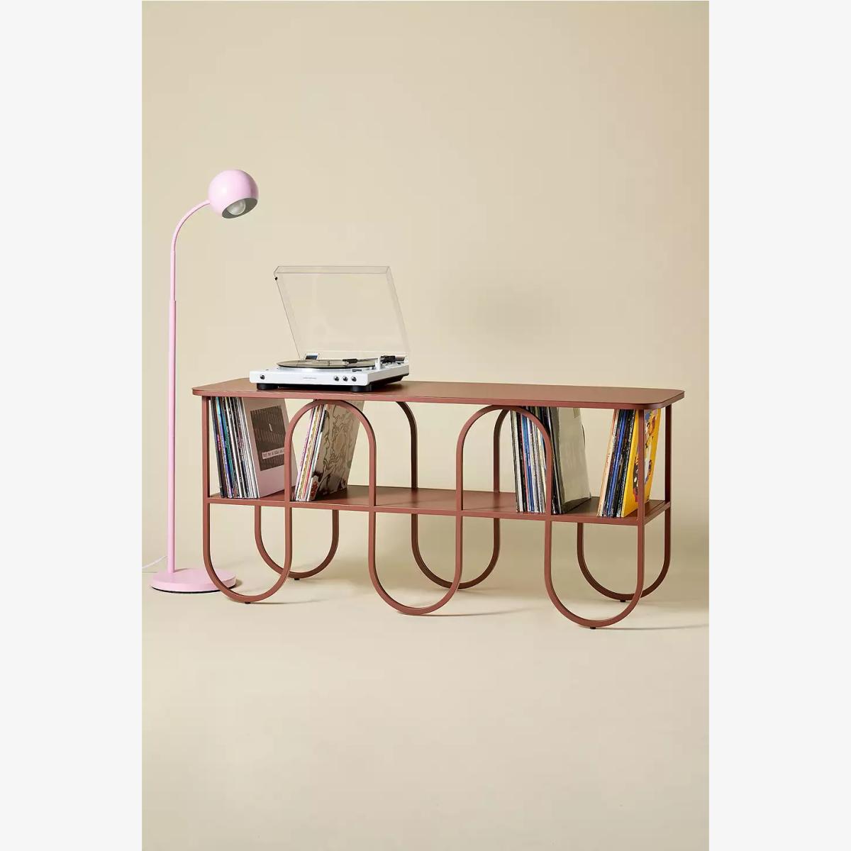 Create an artful display of your novels, gaming systems and vinyl library with this metal media storage console. Crafted from colorful, powder-coated iron, this tv stand features a duo of open and airy tiers with squiggled framing at the front and back. Available exclusively at Urban Outfitters. *Online return only. This item cannot be returned instore. Please note furniture items currently cannot be shipped to Northern Ireland or The Republic of Ireland. Delivery of large furniture items may take 1-2 weeks and are therefore not eligible for Next Day Delivery.* **Content + Care** \- Assembly required \- Iron \- Wipe clean **Size** \- Dimensions: D: 51cm W: 101.6cm H: 43.8cm