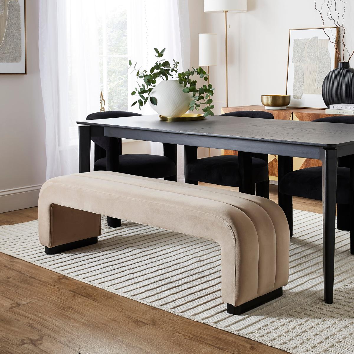 I love the Lucilla dining bench for its versatile, understated elegance and plush velvet finish, which adds a touch of luxury without feeling overly formal. It works particularly well in contemporary or modern interiors, especially when you want to introduce texture and soft furnishing elements. Practical styling tips include pairing it with a wooden or marble-topped dining table for a balanced look, or using it as a statement piece in a hallway or bedroom as extra seating or a place to lay items. The neutral velvet Mink colour makes it easy to coordinate within a range of colour schemes, while its streamlined design ensures it blends seamlessly into both minimalist and more eclectic settings.