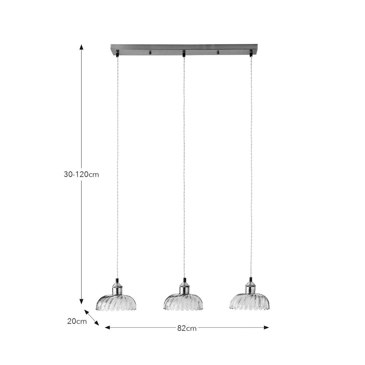 * Beautiful, Eye-Catching Design* Three Floriated Glass Shades* Height Adjustable - Tailored Ambience* Requires: E14 Cap Type & Globe Bulbs Striking in design and perfect as a centrepiece, the Lucille 3 Light Adjustable Diner Ceiling Light features beautiful floriated glass shades, each suspended from adjustable twisted flexes.