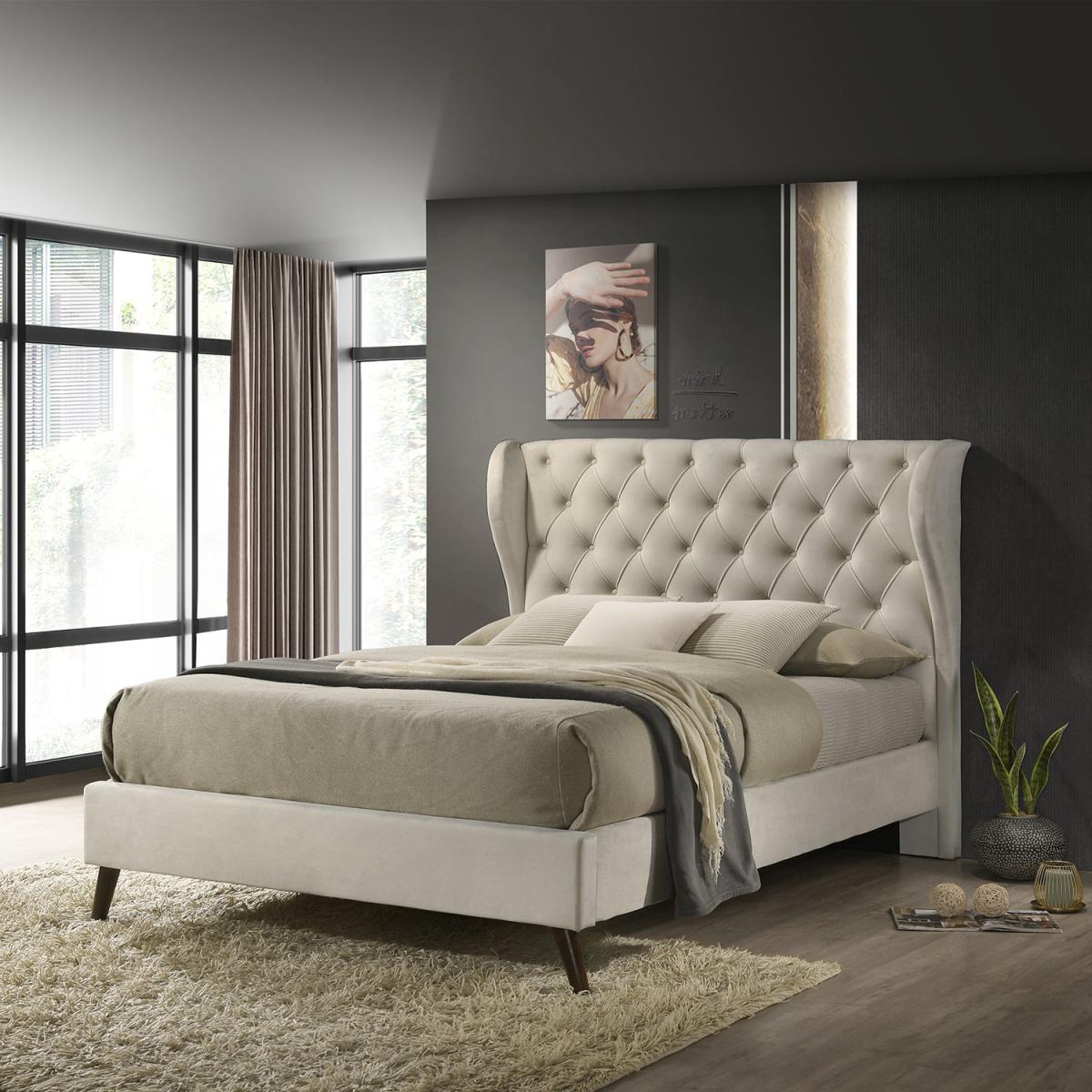 The Lucille Bedframe oozes modern sophistication. Its smooth velvet upholstery and diamond detailing combine with the angled feet and curved headboard to create an elegant design. Traditionally sophisticated, this bed uses button detailing and sleek curves to introduce a statement feature to any bedroom, while the neutral colouring keeps it on trend and maintains your chic aesthetic.