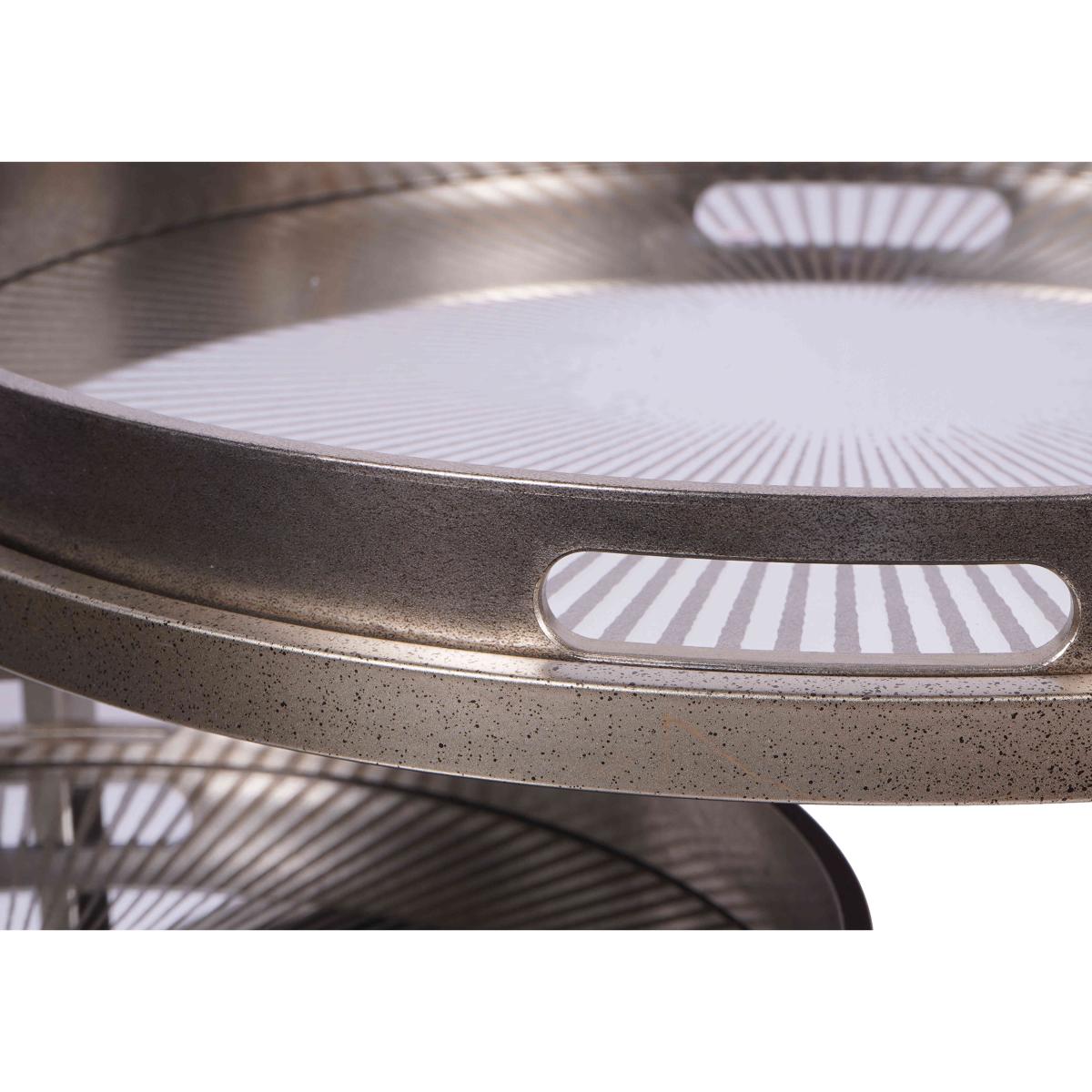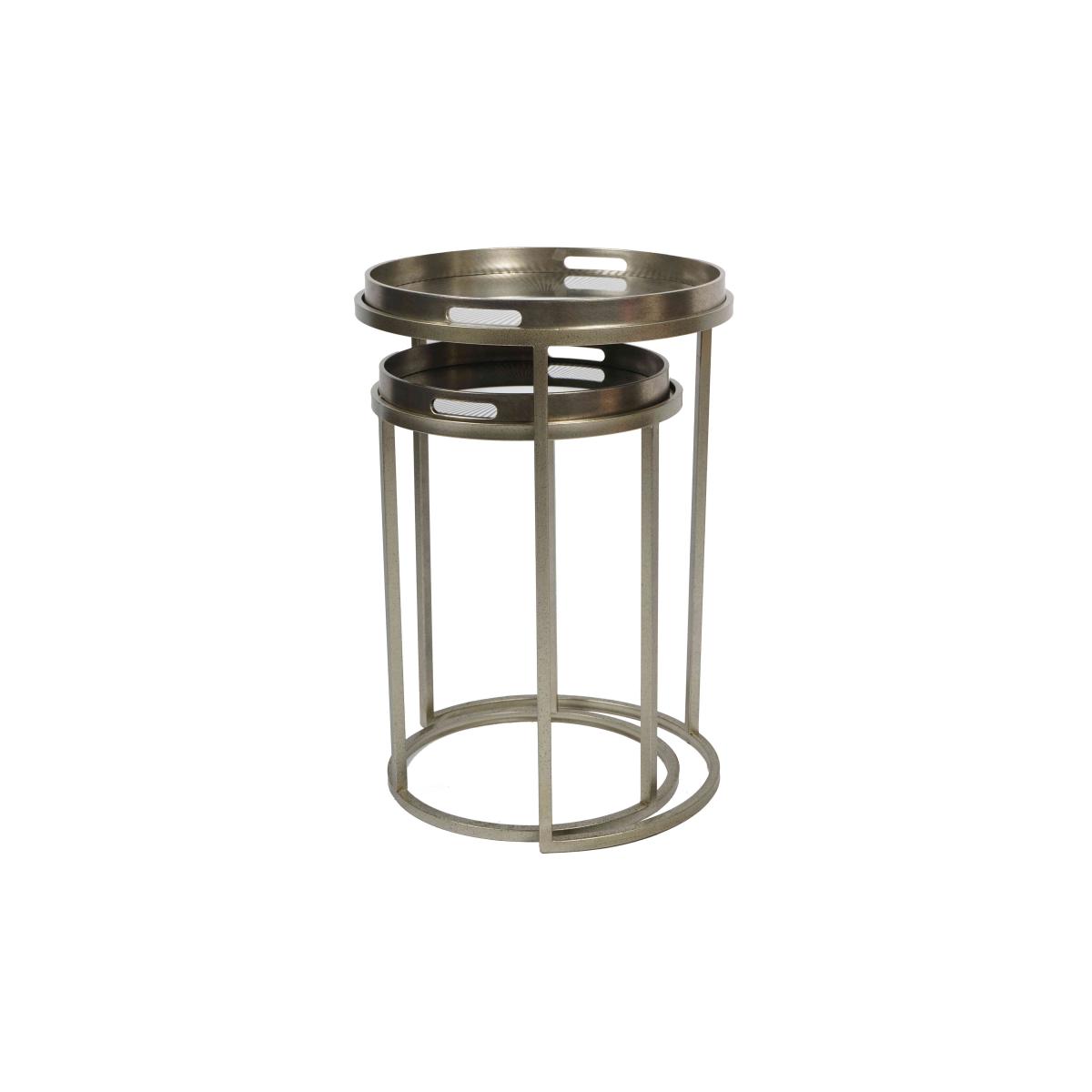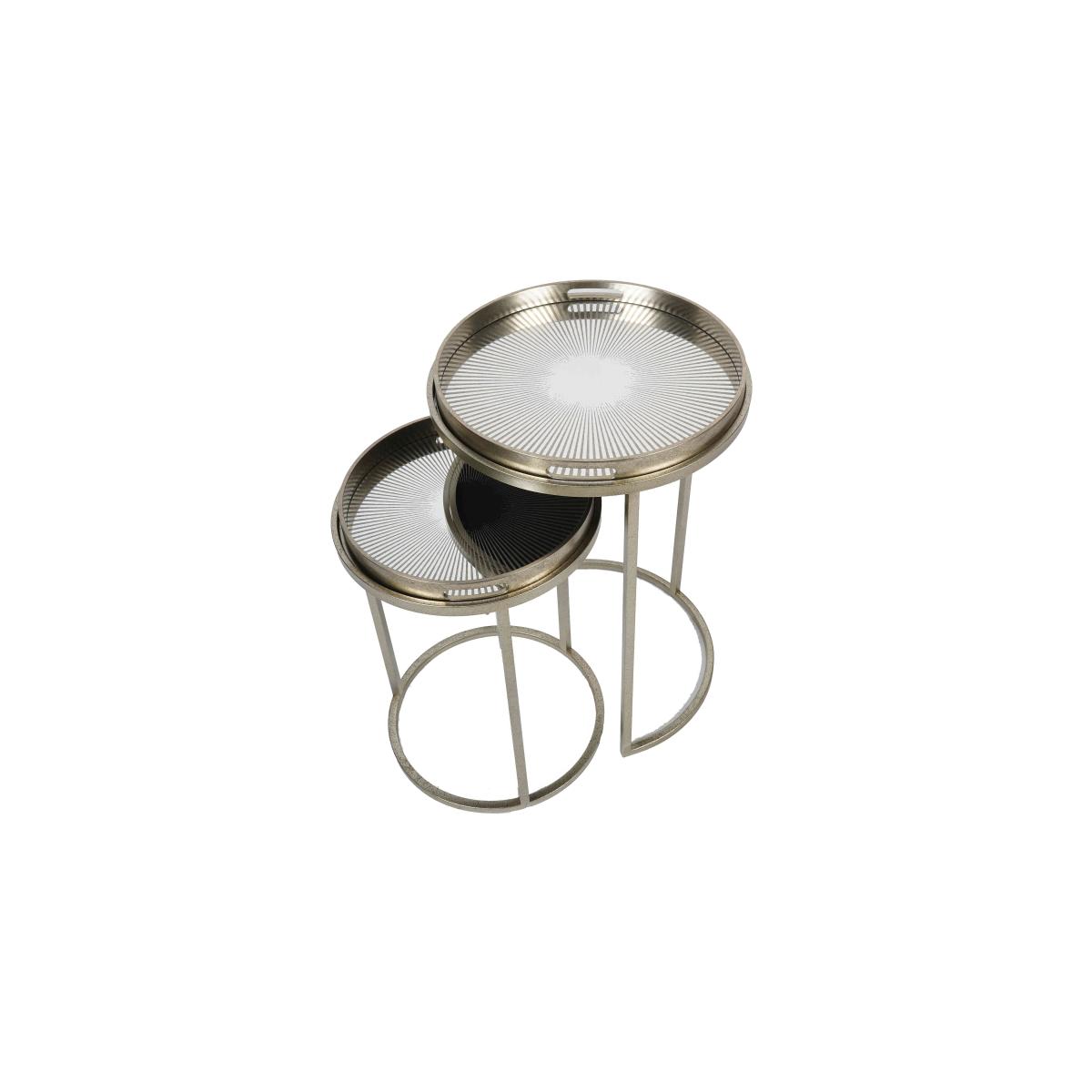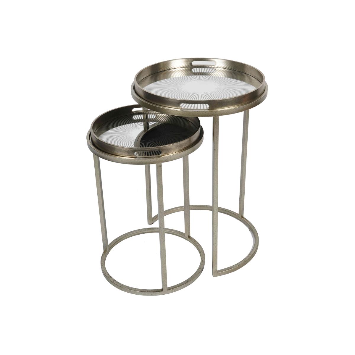 Beauty, functionality and unique charm – our Lucille set of two side tables has it all. Tables have removable tray tops which feature a striking starburst designs. Why you'll love it Our Lucille set of 2 side tables is practical as well as beautiful. Understated glam style. Each side table in the set has a removable tray top. Tray tops have elegant sunburst patterns. The lightly distressed, antiqued gold-effect rims are hand-finished. Tray rims have integrated handles for ease of use. The Lucille set of 2 tray tables is exclusively available at Furniture Village. What you need to know Table tray tops are made with metal and glass. Tables have iron frames. For indoor use only. Item code:LUC-2TBL--001