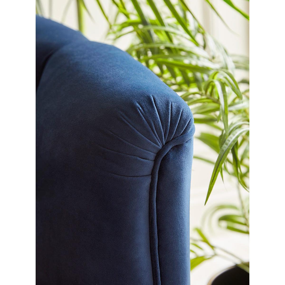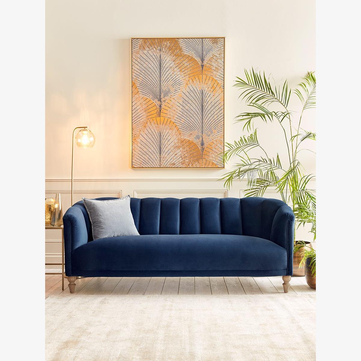 Art Deco styling with welcoming 21st century proportions makes our new made to order Lucille range as comfortable as it is stylish. The deep fluted panels which form the back and sides of this elegant three seater sofa are a hallmark of the range and create a sculpted look with a feminine appeal. The smooth line from backrest to arm ends in a hand pleated finish indicative of the premium quality of this handcrafted collection. Statement turned hardwood legs complete the look. Shown here in Navy Velvet, our Lucille range can be upholstered in a choice of 9 distinctive shades and two fabrics to suit your style; an armchair and an ottoman are also available. Order your free fabric swatch here. Linen Blend. The classic choice for well designed, handcrafted furniture, a highly durable yet elegant 60% cotton, 40% linen plain weave that showcases form with a wonderfully soft brushed finish. Easy Care Velvet A highly durable polyester fabric despite its luxurious appearance, Easy Care Velvet is well suited to busy homes, it comes with an outstanding richness of tone and the familiar soft hand feel of velvet.