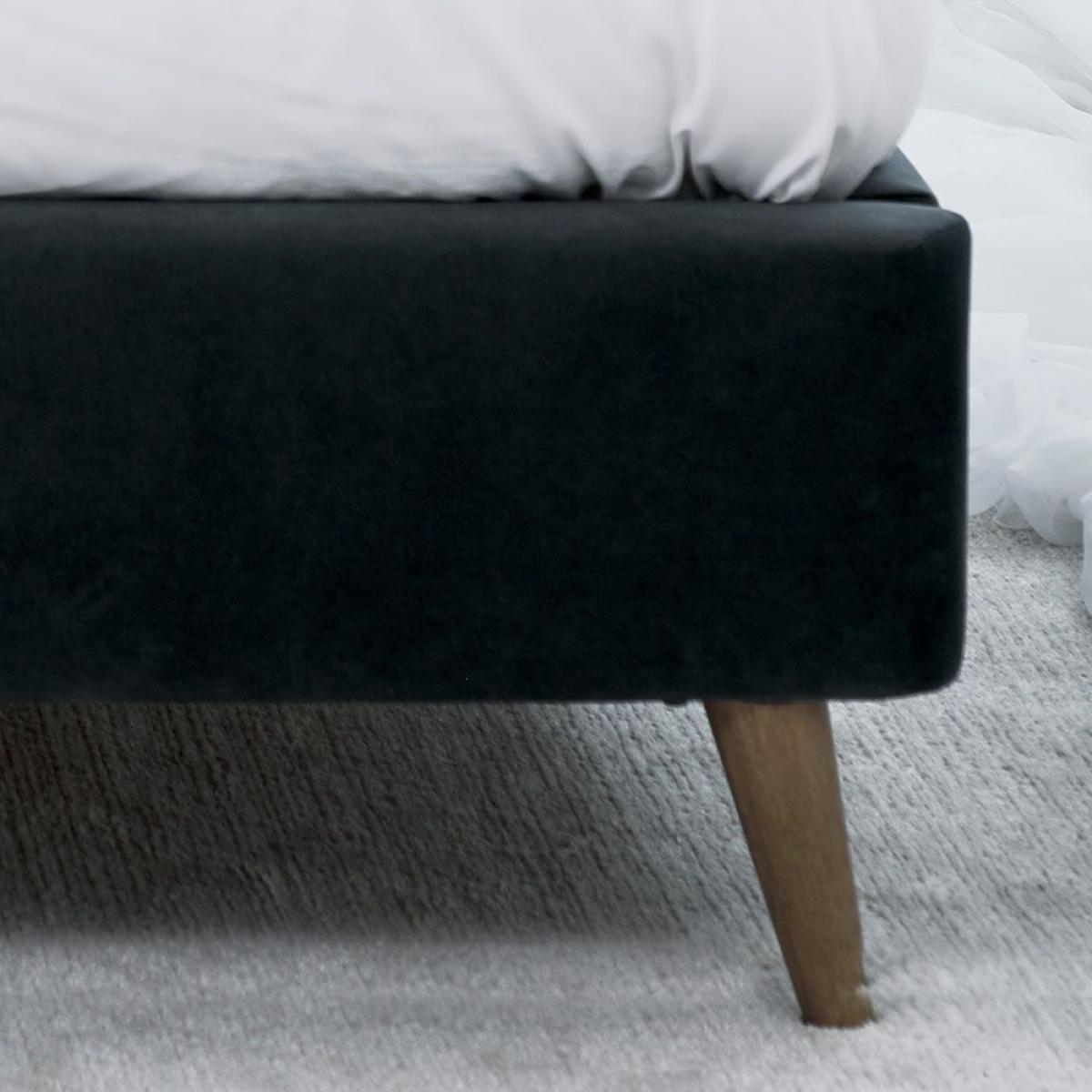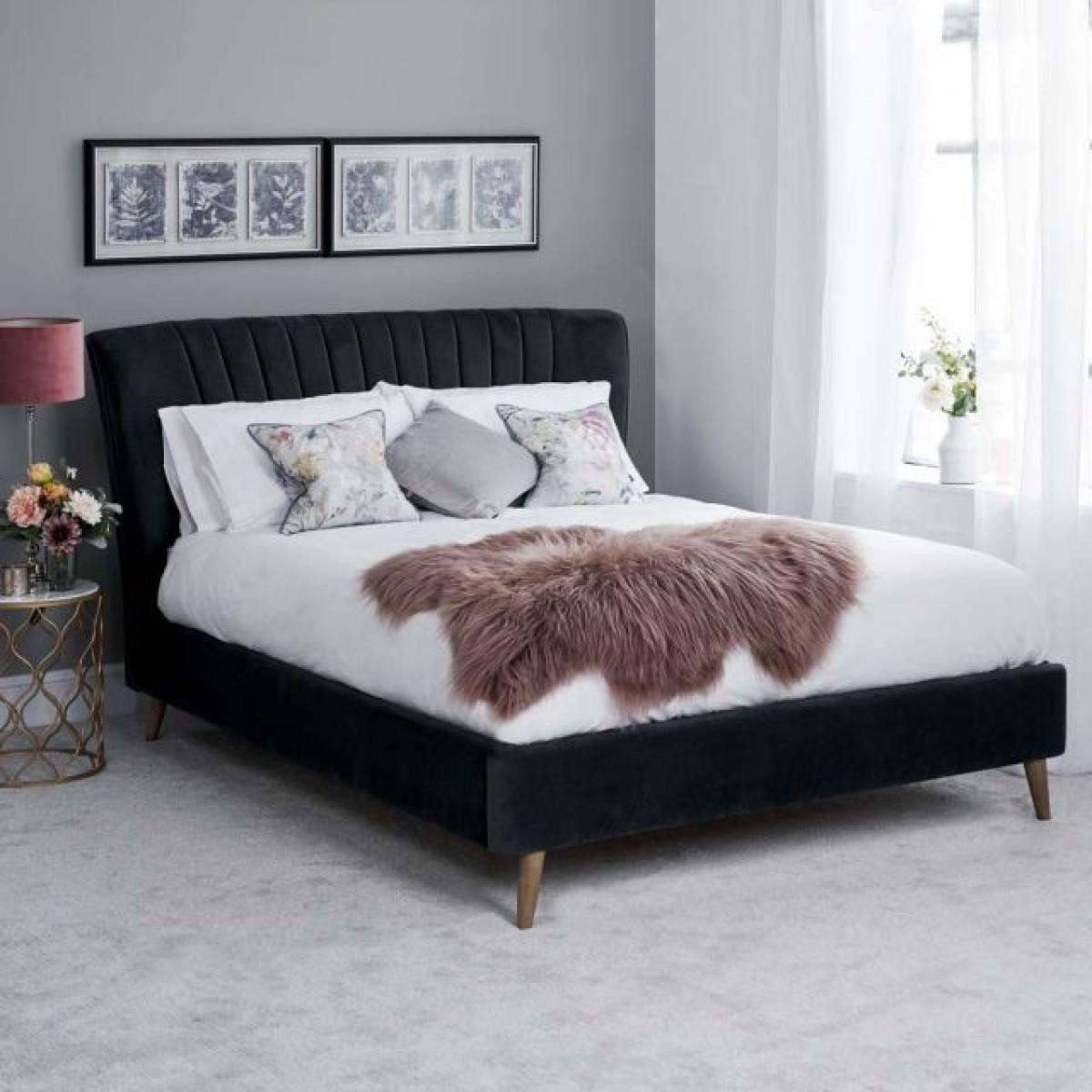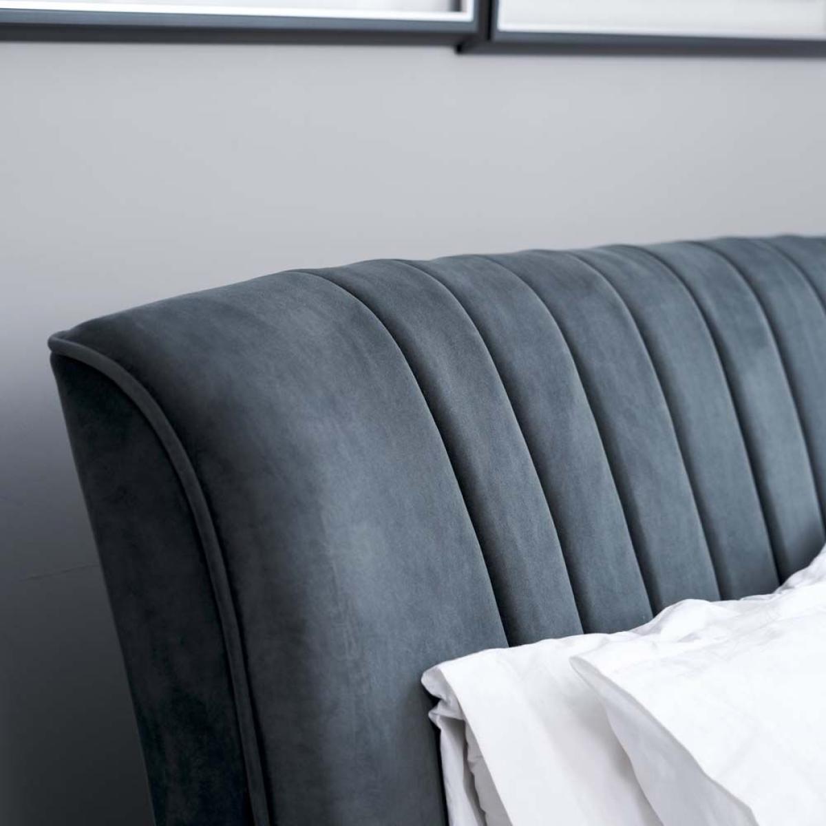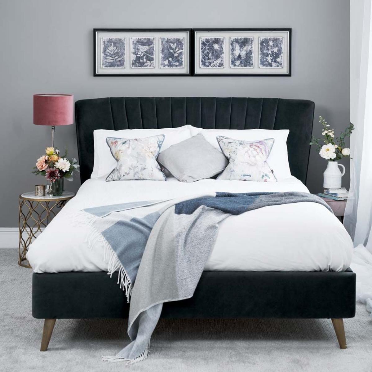 The Lucille velvet bedframe in a gorgeous dark grey is a features a classic scalloped headboard with exquisite stitching and soft velvet upholstery. The frame is fully upholstered on both siderails and footend and comes ready to assemble with an easy-fit slatted base which is held in place with velcro strips. This bed is perfect for those lazy mornings with the Sunday papers.