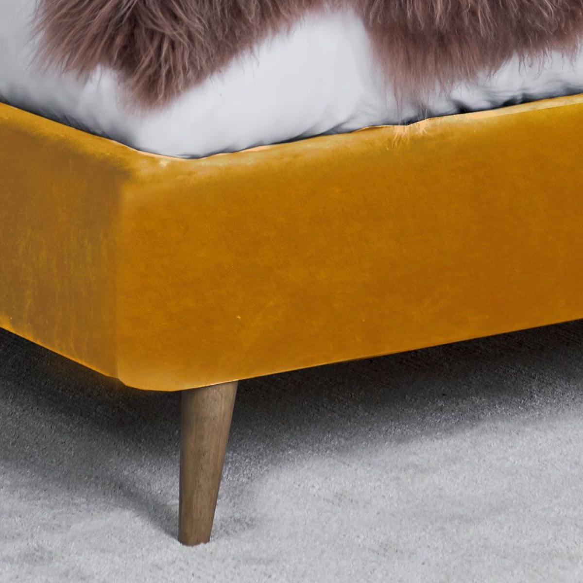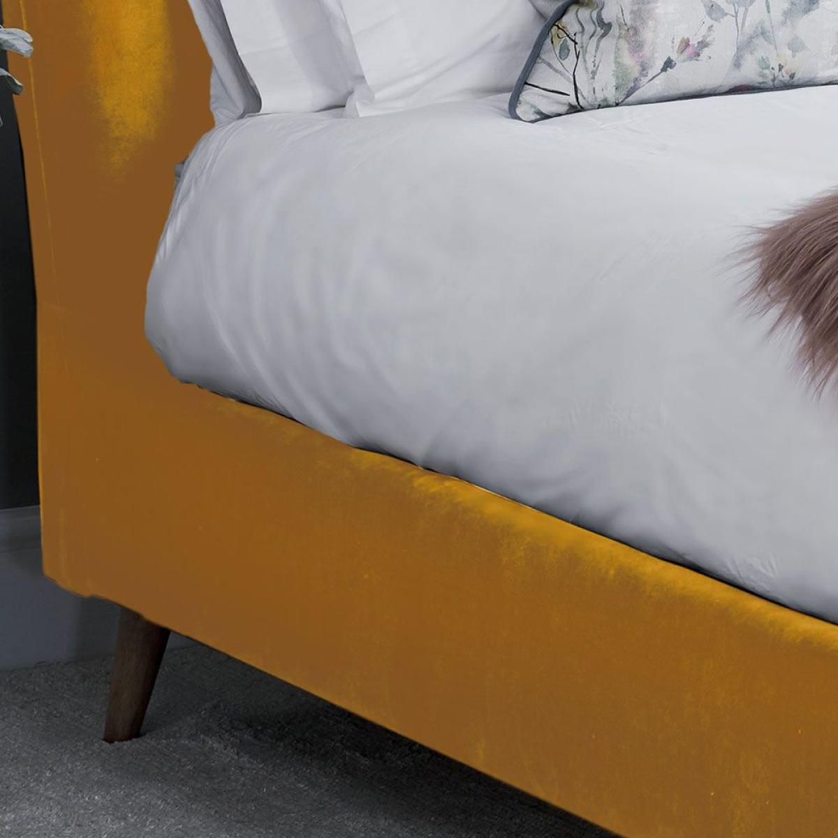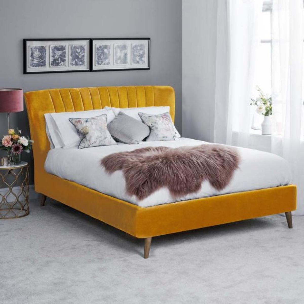 The Lucille velvet bedframe in this vibrant mustard features a classic scalloped headboard with exquisite stitching and soft velvet upholstery. The frame is fully upholstered on both siderails and footend and comes ready to assemble with an easy-fit slatted base which is held in place with velcro strips. This bed is perfect for those lazy mornings with the Sunday papers.