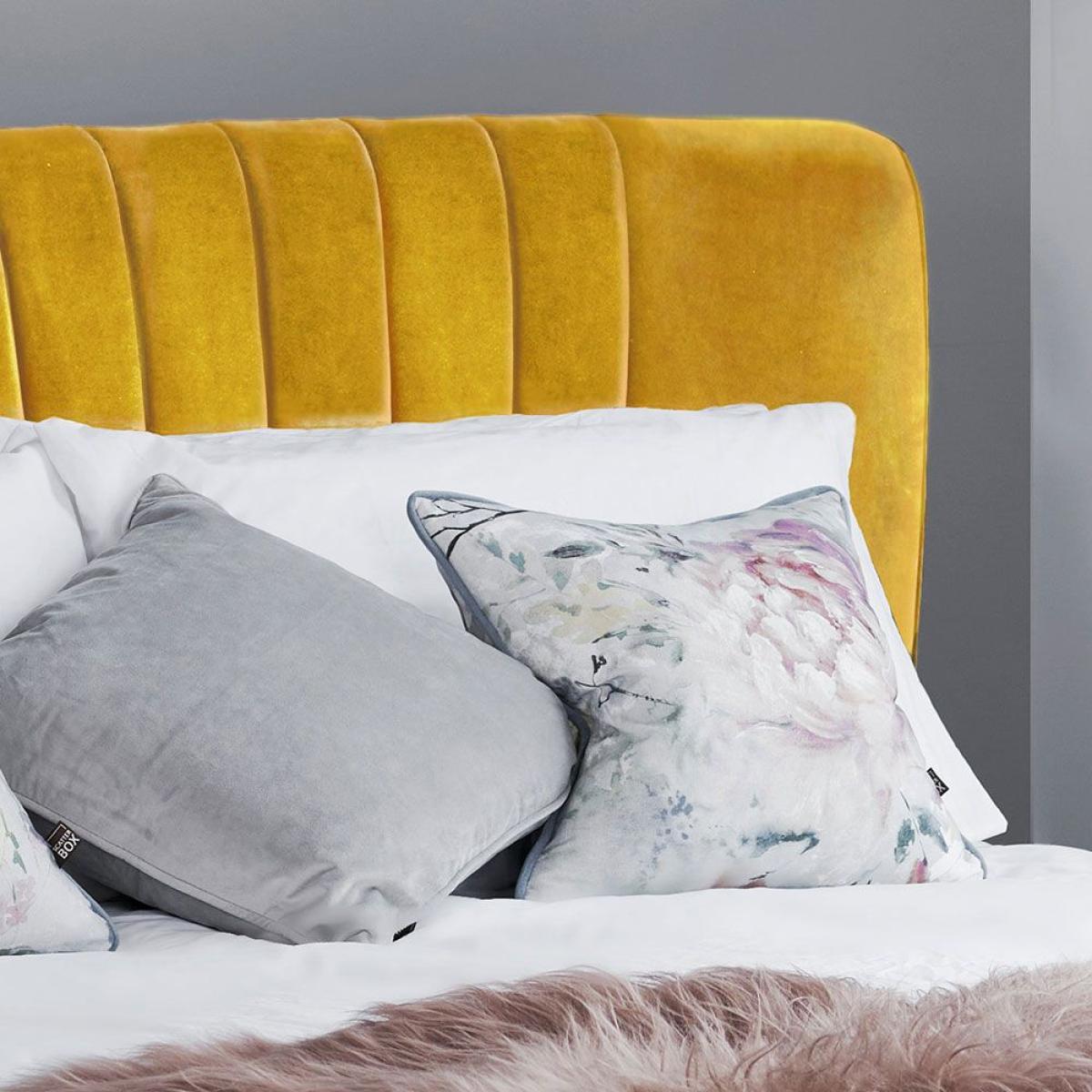 The Lucille velvet bedframe in this vibrant mustard features a classic scalloped headboard with exquisite stitching and soft velvet upholstery. The frame is fully upholstered on both siderails and footend and comes ready to assemble with an easy-fit slatted base which is held in place with velcro strips. This bed is perfect for those lazy mornings with the Sunday papers. Dimensions: King to fit mattress W150cm x L200cm Outer Dimensions: W186cm x L231cm x H122cm Velvet upholstery. Scallped headboard design. Wooden legs. Slatted base included. Simple self assembly
