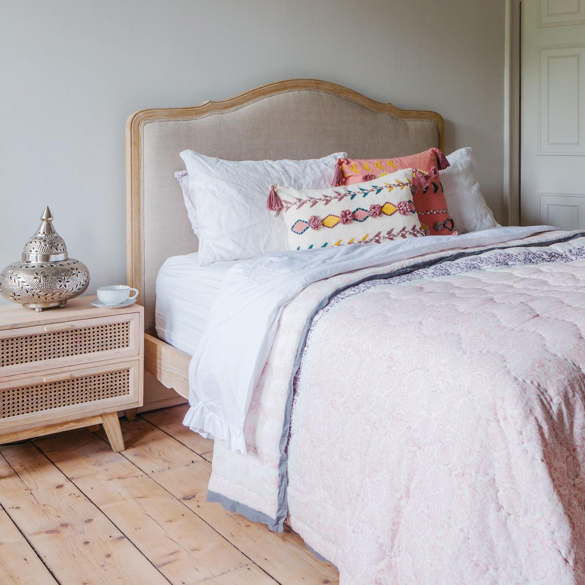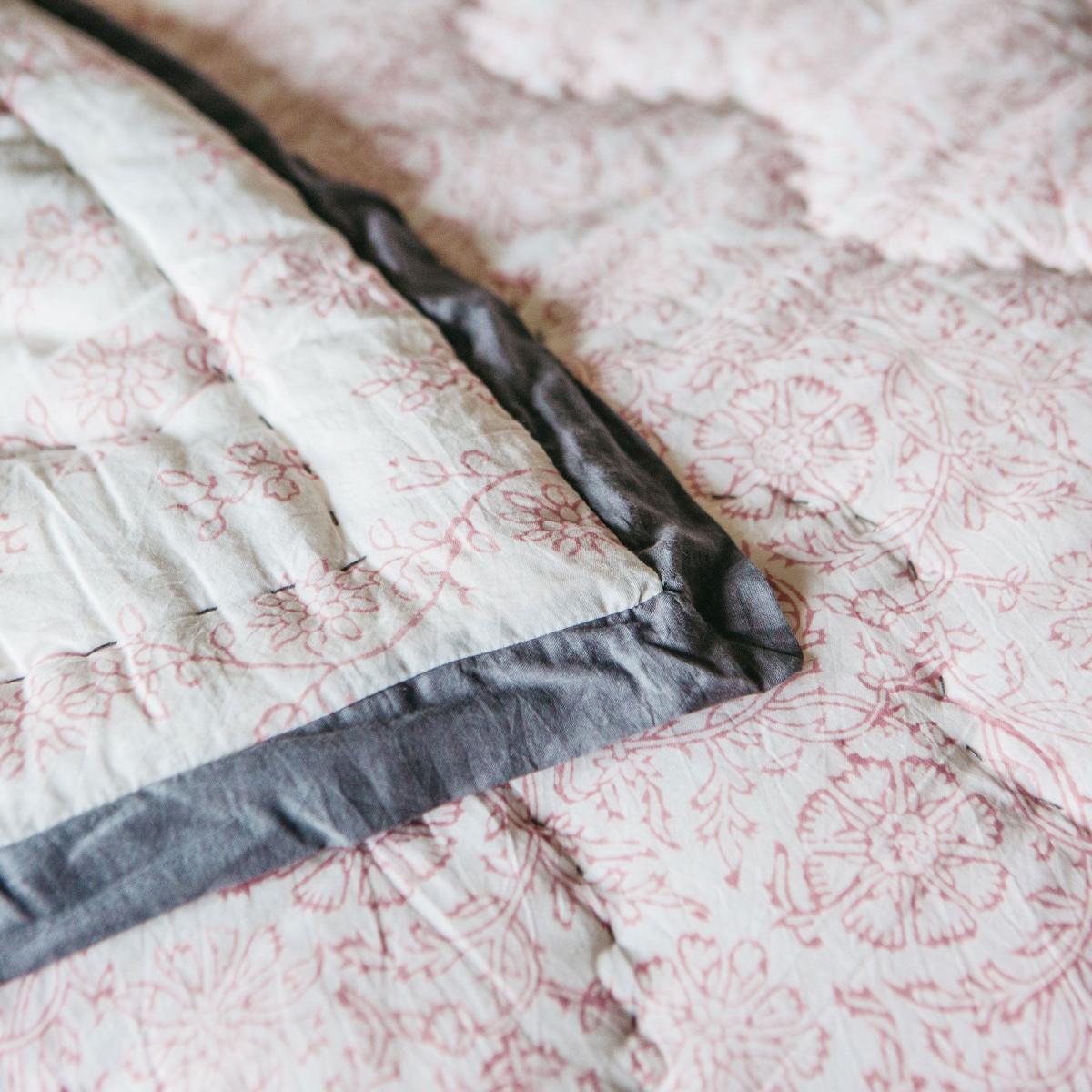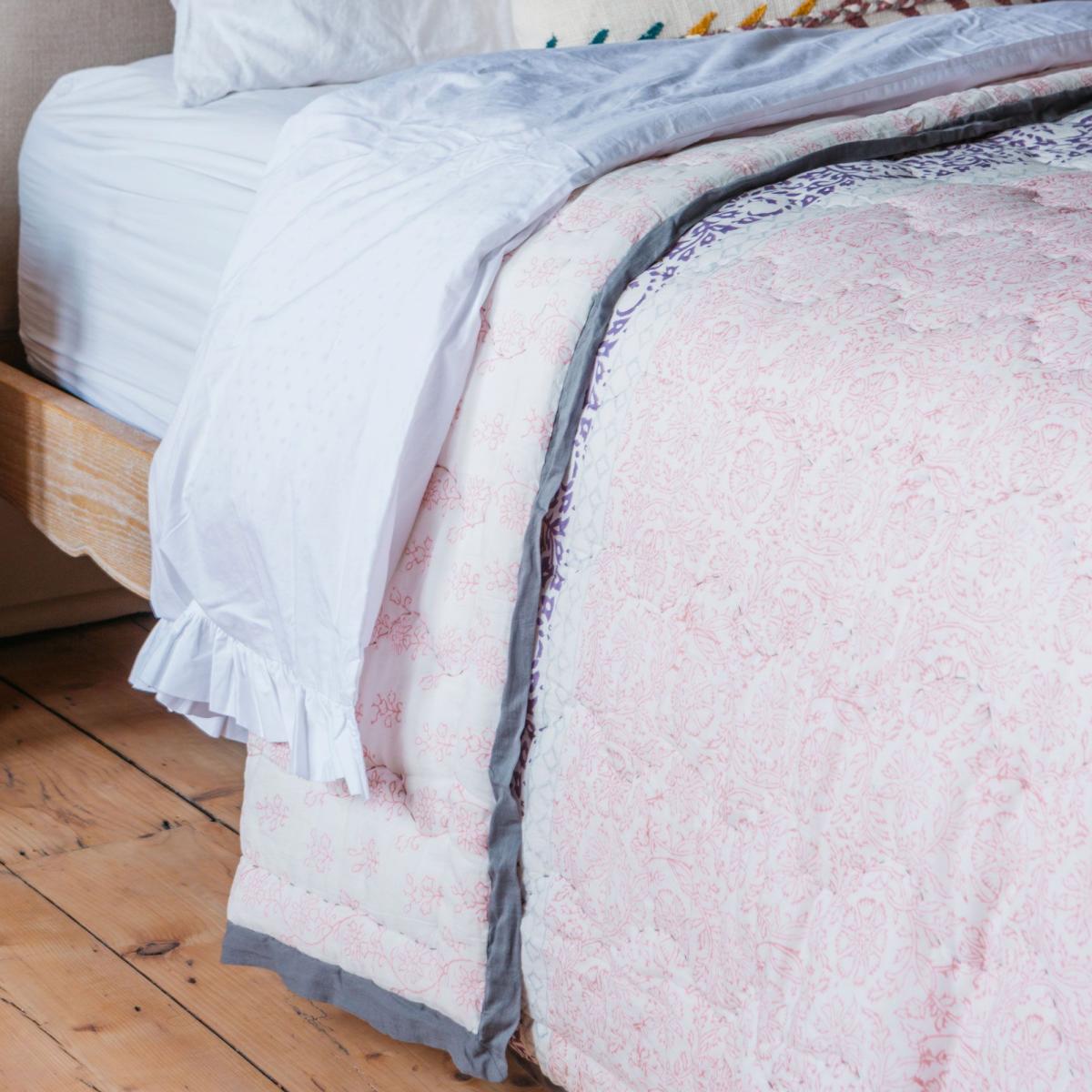 A beautiful, lightweight, hand block-printed quilt made of sumptuously soft cotton with subtle pinks and deep purples in super king size. L270 x W220cm. Super king size. Made of 100% cotton with a 100% polyester filling. Printed design. We recommend dry clean only. Due to the handmade nature of this product, colour, size and print may vary.