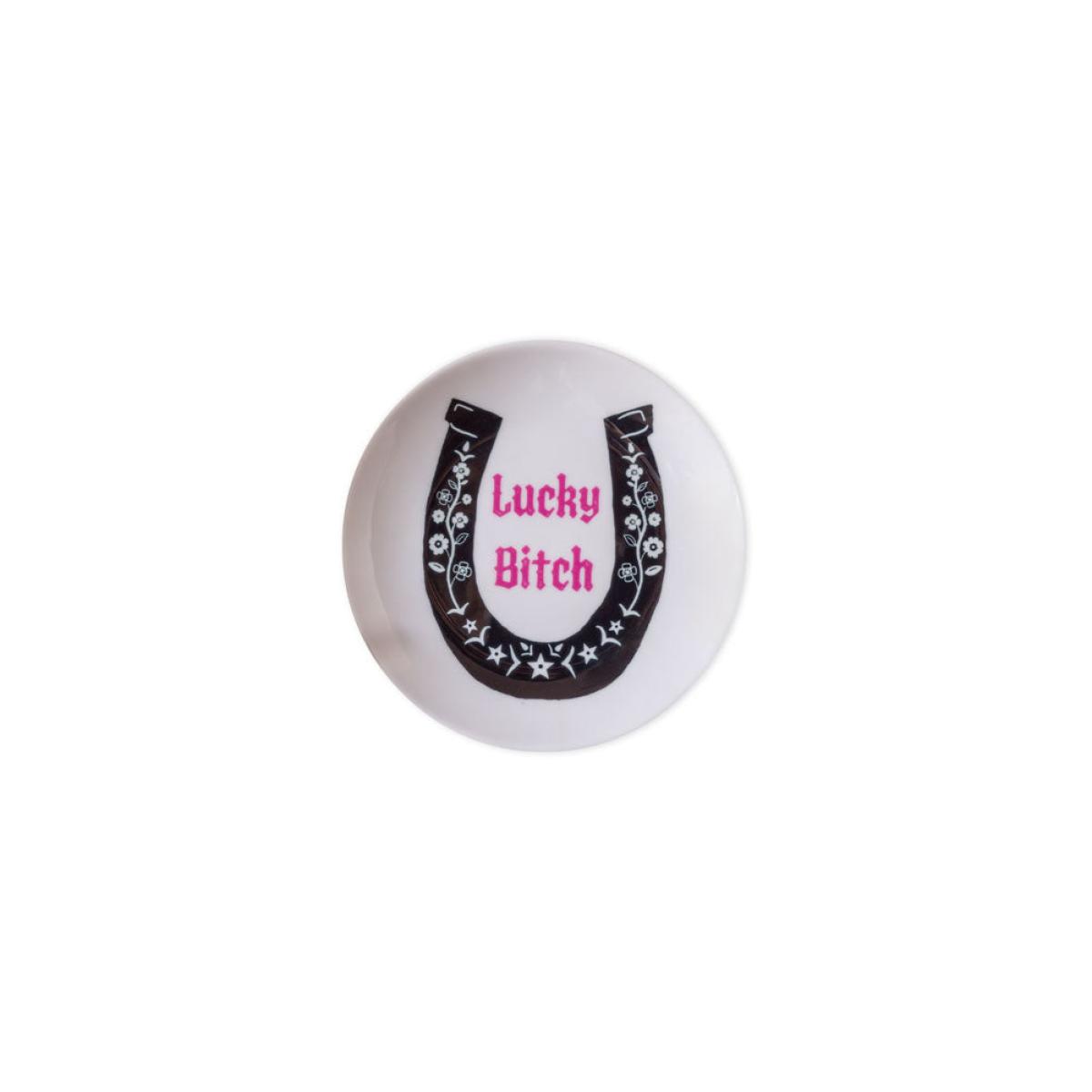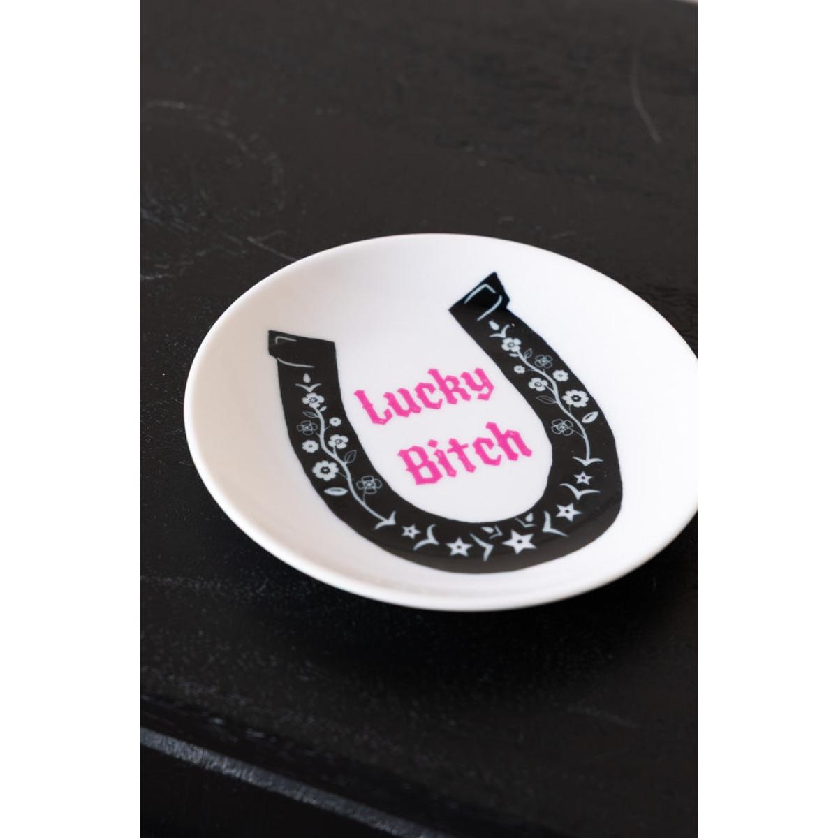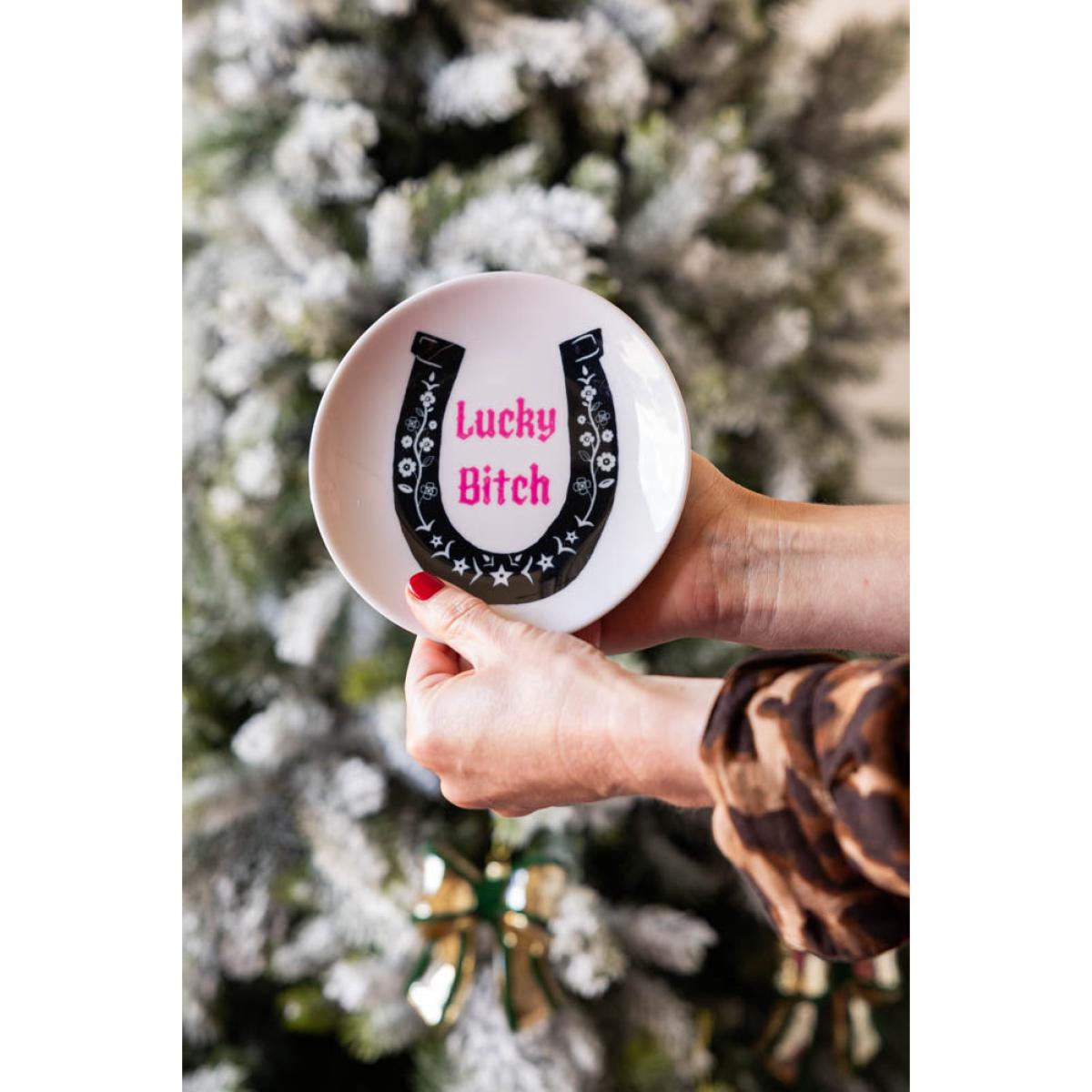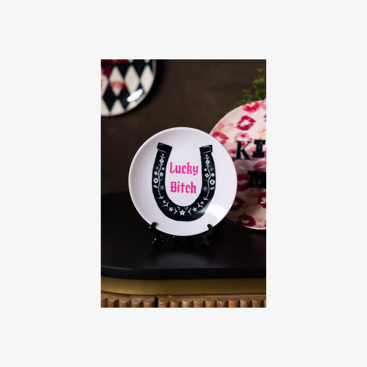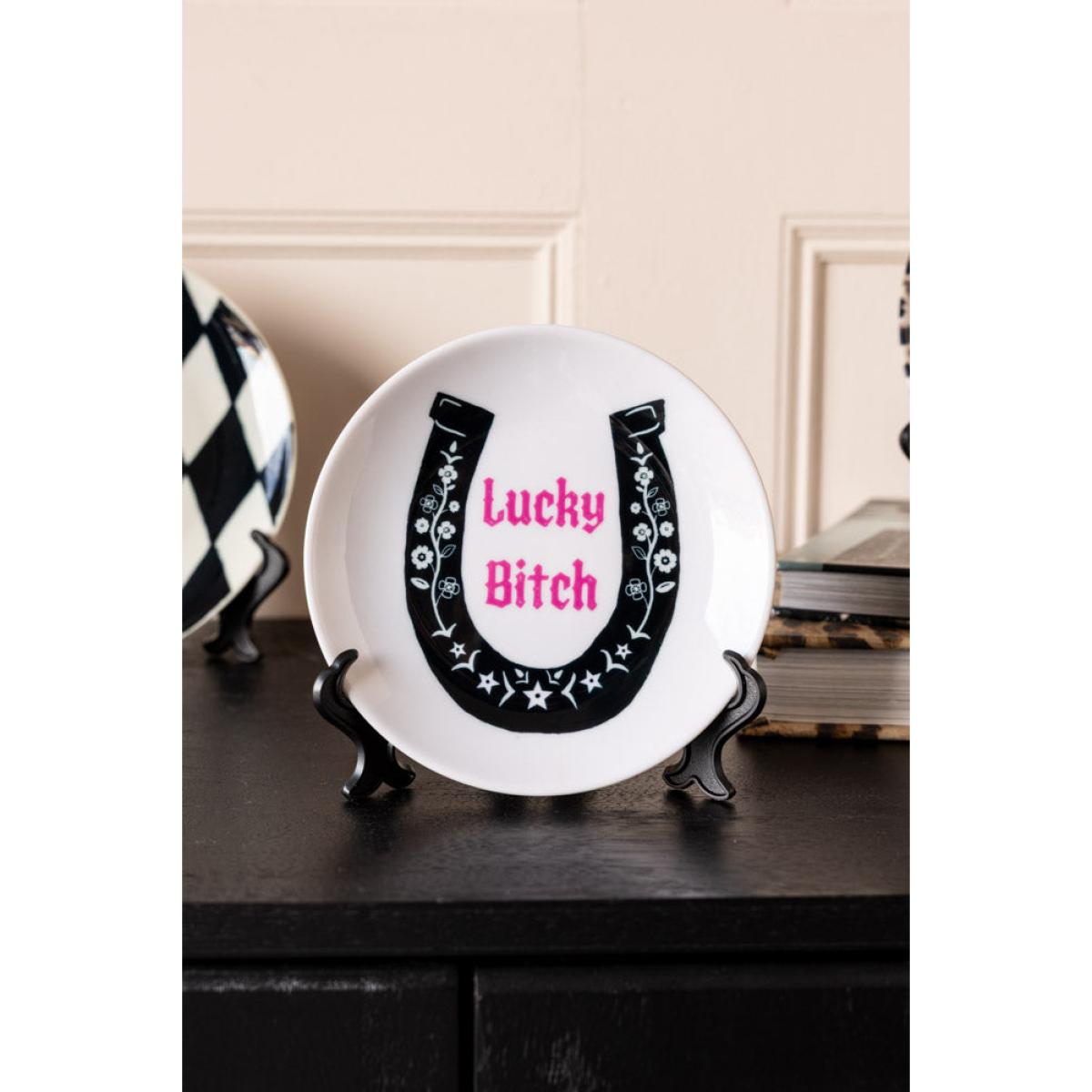 Bring a little charm and a lot of cheek to your wall art décor with our Lucky Bitch Decorative Wall Plate. Featuring a bold black horseshoe with delicate white floral accents, this stylish plate hides a playful twist – the words “Lucky Bitch” pop from the centre in bright pink, adding sass to the superstition, perfect for all your wall décor ideas. It’s the perfect mix of pretty and punchy – a good luck charm with attitude. Whether you style it as part of a gallery wall or let it shine as a standalone piece, this plate delivers both humour and style in equal measure. - Lucky Bitch Decorative Wall Plate - Measures: D15cm - Materials: Ceramic - Not Dishwasher Safe - We advise not eating from this product as the print may get damaged by cutlery overtime