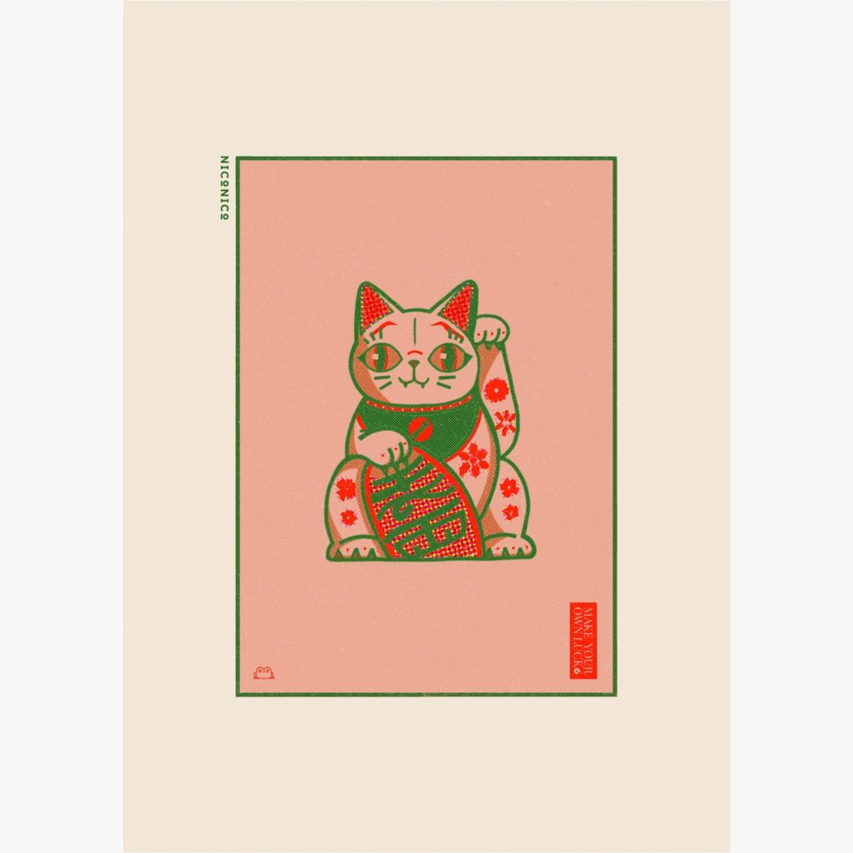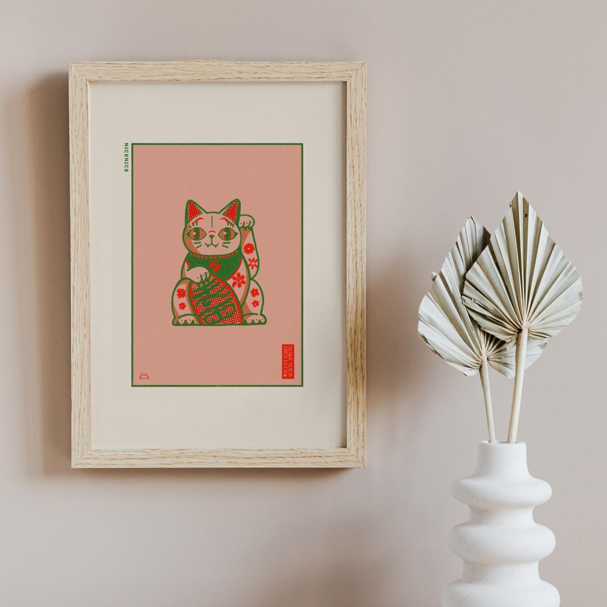 This lucky cat print is a charming addition to both modern and eclectic interiors, adding a pop of colour and a touch of playfulness. Its vibrant colours and floral elements make it particularly suited for spaces that embrace a relaxed, cheerful vibe-think kitchens, home offices, or casual living areas. To style it effectively, consider framing it in a simple, understated frame to let the artwork speak for itself, or pair it with other colourful prints for a curated gallery wall. It works well when hung at eye level, perhaps above a sideboard or sofa, to immediately catch the eye and inject a bit of fun into the room.