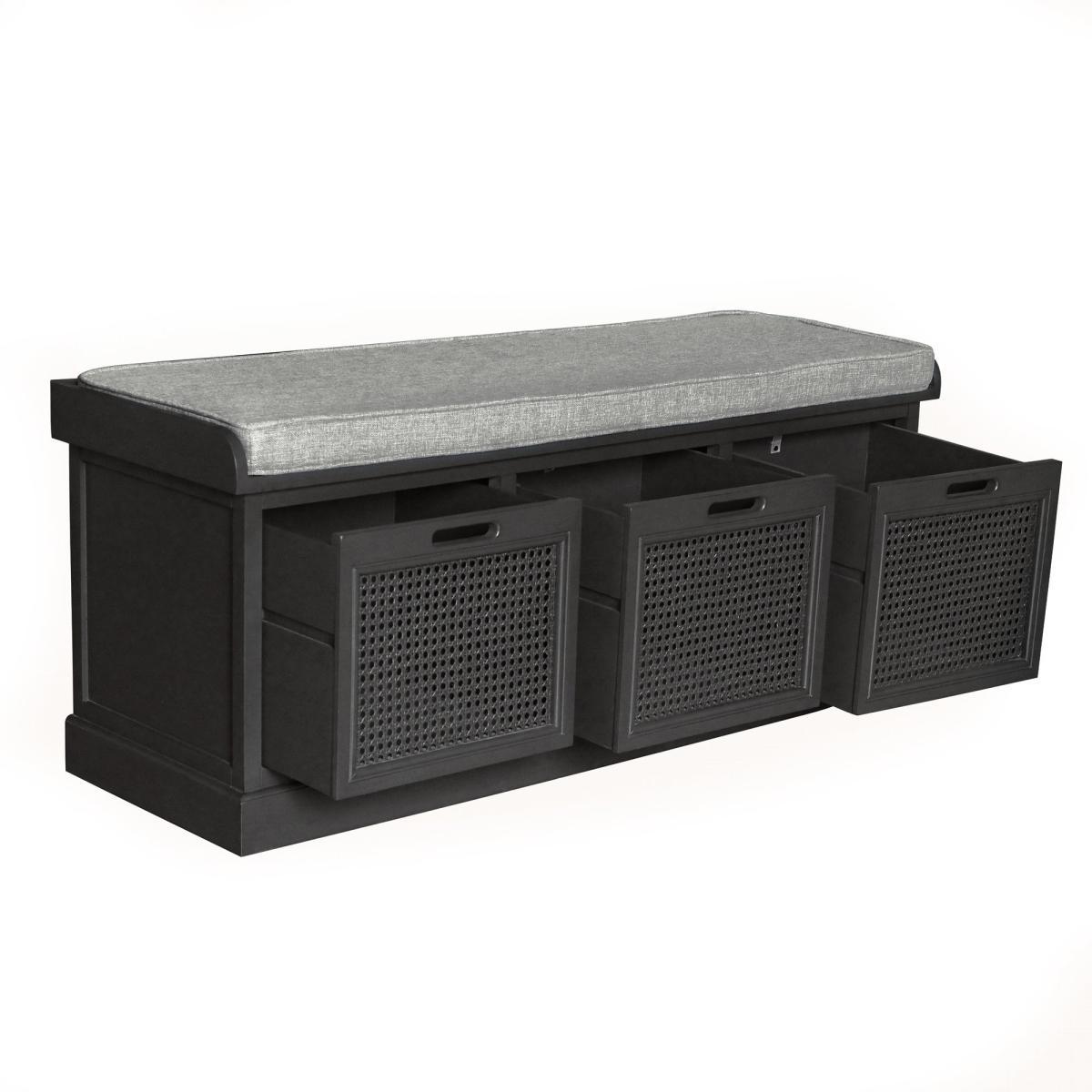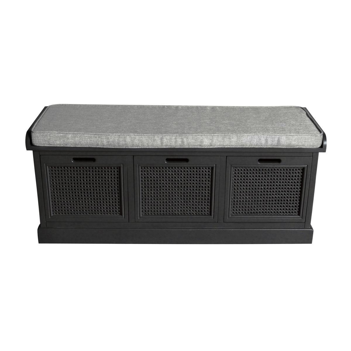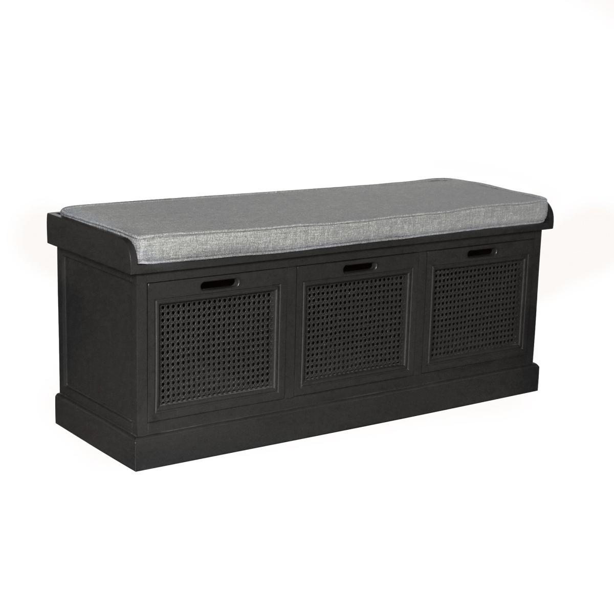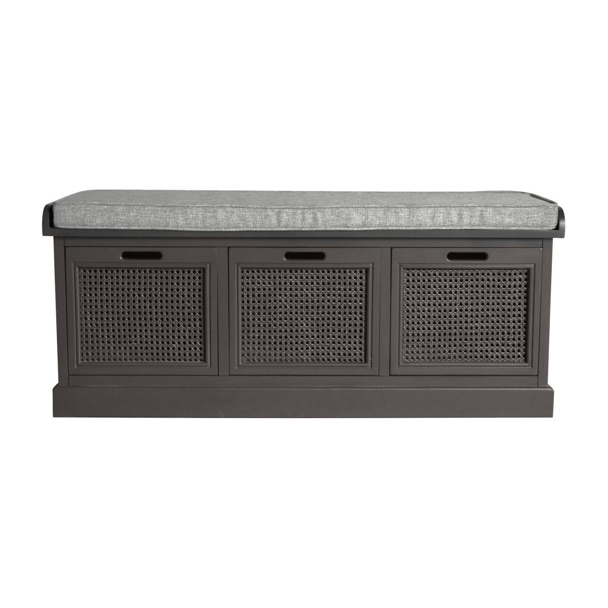 Dunelm Exclusive - Designed and Developed by Dunelm. Inspired by vintage French styling, the Lucy Cane range is elegantly crafted to provide a perfect statement piece for any living space. Finished in a lightly aged painted colourway with a natural lacquered coating and a woven cane design. Featuring three spacious drawers with cut-out handles and woven cane design, this fully assembled storage bench offers a grey foam-filled seat cushion top and a Charcoal colourway with a lightly aged painted finish. Care Instruction: Avoid prolonged exposure to direct sunlight. Clean regularly with a soft cloth and wipe up spills immediately with a damp cloth, avoid common hazards such as harsh solvents or abrasives. Item fully assembled.