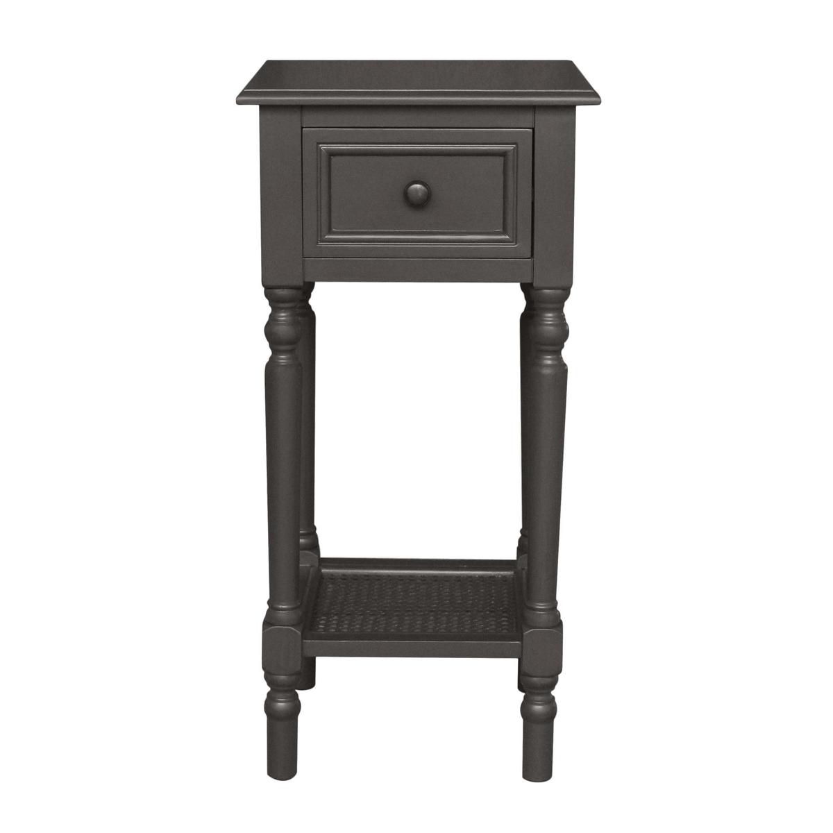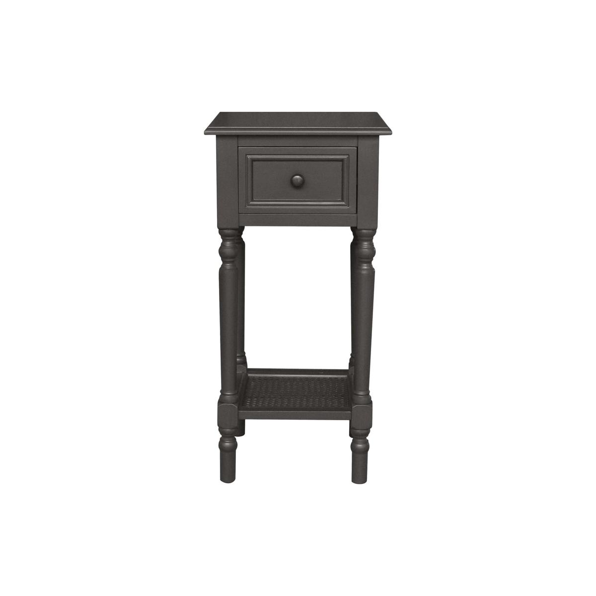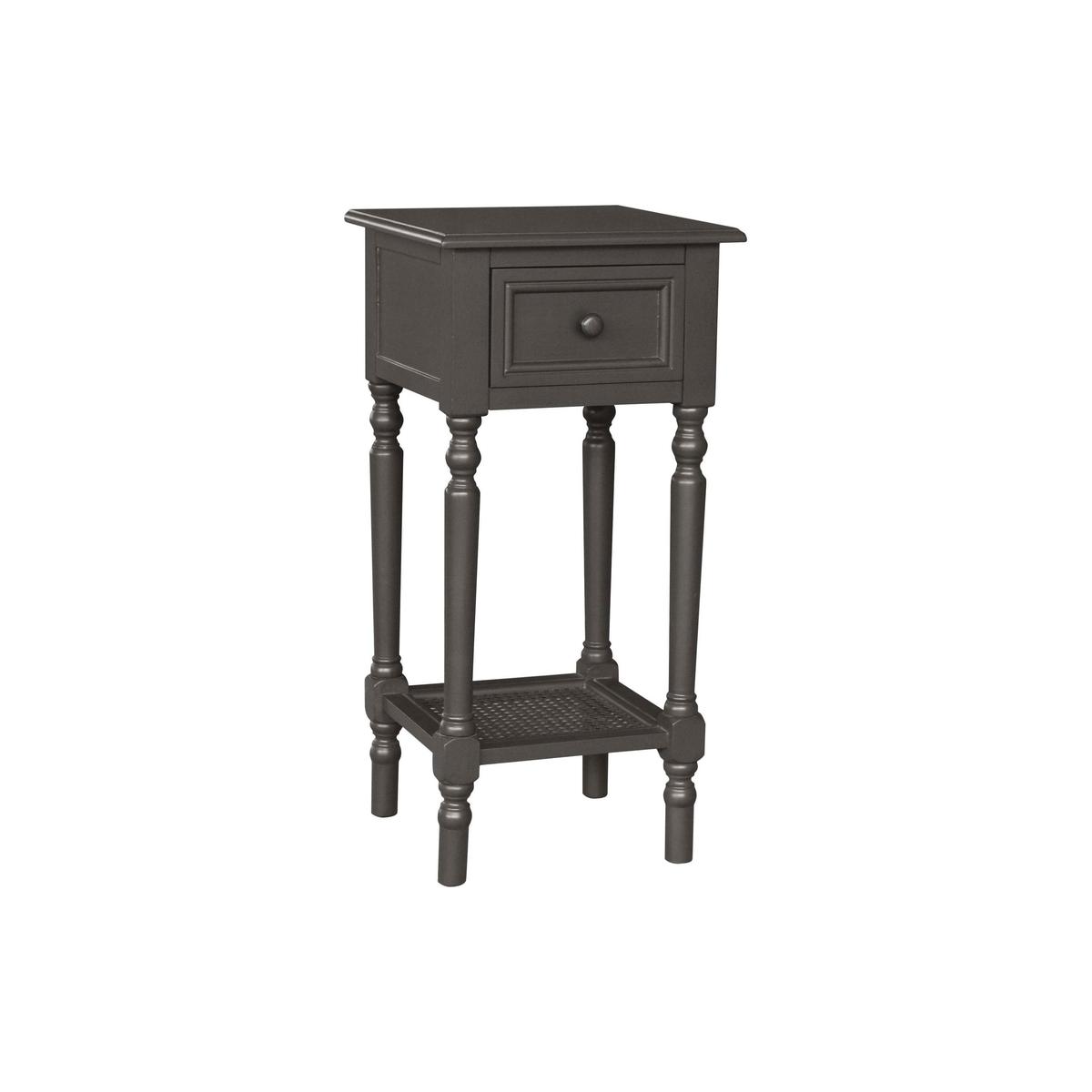 Dunelm Exclusive - Designed and Developed by Dunelm. Inspired by vintage French styling, the Lucy Cane range is elegantly crafted to provide a perfect statement piece for any living space. Finished in an aged painted colourway with natural lacquered coating, this stunning range features a woven cane design and turned legs. Featuring a Charcoal colourway with an aged painted finish, this part-assembly telephone table offers one small drawer complete with a round metal handle and a low woven cane shelf to boast extra storage space. Care Instruction: Avoid prolonged exposure to direct sunlight. Clean regularly with a soft cloth and wipe up spills immediately with a damp cloth, avoid common hazards such as harsh solvents or abrasives. Maintain brass and metal with regular dusting and clean with mild soapy water, dry thoroughly. Do not use a brass cleaner as this will damage the lacquer.