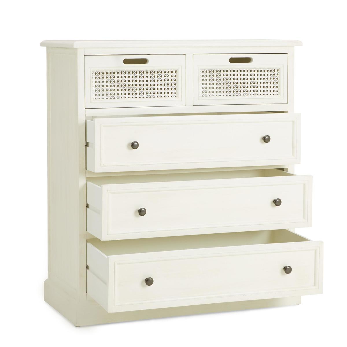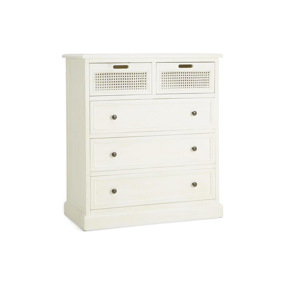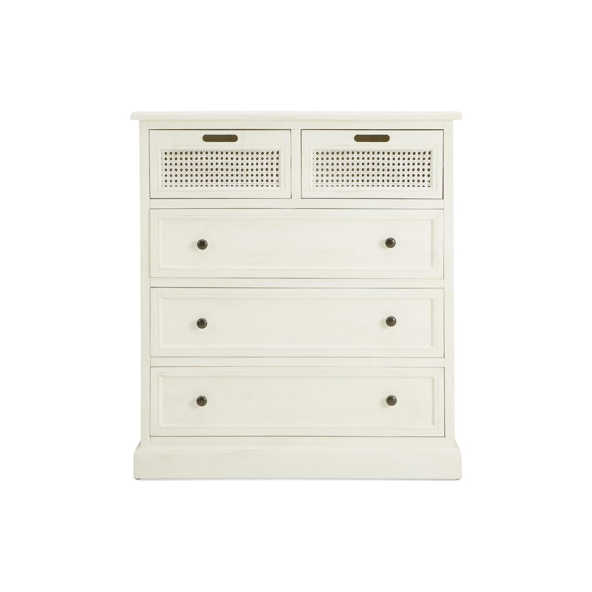 Dunelm Exclusive – Designed and Developed by Dunelm Inspired by vintage French styling, the Lucy Cane range is elegantly crafted to provide a perfect statement piece for any living space. Hand finished in an aged painted colourway to give an authentic feel, this stunning range has a natural lacquered coating and features a woven cane design and turned legs. Stunningly crafted in a cream colourway, this fully assembled chest of drawers features three ample-size drawers with dark round handles and two smaller drawers to provide a generous amount storage space. Care Instruction: Avoid prolonged exposure to direct sunlight. Clean regularly with a soft cloth and wipe up spills immediately with a damp cloth, avoid common hazards such as harsh solvents or abrasives. Maintain brass and metal with regular dusting and clean with mild soapy water, dry thoroughly. Do not use a brass cleaner as this will damage the lacquer. This Range is also available in [Grey.](https://www.dunelm.com/category/home-and-furniture/furniture/shop-by-collection/lucy-cane-furniture-collection?f_attributes.objDunelmsku.colourGroup=Grey)