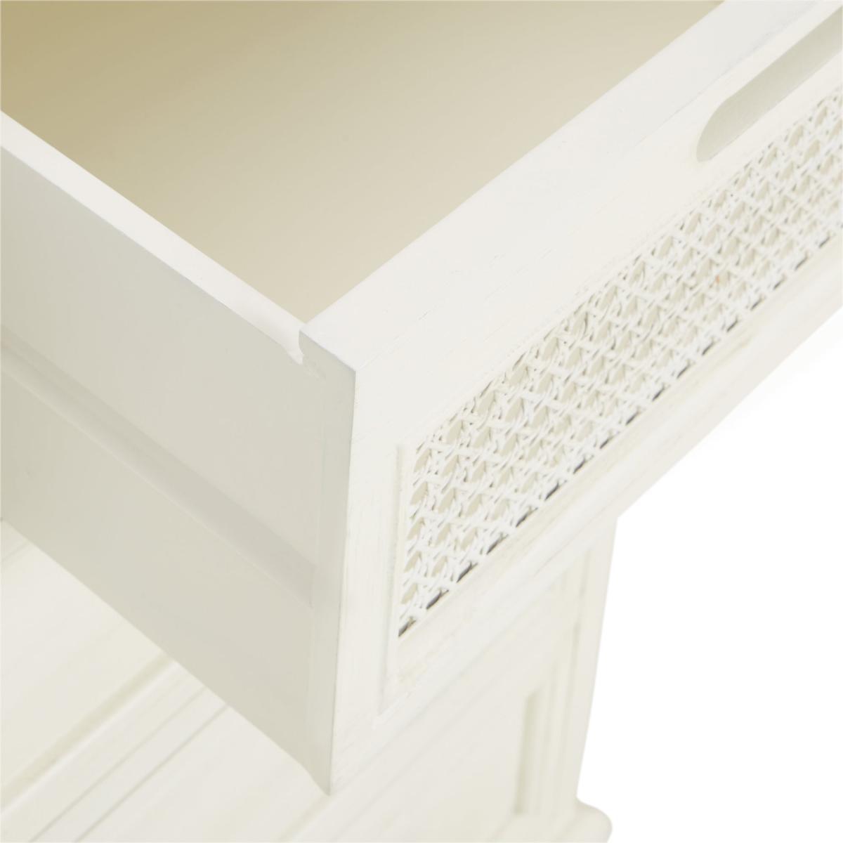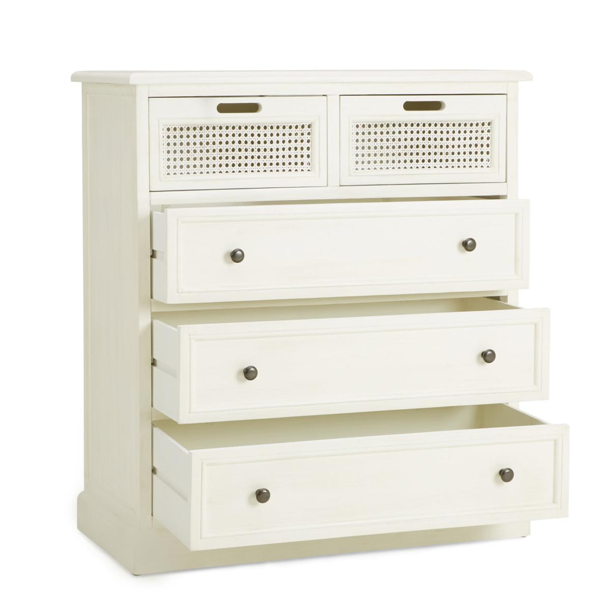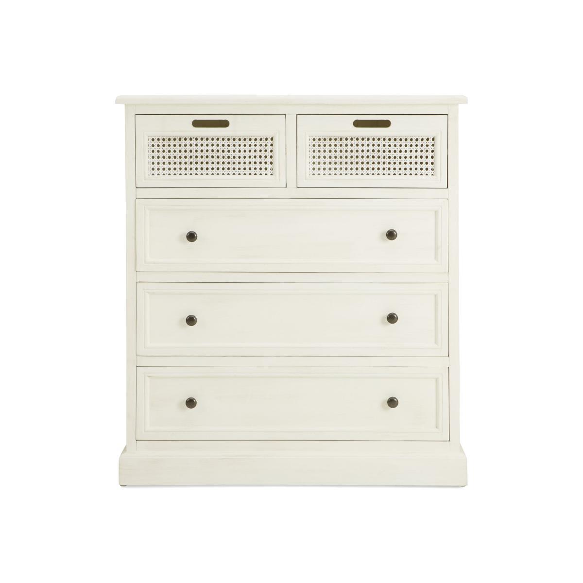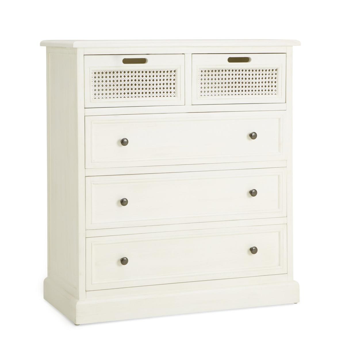 Dunelm Exclusive - Designed and Developed by Dunelm. Inspired by vintage French styling, the Lucy Cane range is elegantly crafted to provide a perfect statement piece for any living space. Hand finished in an aged painted colourway to give an authentic feel, this stunning range has a natural lacquered coating and features a woven cane design and turned legs. Stunningly crafted in a cream colourway, this fully assembled chest of drawers features three ample-size drawers with dark round handles and two smaller drawers to provide a generous amount storage space. Care Instruction: Avoid prolonged exposure to direct sunlight. Clean regularly with a soft cloth and wipe up spills immediately with a damp cloth, avoid common hazards such as harsh solvents or abrasives. Maintain brass and metal with regular dusting and clean with mild soapy water, dry thoroughly. Do not use a brass cleaner as this will damage the lacquer. To view the full Lucy Cane range in cream. This range is also available in grey. Item fully assembled.