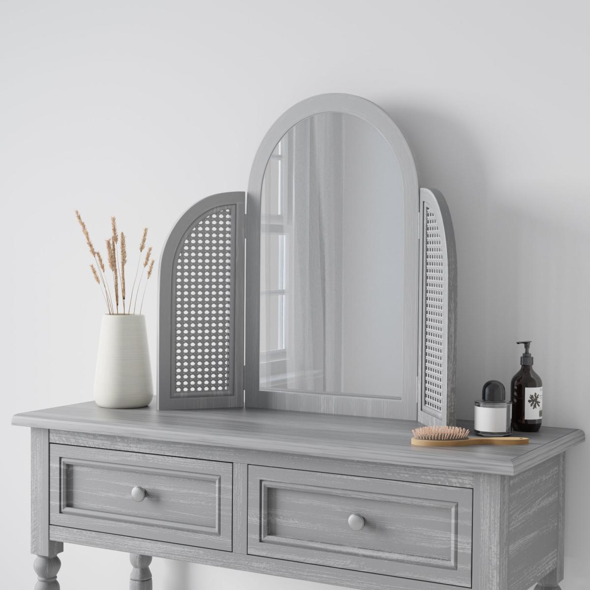 This stunning dressing table mirror has a cane design and folding shape adding a traditional feel, while keeping its modern look with the stylish grey colourway, complementing an array of home decors beautifully.