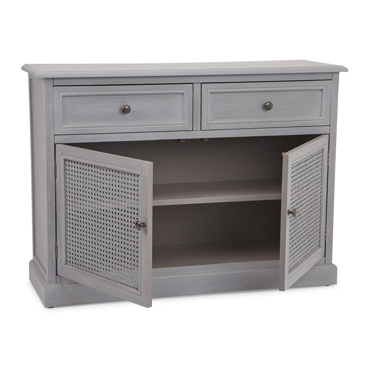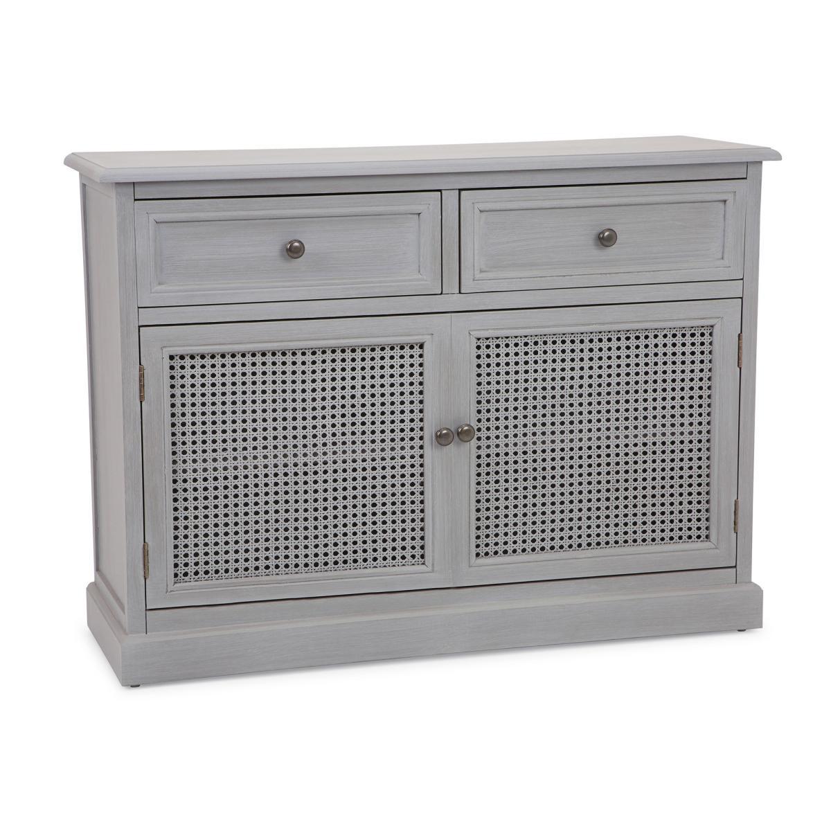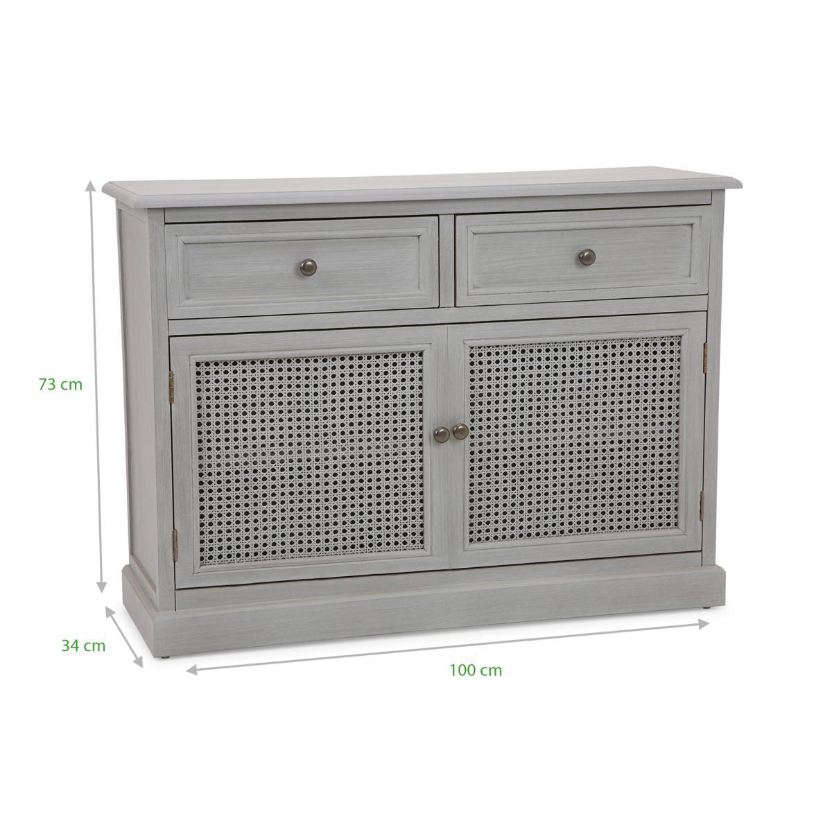 Dunelm Exclusive - Designed and Developed by Dunelm. Inspired by vintage French styling, the Lucy Cane range is elegantly crafted to provide a perfect statement piece for any living space. Finished in an aged painted colourway with natural lacquered coating, this stunning range features a woven cane design and turned legs. Offering ample storage space with two solid wood drawers and two woven cane cupboards, this fully assembled sideboard features a slate grey colourway with an aged painted finish and dark round handles. This Range is also available in. Cream. Item fully assembled.