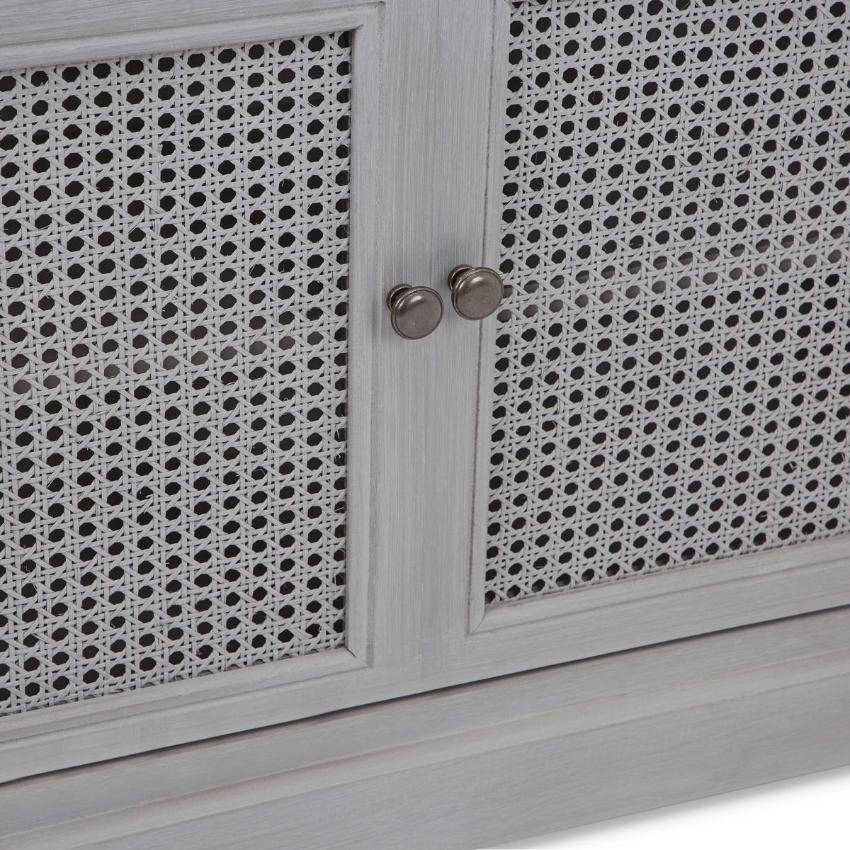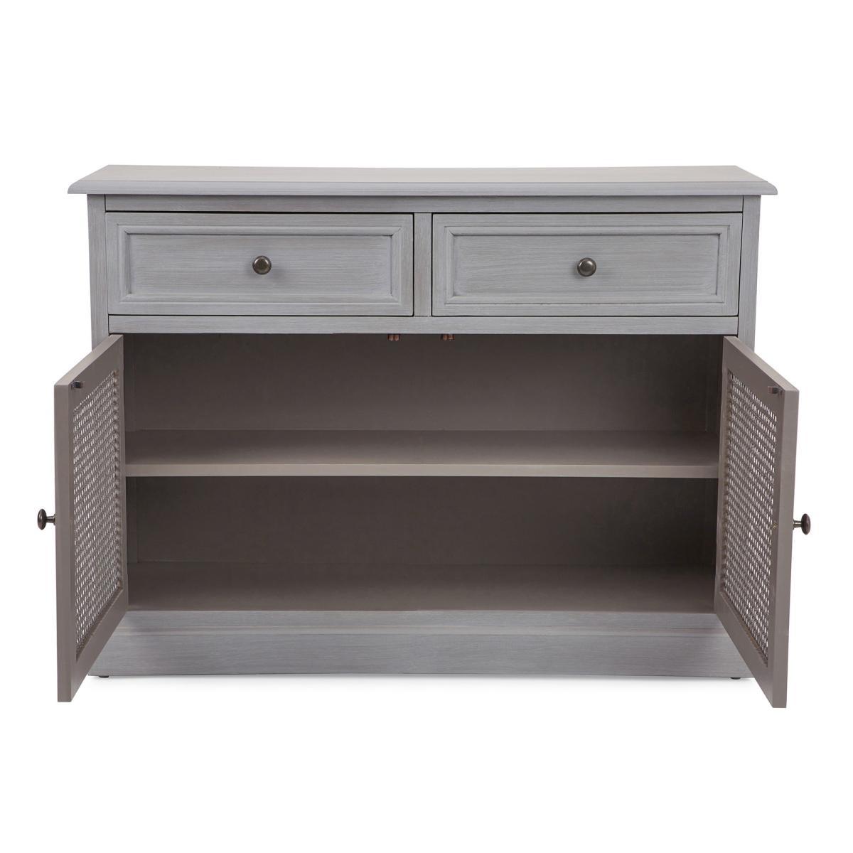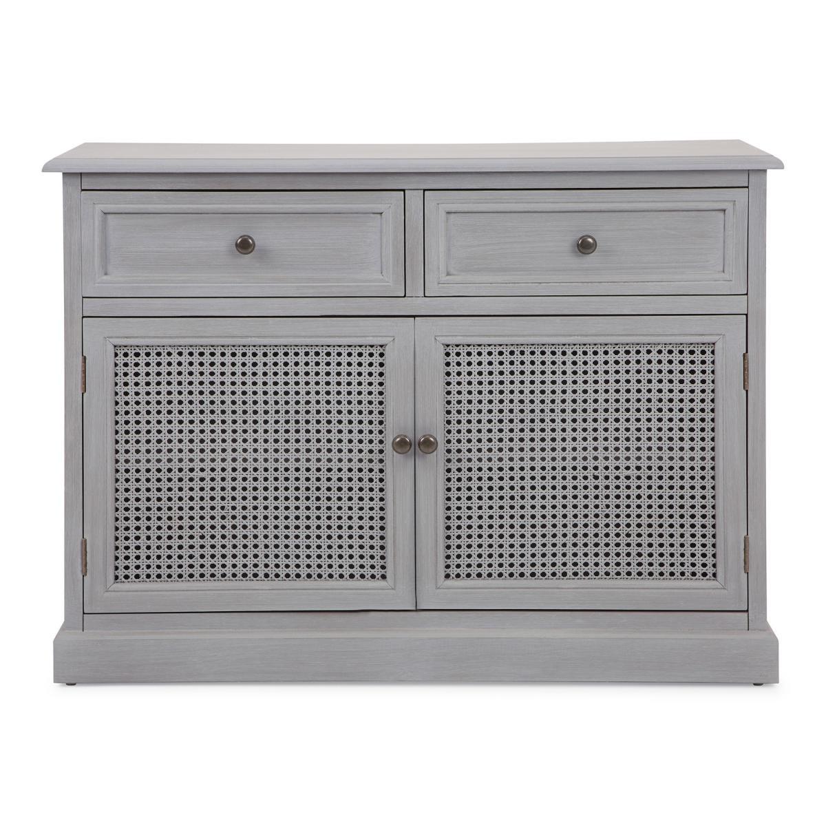 Dunelm Exclusive - Designed and Developed by Dunelm. Inspired by vintage French styling, the Lucy Cane range is elegantly crafted to provide a perfect statement piece for any living space. Finished in an aged painted colourway with natural lacquered coating, this stunning range features a woven cane design and turned legs. Offering ample storage space with two solid wood drawers and two woven cane cupboards, this fully assembled sideboard features a slate grey colourway with an aged painted finish and dark round handles. This Range is also available in. Cream. Item fully assembled.