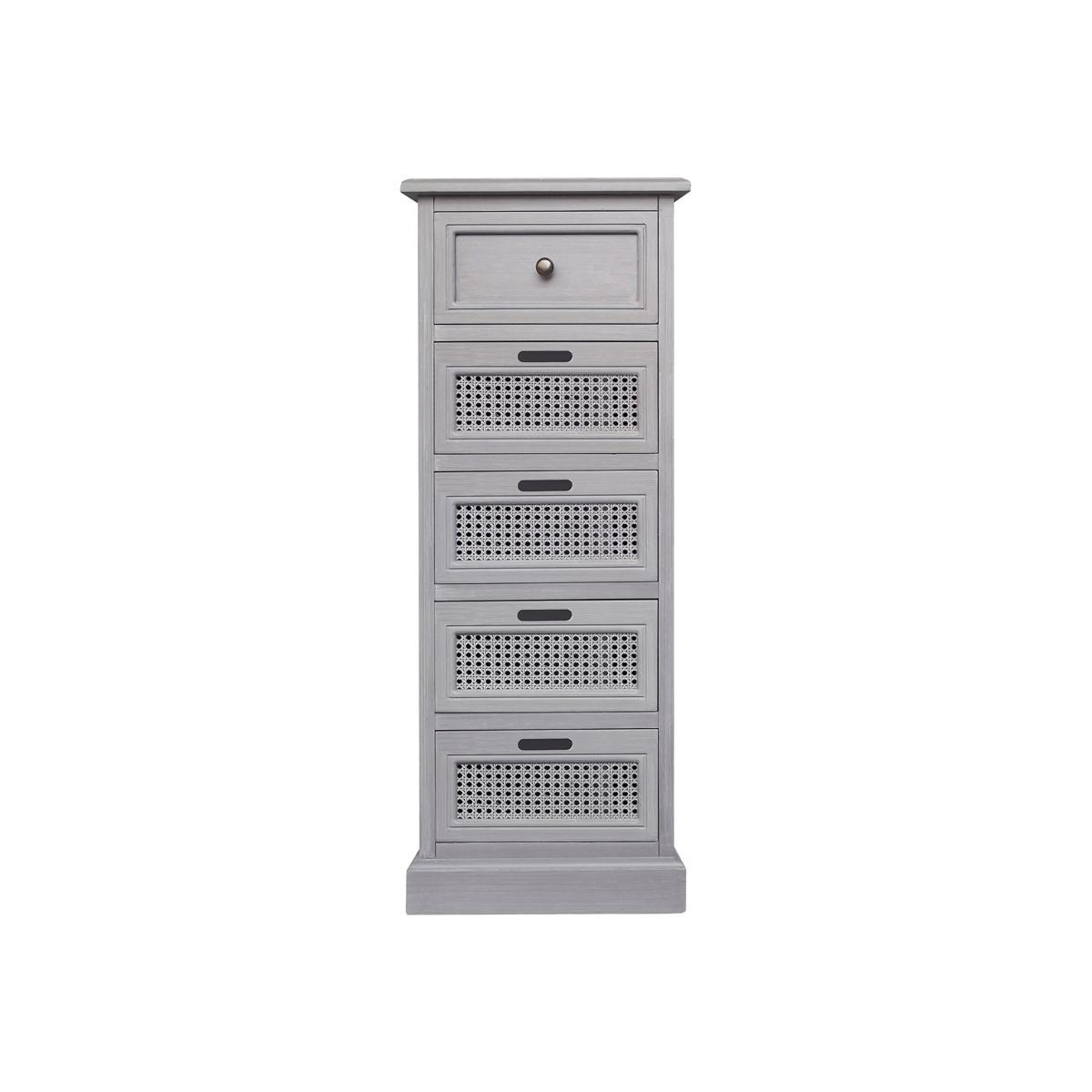 Dunelm Exclusive - Designed and Developed by Dunelm. Inspired by vintage French styling, the Lucy range is elegantly crafted to provide a perfect statement piece for any living space. Finished in a painted grey colourway with natural lacquered coating, this stunning range features a woven cane design. Designed to maximise storage space, this fully assembled tall boy features five spacious drawers complete with one round handle whilst the rest have cut-out handles, perfect to suit in any room. Item fully assembled.