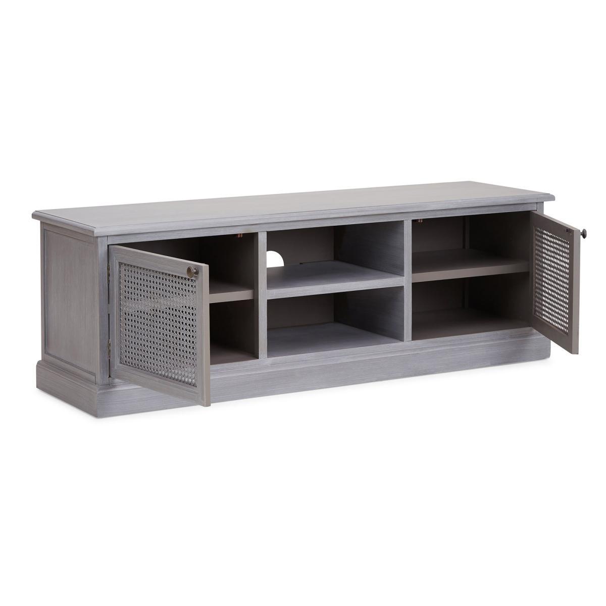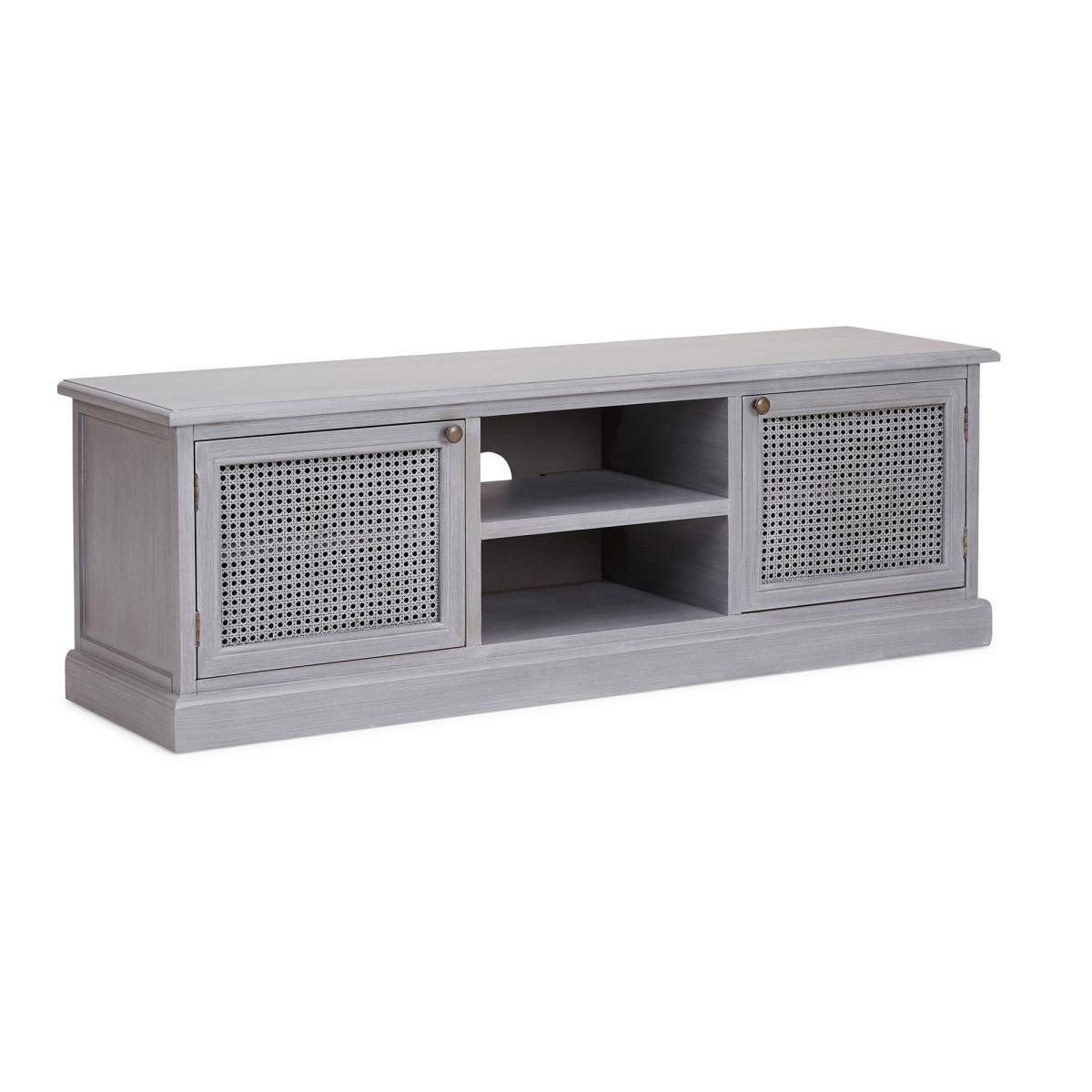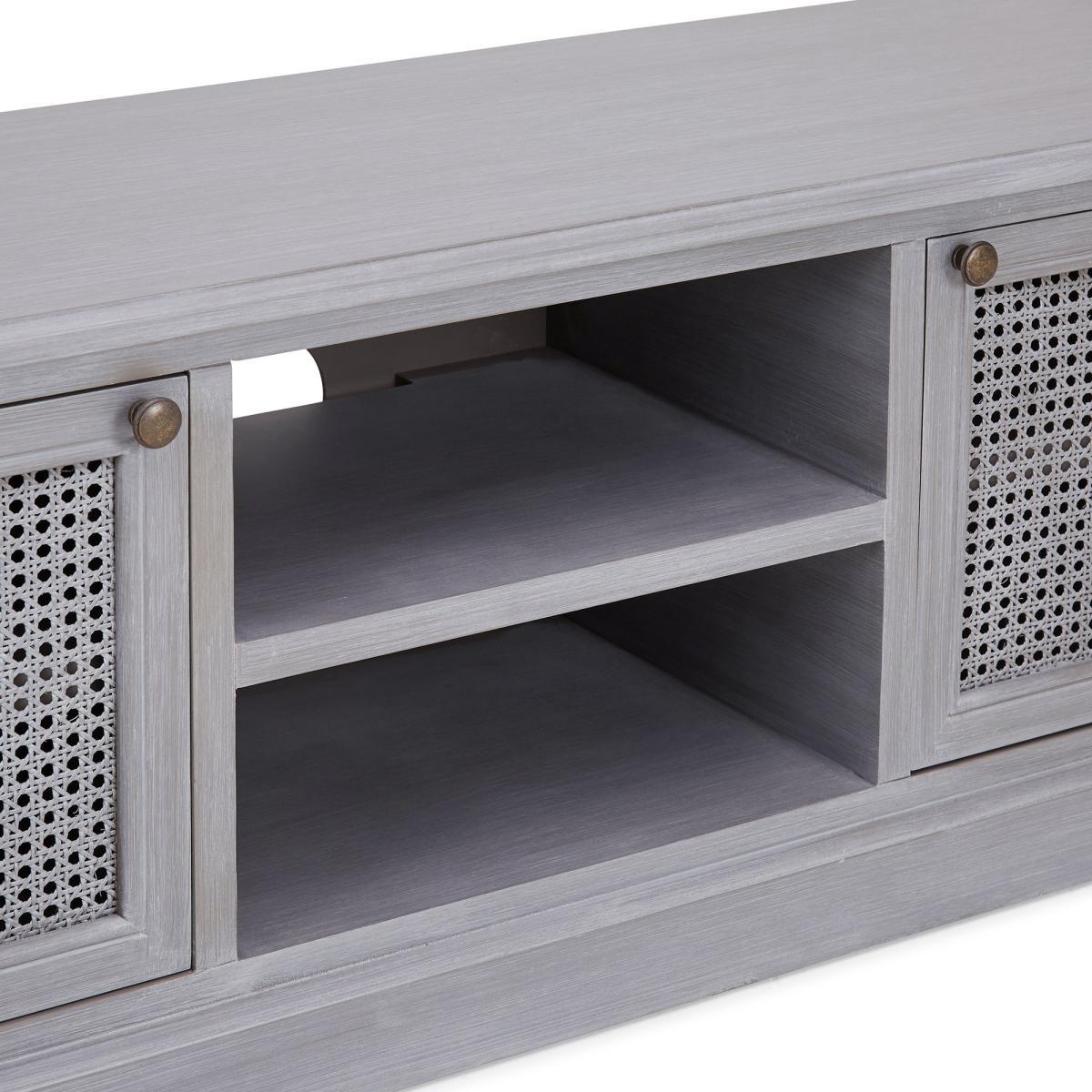 Dunelm Exclusive - Designed and Developed by Dunelm. Inspired by vintage French styling, the Lucy Cane range is elegantly crafted to provide a perfect statement piece for any living space. Finished in an aged painted colourway with natural lacquered coating, this stunning range features a woven cane design and turned legs. Elegantly crafted in a slate grey colourway, this fully assembled wide TV stand features one open shelf with cable access and two ample-size cupboards with fixed shelve, providing generous storage space. Care Instruction: Avoid prolonged exposure to direct sunlight. Clean regularly with a soft cloth and wipe up spills immediately with a damp cloth, avoid common hazards such as harsh solvents or abrasives. Maintain brass and metal with regular dusting and clean with mild soapy water, dry thoroughly. Do not use a brass cleaner as this will damage the lacquer. This Range is also available in. Cream. Item fully assembled.