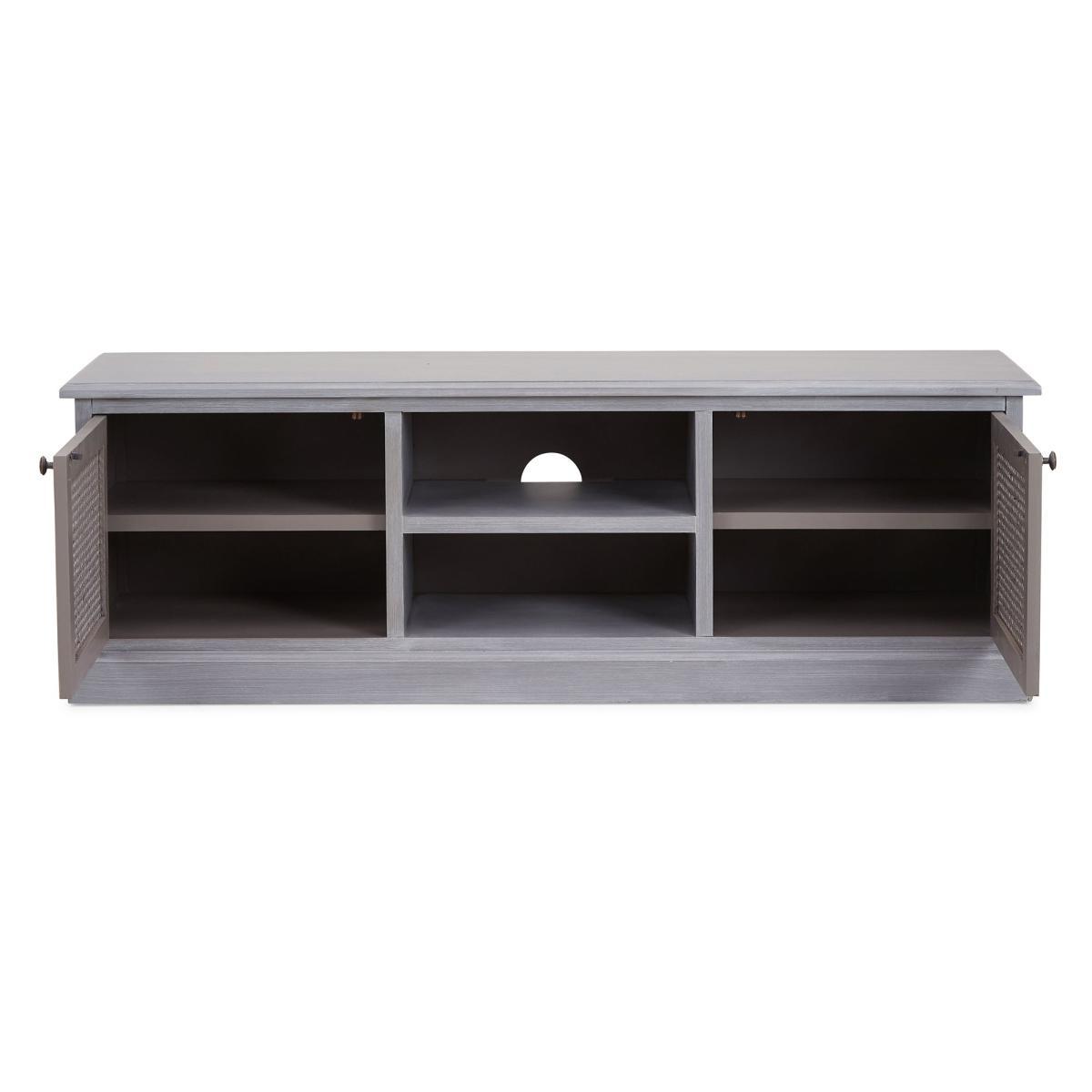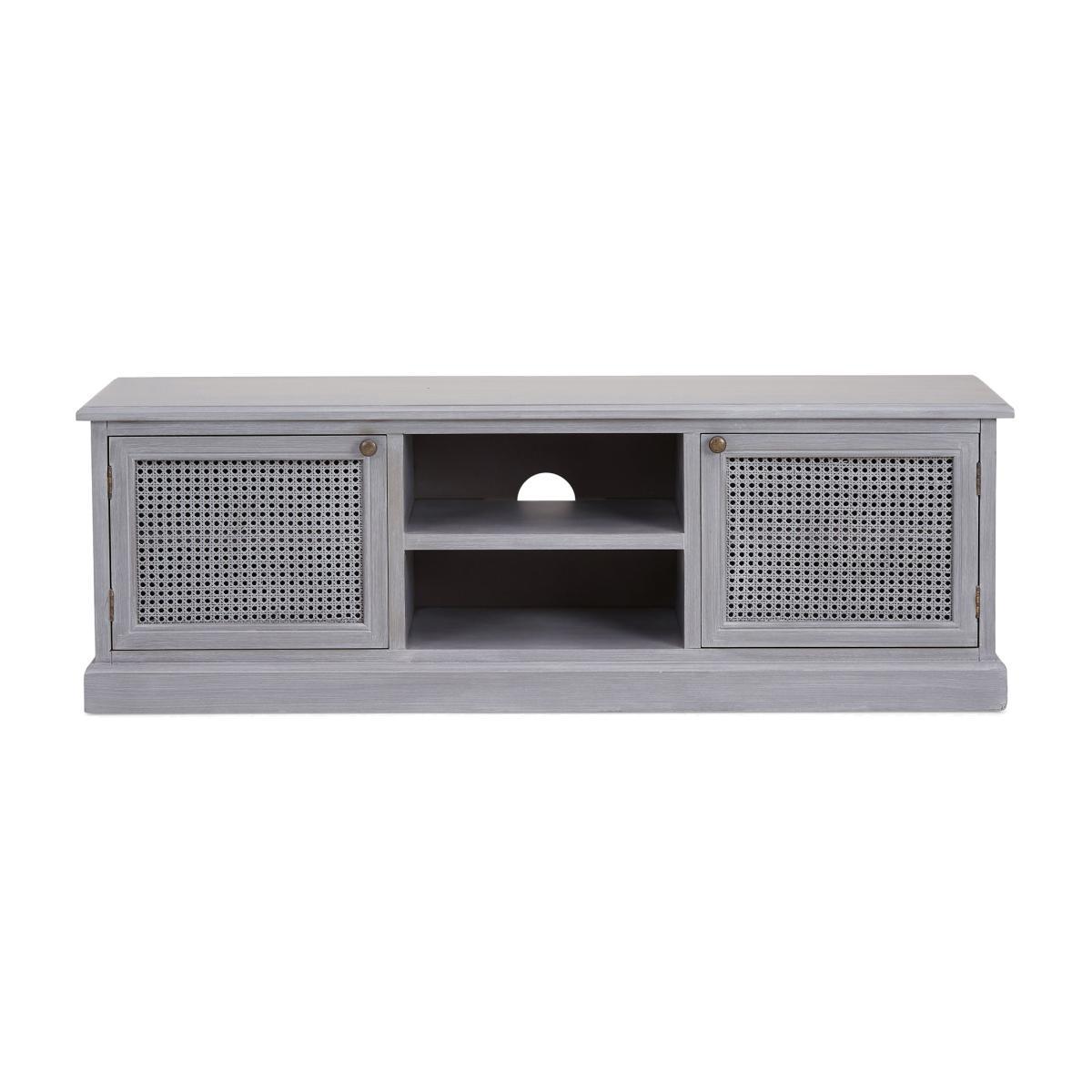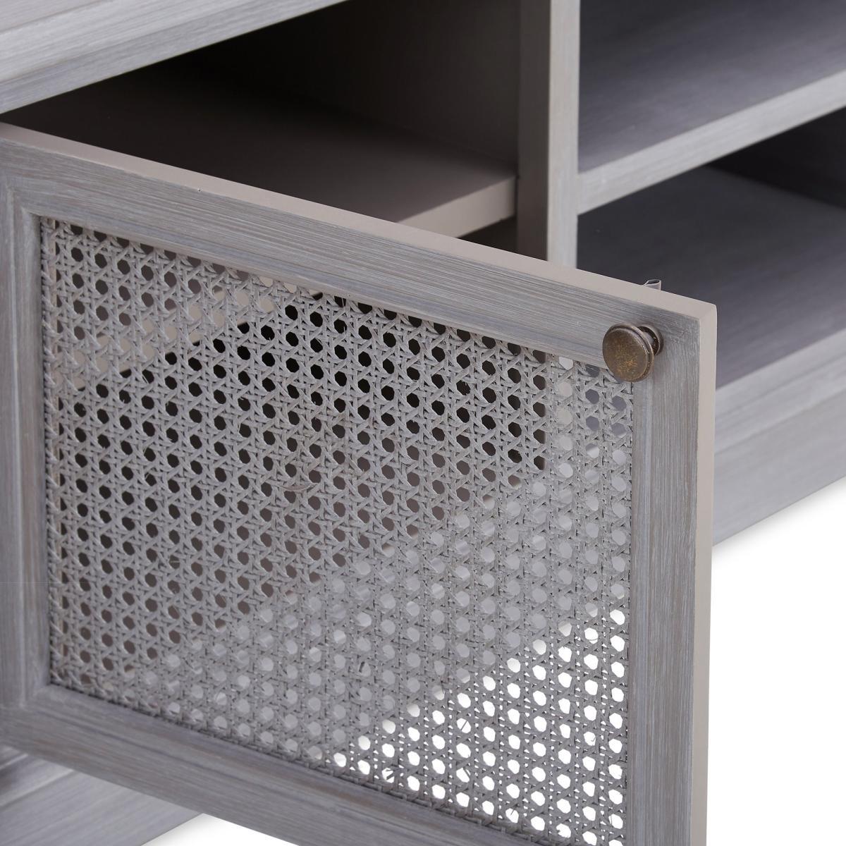 Dunelm Exclusive - Designed and Developed by Dunelm. Inspired by vintage French styling, the Lucy Cane range is elegantly crafted to provide a perfect statement piece for any living space. Finished in an aged painted colourway with natural lacquered coating, this stunning range features a woven cane design and turned legs. Elegantly crafted in a slate grey colourway, this fully assembled wide TV stand features one open shelf with cable access and two ample-size cupboards with fixed shelve, providing generous storage space. Care Instruction: Avoid prolonged exposure to direct sunlight. Clean regularly with a soft cloth and wipe up spills immediately with a damp cloth, avoid common hazards such as harsh solvents or abrasives. Maintain brass and metal with regular dusting and clean with mild soapy water, dry thoroughly. Do not use a brass cleaner as this will damage the lacquer. This Range is also available in. Cream. Item fully assembled.