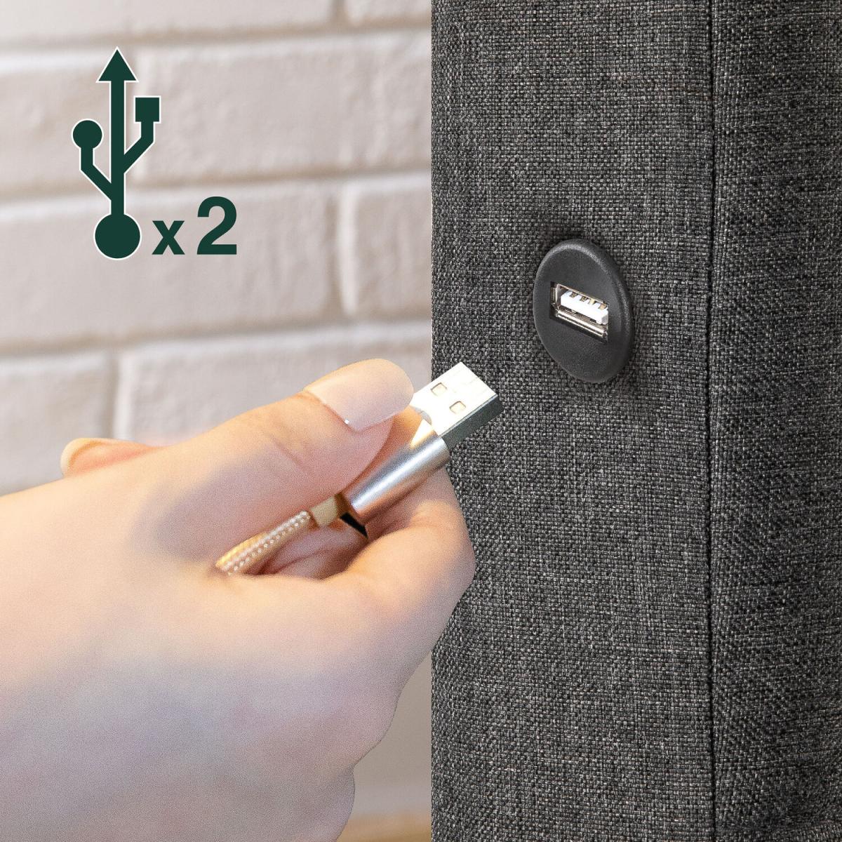 Smart USB Upholstered Bed Frame This bestselling Upholstered Bed Frame now comes with a high-tech upgrade and shorter, 35-inch headboard. It features a USB port on either side of the headboard, so youll always have a place to plug in while youre relaxing in bed. Its finished off with a stylish square stitched upholstered headboard that offers a refined, modern look for your bedroom. Whats more, its built with a steel frame and wood mattress platform designed to support any mattress. Extend the life of any spring, latex or memory foam mattress by resting it directly on top of this durable foundation, made even more dependable by additional center support legs. And to make delivery and setup as painless as possible, we pack this bed with everything you need to assemble it (plus a 5-year warranty) into one box that arrives at your doorstep. HIGH TECH, LOW PROFILE - At 35-inches tall, this upholstered bed frame fits beautifully beneath your low ceilings and windows and features two convenient USB ports on the headboard so your devices can stay charged and close byDURABL. Y DESIGNED - Interior steel framework and dense foam padding add comfort and longevity single size supports a maximum weight capacity of 159 kg, while all other sizes can support up to 318 kgNOIS. E FREE - Wooden slats designed to minimize noise when you sleep and designed to extend the life of your mattress EASY ASSEMBLY Everything you need is efficiently packed into one box and shipped straight to your door all parts, tools and instructions are located in the zippered compartment of the headboard for easy, two-person assembly in under an hourWORR Y - FREE - 5 year limited warranty included mattress sold separately