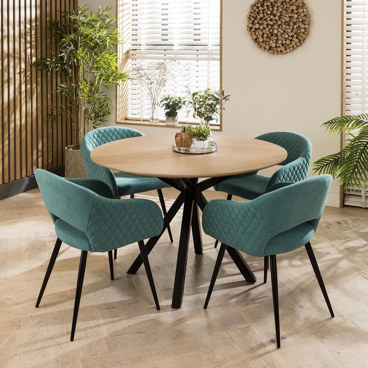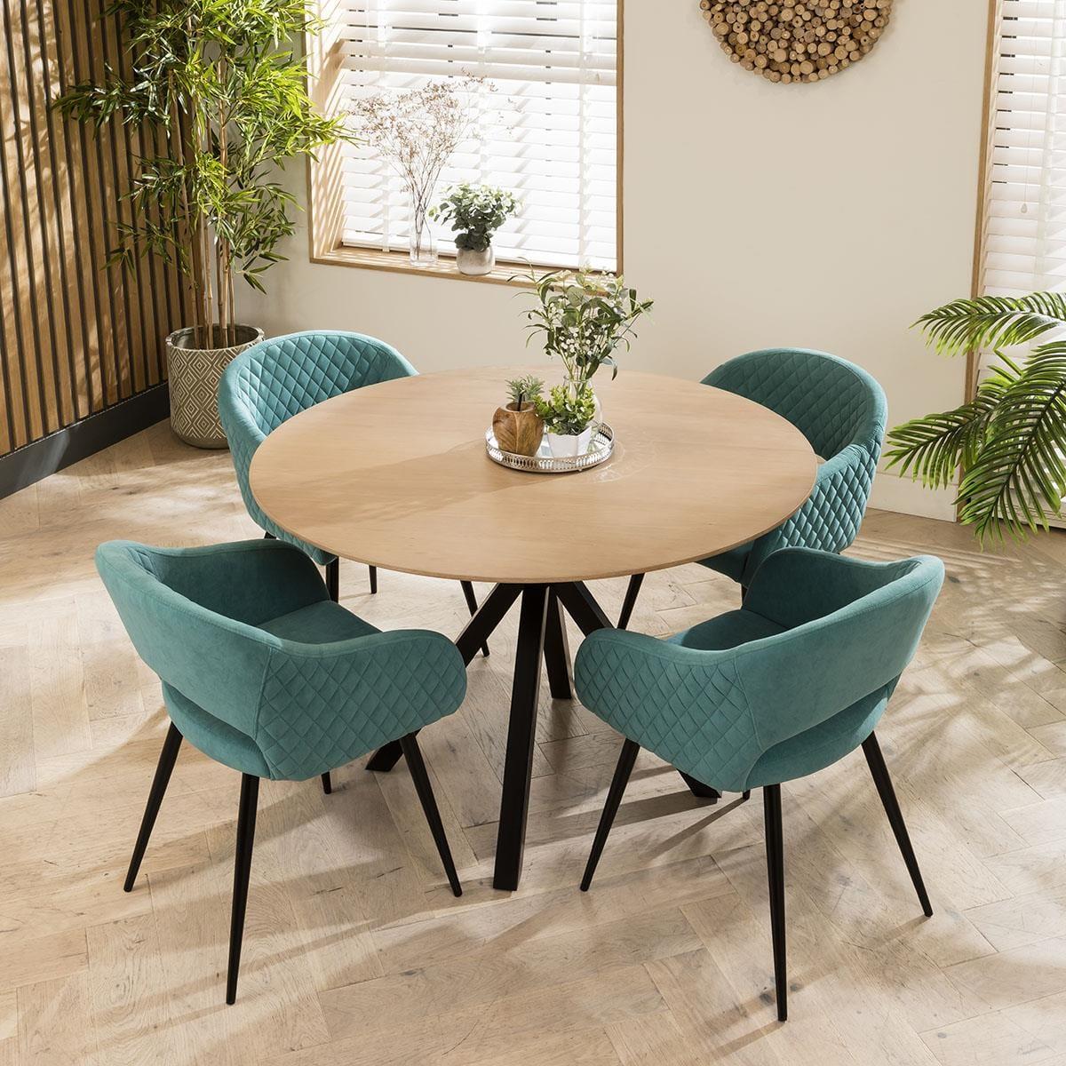 Indulge in luxury dining with our gorgeous Lucy dining set for 4. The lustrous teal velvet dining chairs add a touch of vibrancy to the elegant natural finish of the 120cm round solid wooden dining table. The four Lucy dining chairs promise a comfortable dining experience, upholstered in a soft-touch teal velvet. The Virgo 120cm modern round wooden dining table, perfect for intimate gatherings. Crafted with exquisite quality, the small 4-seater table in the set features a premium oak veneer with a natural finish. The reverse chamfer edge adds a unique touch, while the black metal star spider pedestal base ensures stability and style. The Lucy dining chair is a carver dining room chair with arms, a cosy wrap-around backrest, and a curved outline. The backrest gracefully curves upward, creating a timeless modern outline. Upholstered in vibrant teal velvet fabric with intricate quilted detailing, this dining table and 4 chairs will elevate any kitchen or dining space. This 4 seater dining set combines modern Lucy chairs with the stunning Virgo table. Whether you love the Lucy chairs and would like to purchase them individually, or you think the Virgo table would complete your interior scheme better with another chair, you can easily mix and match our modern dining tables and chairs to curate something truly unique. Table Size W120cm D120cm H78cm Chair Size W59cm D56cm H79cm Dining Table And Chair Set For 4