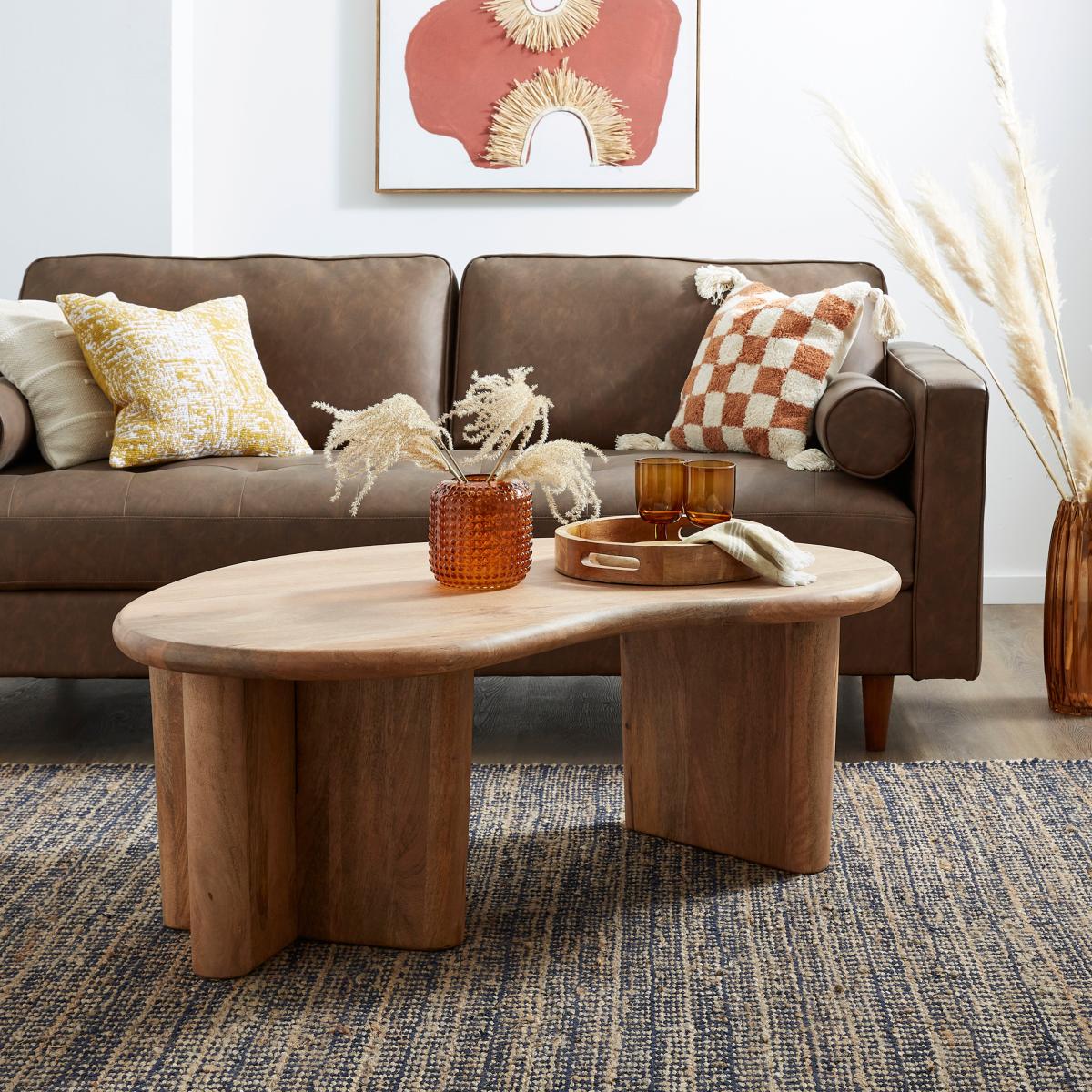 I’m a fan of this kidney-shaped mango-wood coffee table for its simple form and warm, natural grain - it adds instant character without feeling heavy. It slips neatly into Scandi-inspired lounges or more relaxed, boho-style spaces and even pairs well with a mid-century modern sofa. For styling, keep the top uncluttered: a low vase of dried flowers or a single sculptural bowl plus a neat stack of books works well. Position it on a textured rug to define the seating area, and echo its soft curves with round cushions or an oval mirror on the wall.