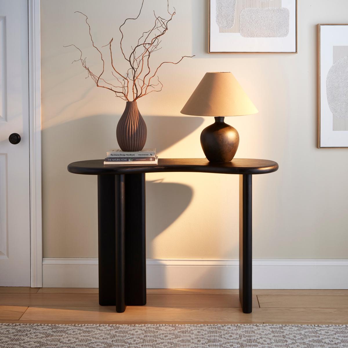 I’m a fan of the Ludo console for its gentle curves and slim profile - it works particularly well in contemporary, Scandi or mid-century inspired schemes where you need a statement piece that doesn’t overwhelm. The kidney shape adds a soft, organic counterpoint to straight-lined sofas or cabinetry, and the dark finish sits nicely against pale walls or alongside brass-framed mirrors. Styling tip: keep the top uncluttered - a low, sculptural vase or a stack of coffee-table books plus one taller object will emphasise the curve. In an entrance, it’s perfect for a slim tray to catch keys and change, while in the living room you can layer a linen runner, a small lamp and a bowl for a balanced yet relaxed look.
