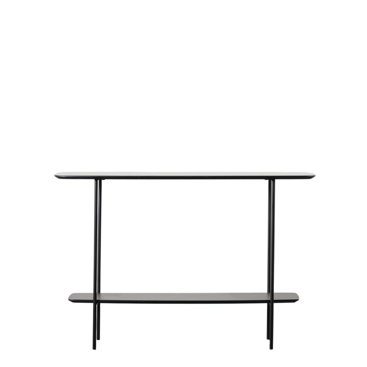 Dimensions W120 x D40 x H80 cm. Featuring gently rounded corners the stylish design of this eye-catching console table creates a clean contemporary look. The top is black faux marble which is perfectly complemented by the black metal frame and the table has a lower shelf with a black painted finish for added practicality. Matching pieces are available and are also available with white faux marble tops. Features. Black Marble Effect..