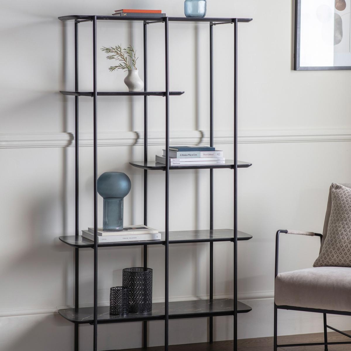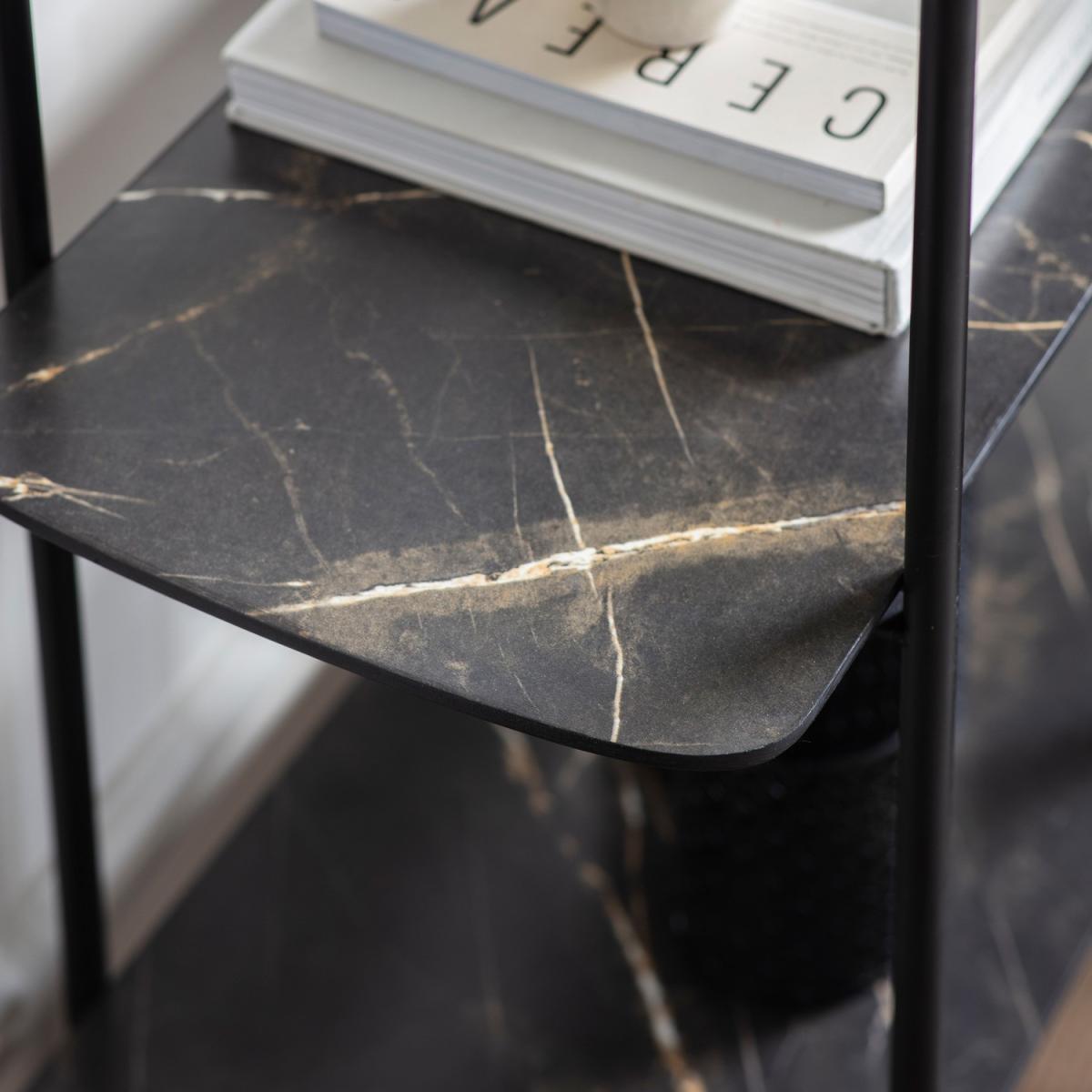 Dimensions W90 x D33 x H160 cm. Featuring gently rounded corners the stylish design of this eye-catching open display unit creates a clean contemporary look. The shelves are black faux marble which are perfectly complemented by the black metal frame. Matching pieces are available and are also available with white faux marble. Features. Black Marble Effect..
