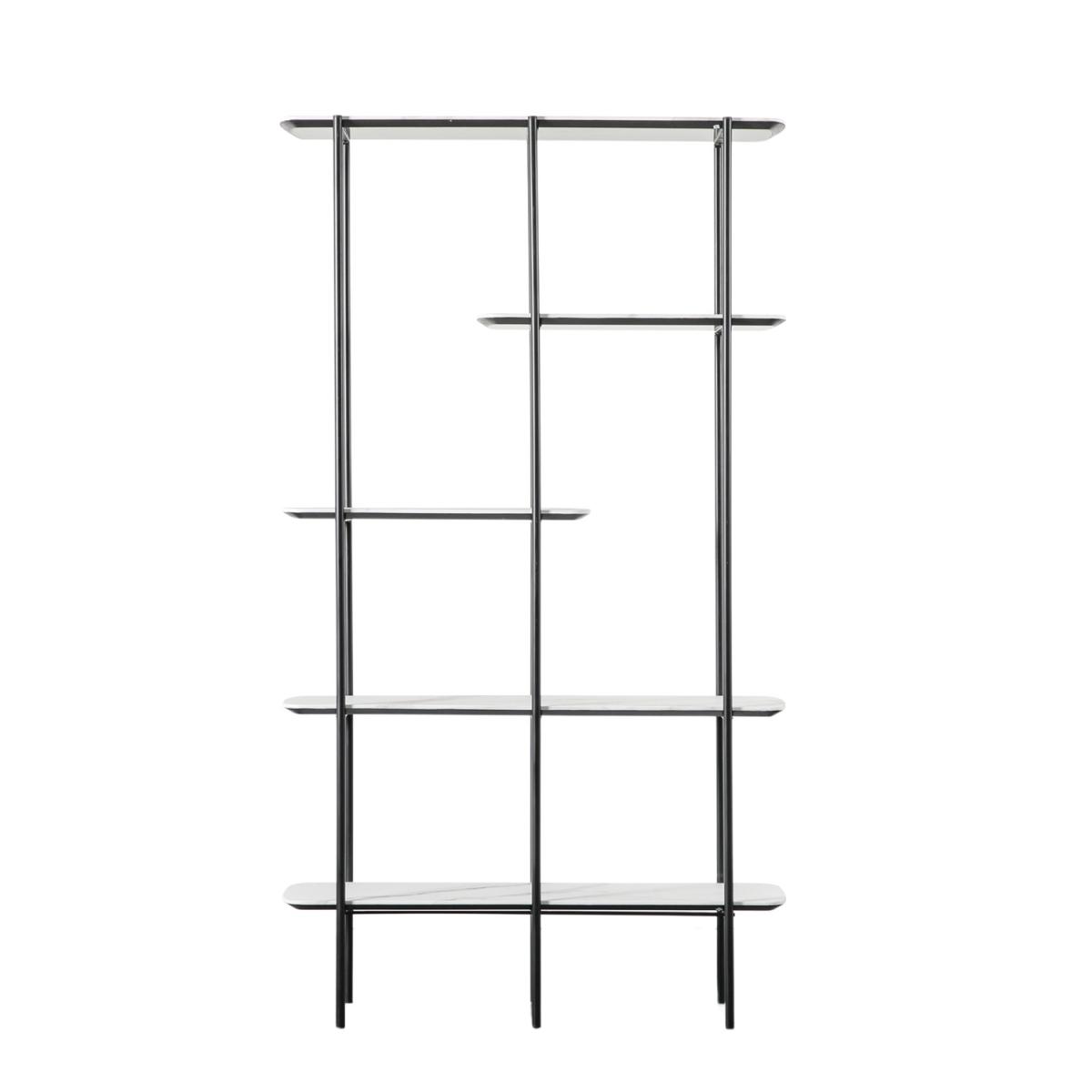 Dimensions W49 x D45 x H90 cm. Featuring gently rounded corners the stylish design of this eye-catching open display unit creates a clean contemporary look. The shelves are white faux marble which are perfectly complemented by the black metal frame. Matching pieces are available and are also available with black faux marble. Features. White Marble Effect..