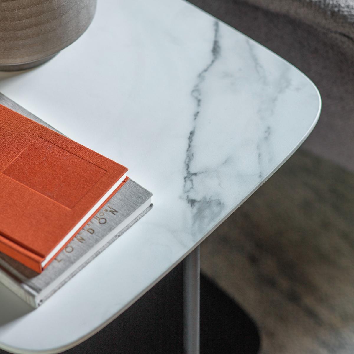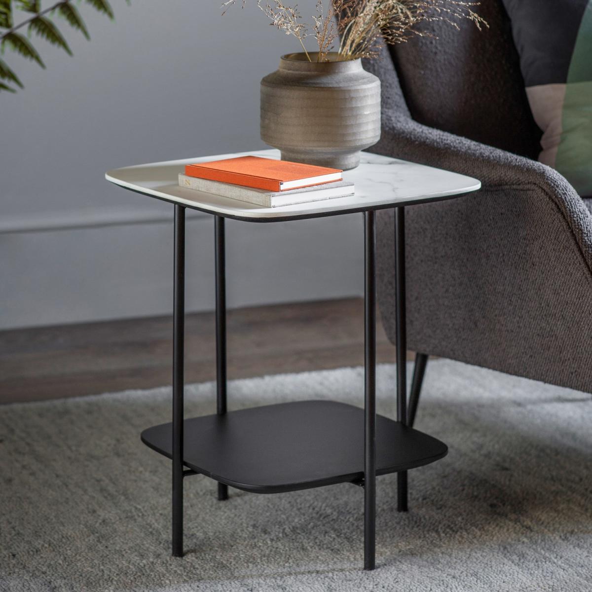 Dimensions:W45 x D45 x H55 cm Featuring gently rounded corners, the stylish design of this eye-catching side table creates a clean, contemporary look. The top is white faux marble, which is perfectly complemented by the black metal frame, and the table has a lower shelf, with a black painted finish, for added practicality. Matching pieces are available, and are also available with black faux marble tops. Features: White Marble Effect