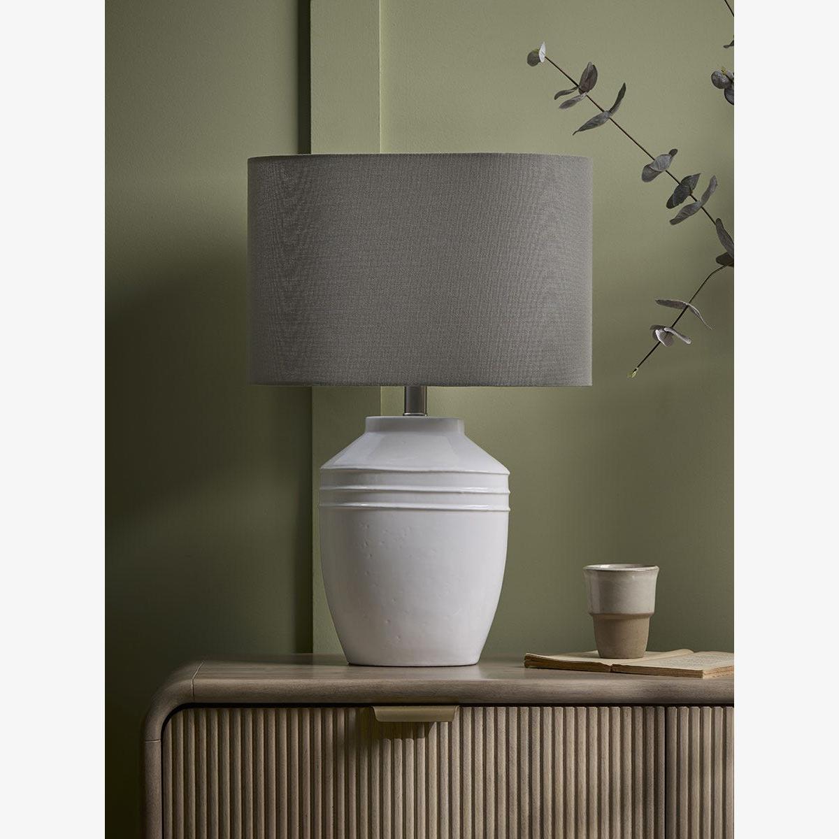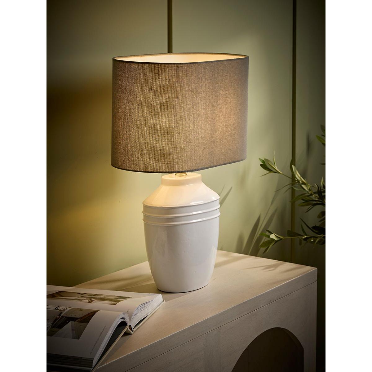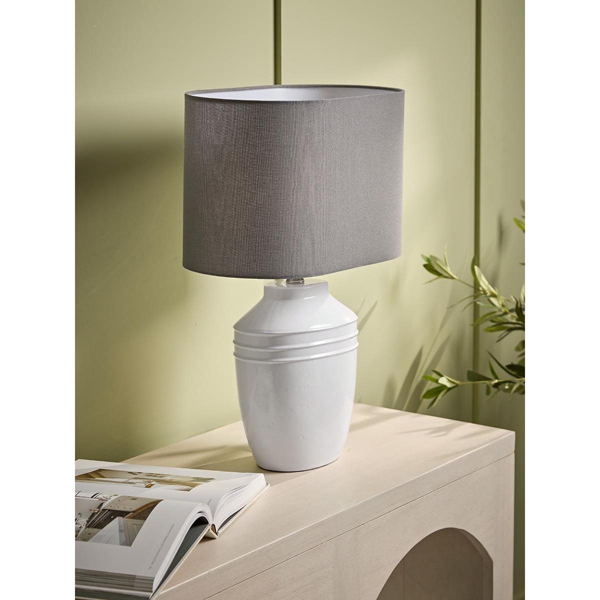 Handcrafted from ceramic, our Lugina table lamp has an urn-shaped base that inspires simplicity and elegance in your home. Intricate ridges create visual interest to the top of the base, whilst the grey shade pairs wonderfully with the lighter neutral tones on the base for a lamp that fits in our Scandi trend. Perhaps seemingly simple from the front, the lamp base is paired with an oval shade, meaning it can be placed up against walls and in smaller nooks of your home, adding light and warmth to each and every corner.