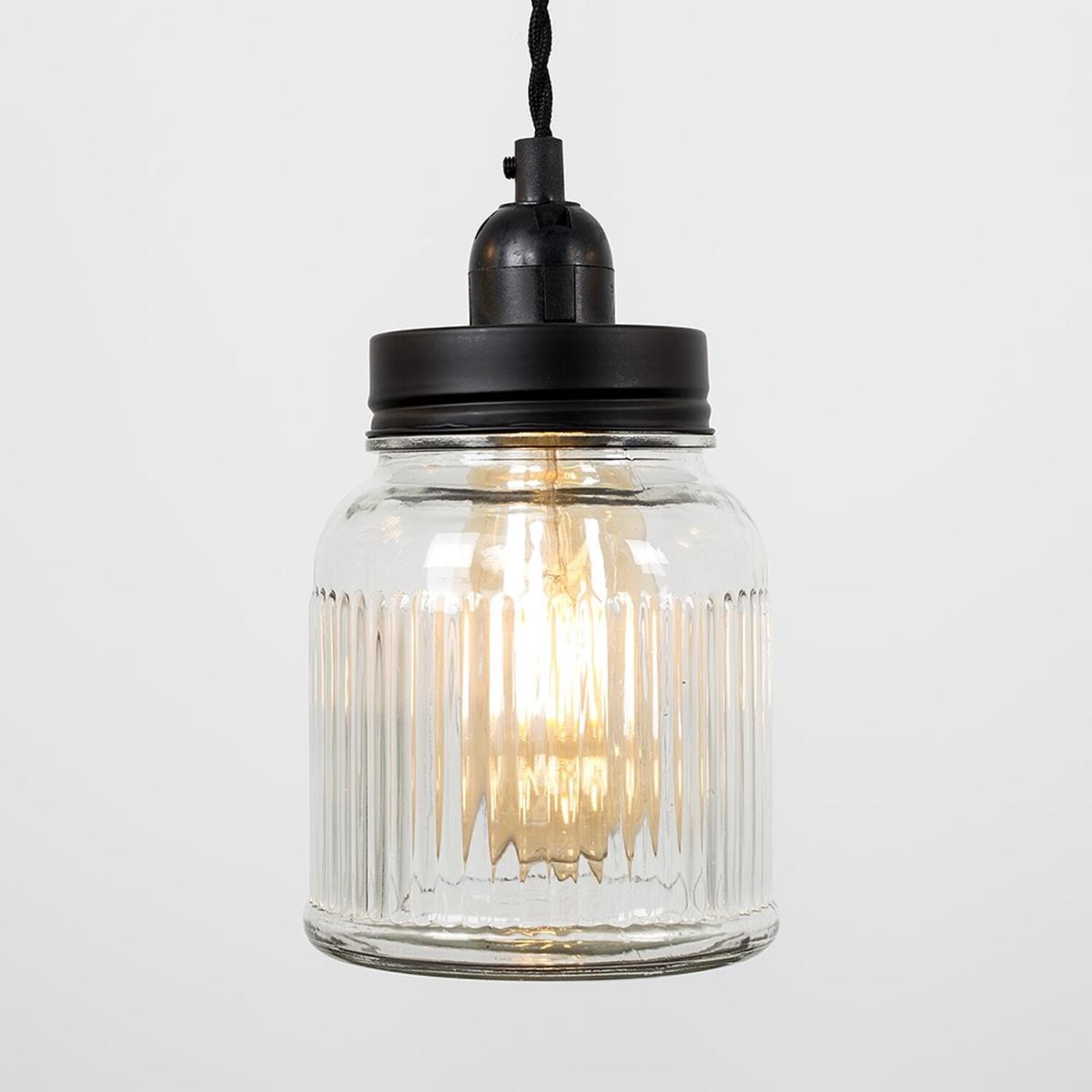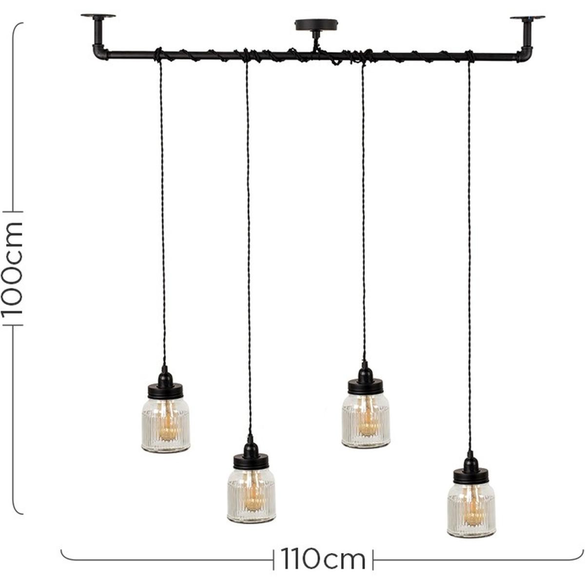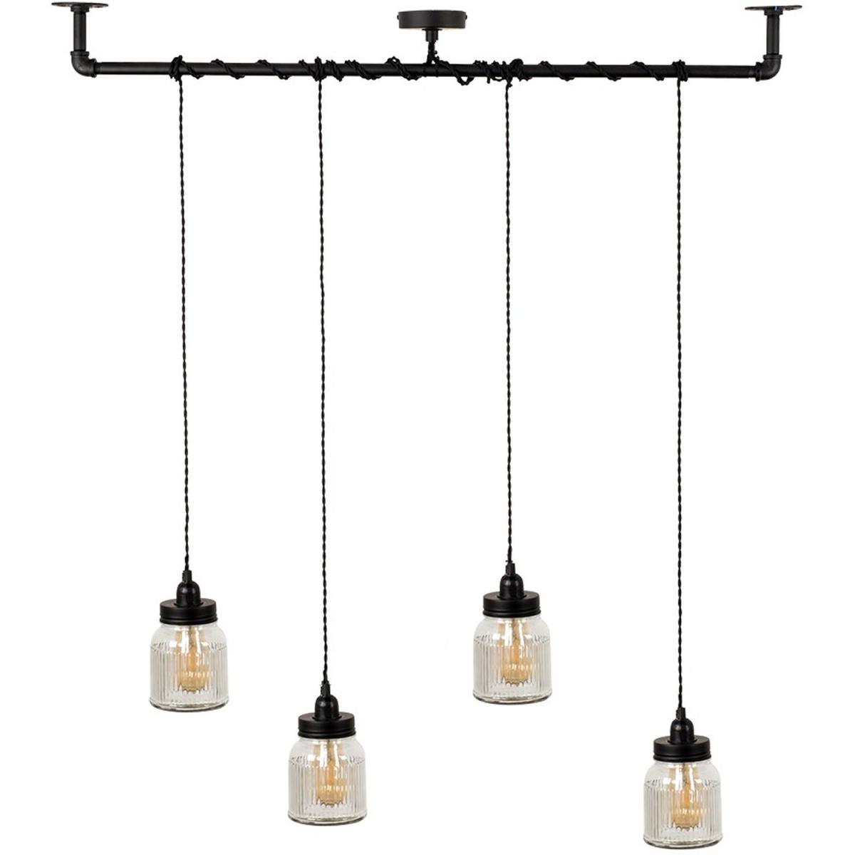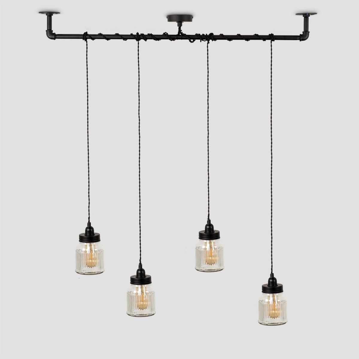 Vintage and industrial style satin black 4 way pipework wrap over ceiling light. This unique light comes complete with clear glass ribbed design jar shades with a black metal lid, which will make a real style statement and complete your living space look. Ceiling lights are usually the main source of illuminating a room but with the many styles on offer today, also become a main focal point or talking point. Ideal for dining rooms, kitchens and other living areas.