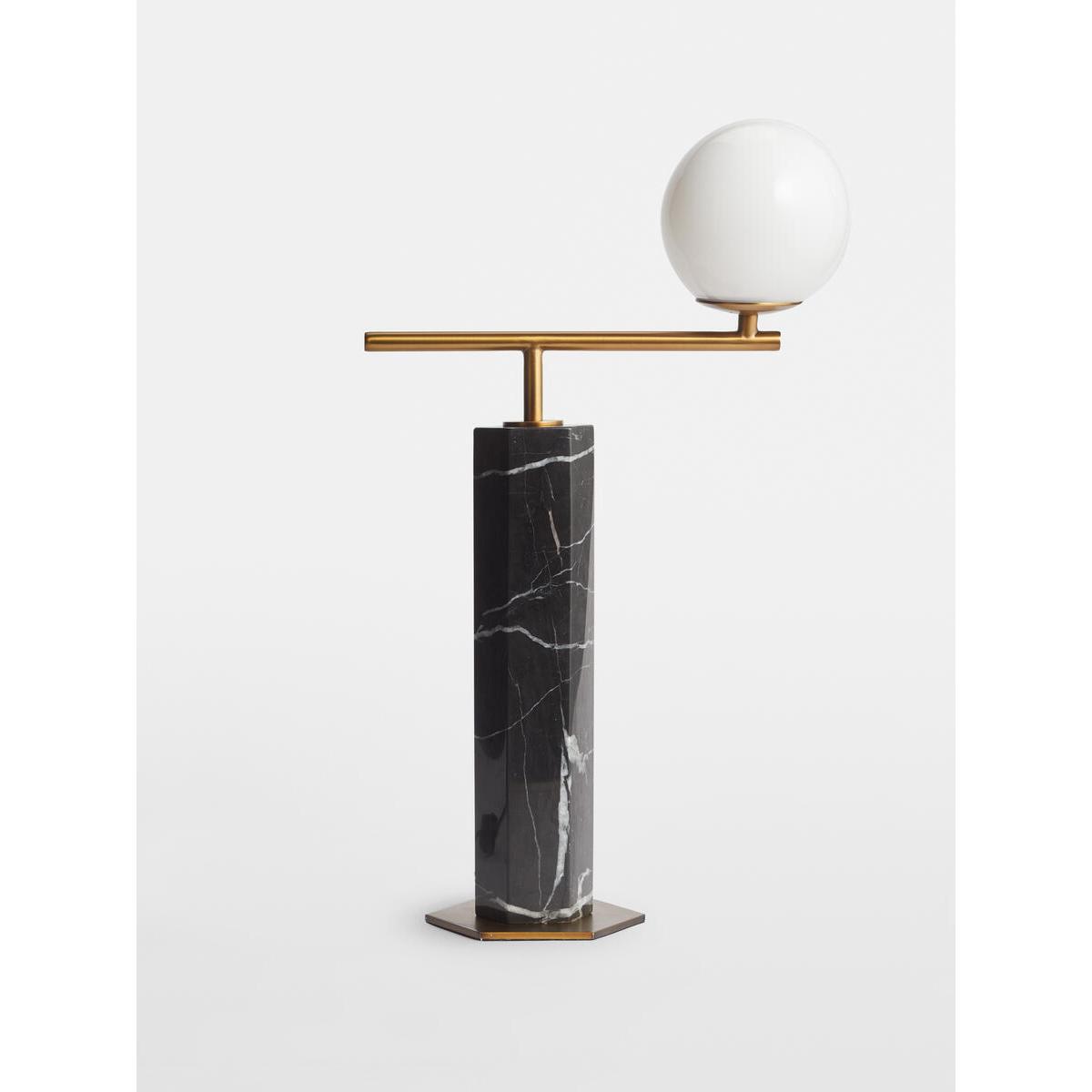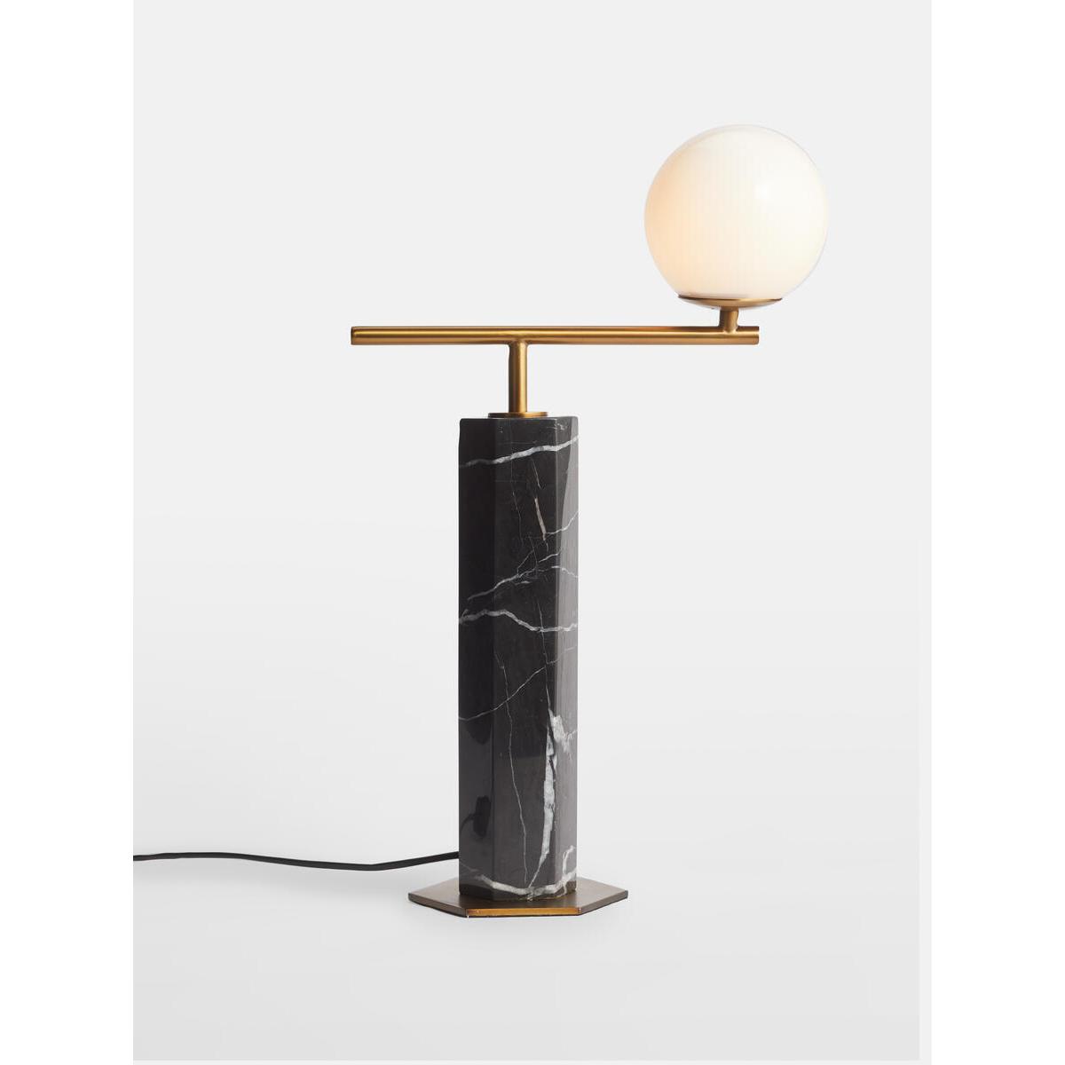 Our Luiz table lamp echoes the vintage-inspired lighting seenthroughout 180 House on London's Strand. A white glass orb isfitted onto a marble column that is carved into a hexagonal design. Perch it on a side table to add instant ambience into yourmost-used space. Table lamp. Hexagonal marble column. White glass orb suspension. Requires 1 / G9 / LED / 4W MAXIMUM. Inspired by 180 House.