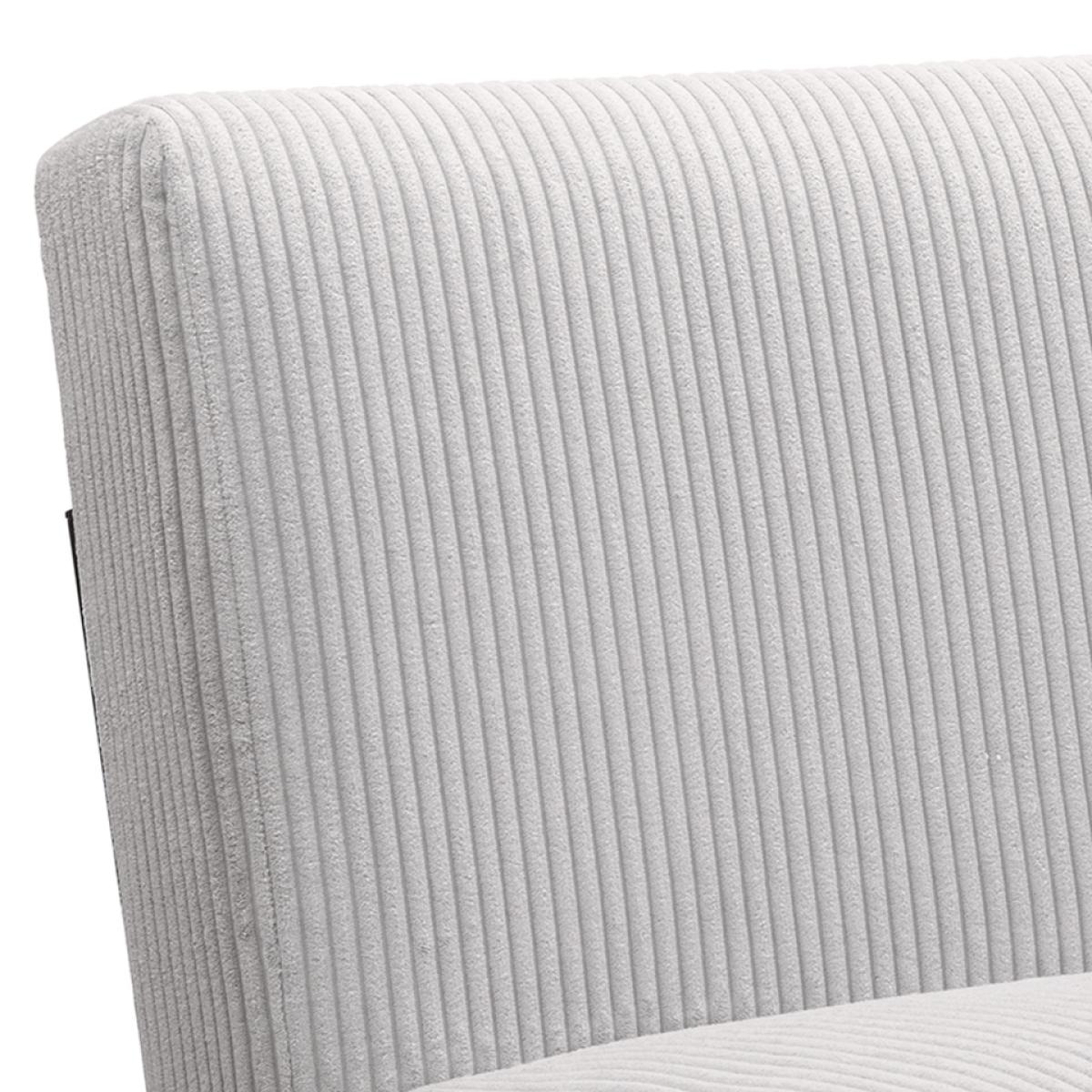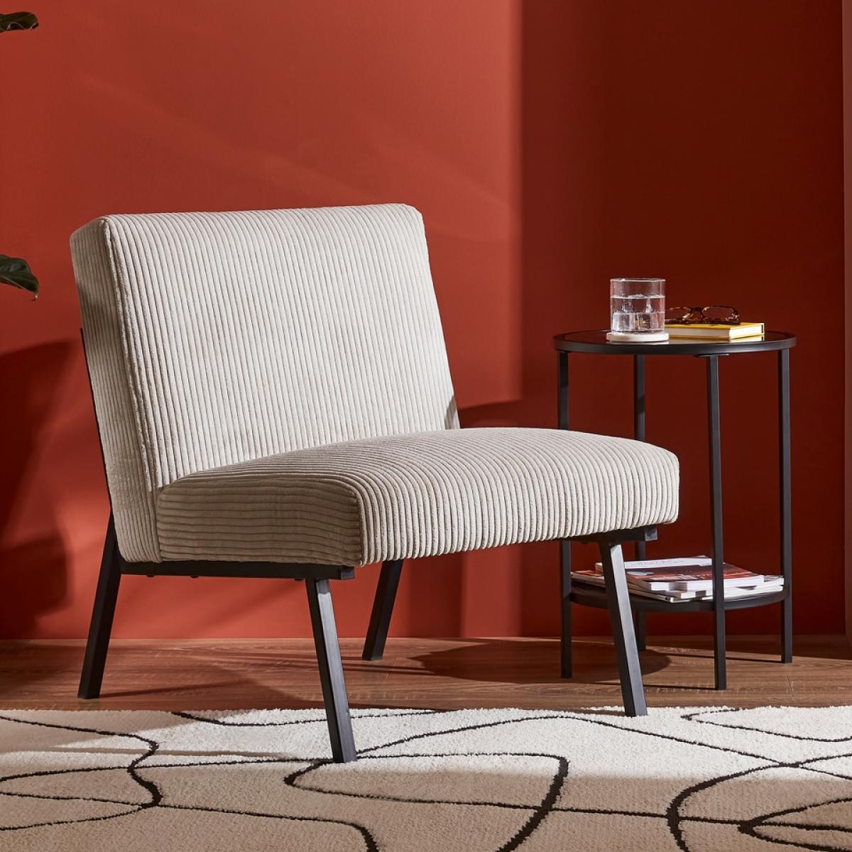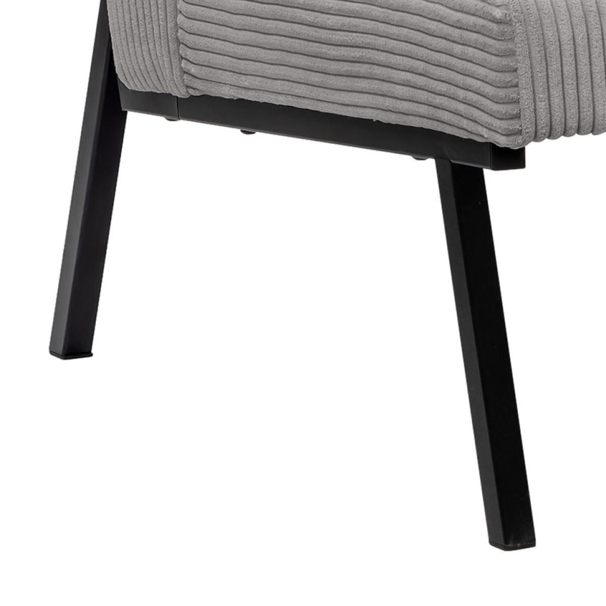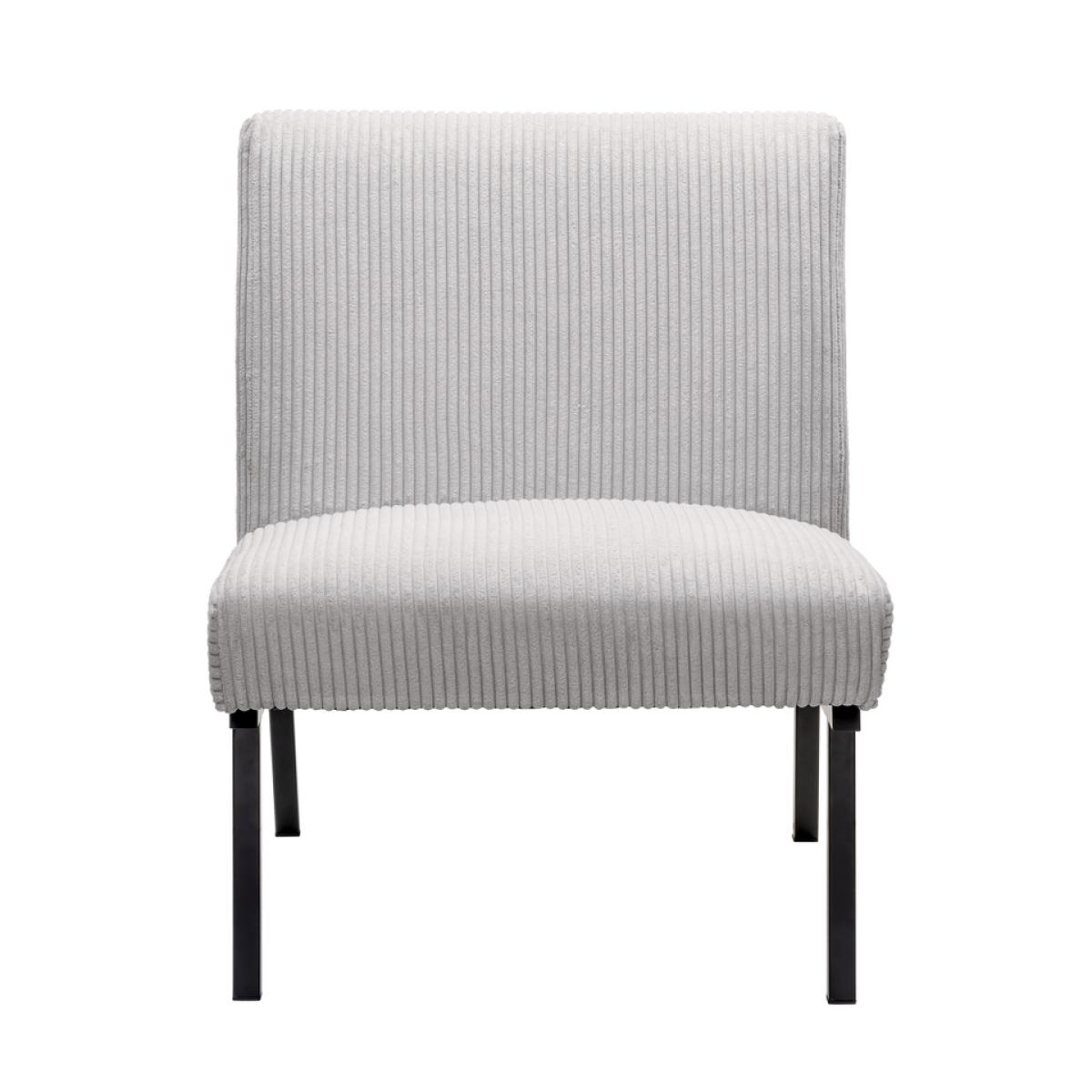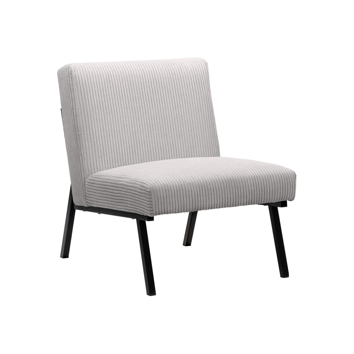 Design simplicity at its best. The Lukas Accent Chair is one compact, sleek little number. Upholstered in a soft grey corduroy fabric, this chair is raised on contrasting, sturdy black metal legs. The gently angled backrest and generously foam-filled cushion make this occasional chair a comfortable and supportive seat.