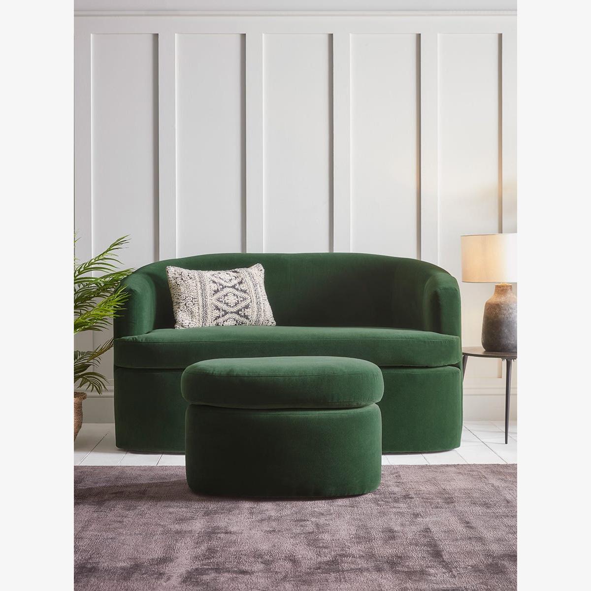 Glamorous curves, a wide choice of fabrics from bouclé to black leather and solid English craftsmanship make our Lulea the most desirable of curved furniture collections. The lozenge shaped ottoman perfectly echoes the elegant lines of both the two seater sofa and the armchair from our bespoke Lulea living room furniture range. Complete your living space with this versatile piece that can be used as a footrest, pouffe or even a hand spot to rest a tray. The Lulea range also includes a two seater sofa and an armchair. Pictured here in our Forest Green velvet material, our Lulea collection can be upholstered in a choice of 34 distinctive shades and six fabrics to suit your style. Read our Upholstery FAQs View our full Upholstery Terms and Conditions