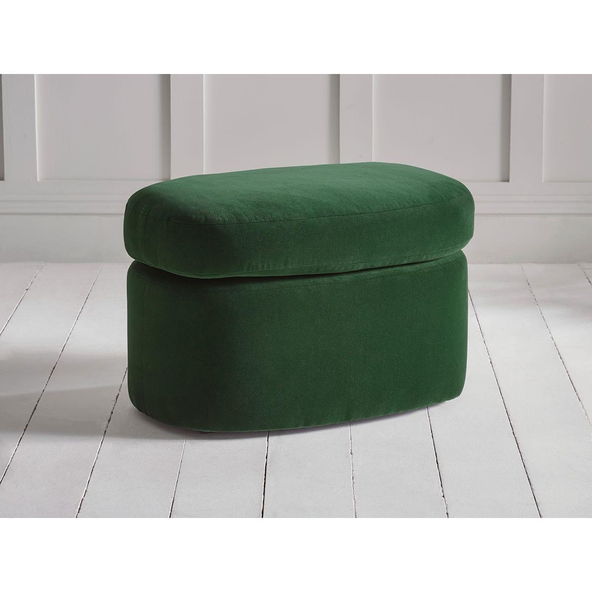 Glamorous curves, a wide choice of fabrics from bouclé to black leather and solid English craftsmanship make our Lulea the most desirable of curved furniture collections. The lozenge shaped ottoman perfectly echoes the elegant lines of both the two seater sofa and the armchair from our bespoke Lulea living room furniture range. Complete your living space with this versatile piece that can be used as a footrest, pouffe or even a hand spot to rest a tray. The Lulea range also includes a two seater sofa and an armchair. Pictured here in our Forest Green velvet material, our Lulea collection can be upholstered in a choice of 34 distinctive shades and six fabrics to suit your style. Read our Upholstery FAQs View our full Upholstery Terms and Conditions