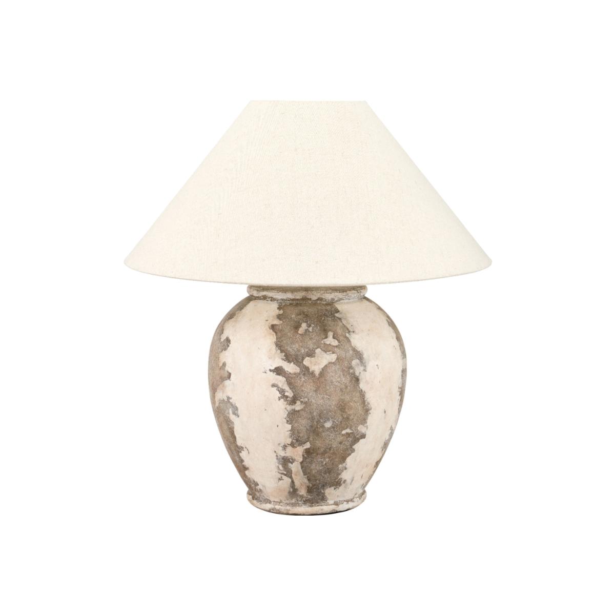 Individually handcrafted in the Philippines, our tall, urn shaped stoneware table lamp base, boasts an antique finish that adds depth to any room. Each piece features an abstract vintage design, making it one of a kind. With its neutral cream and grey tones, and timeless empire shade, in a natural slubby cotton, this lamp seamlessly fits into any interior, making it a versatile and stylish addition to your home. Lamp Base Dimensions: H38xW27xD2. 7 cm Shade Dimensions: H22xW50xD5. 0 cm Requires 1x 10-12W LED ES27 lightbulb