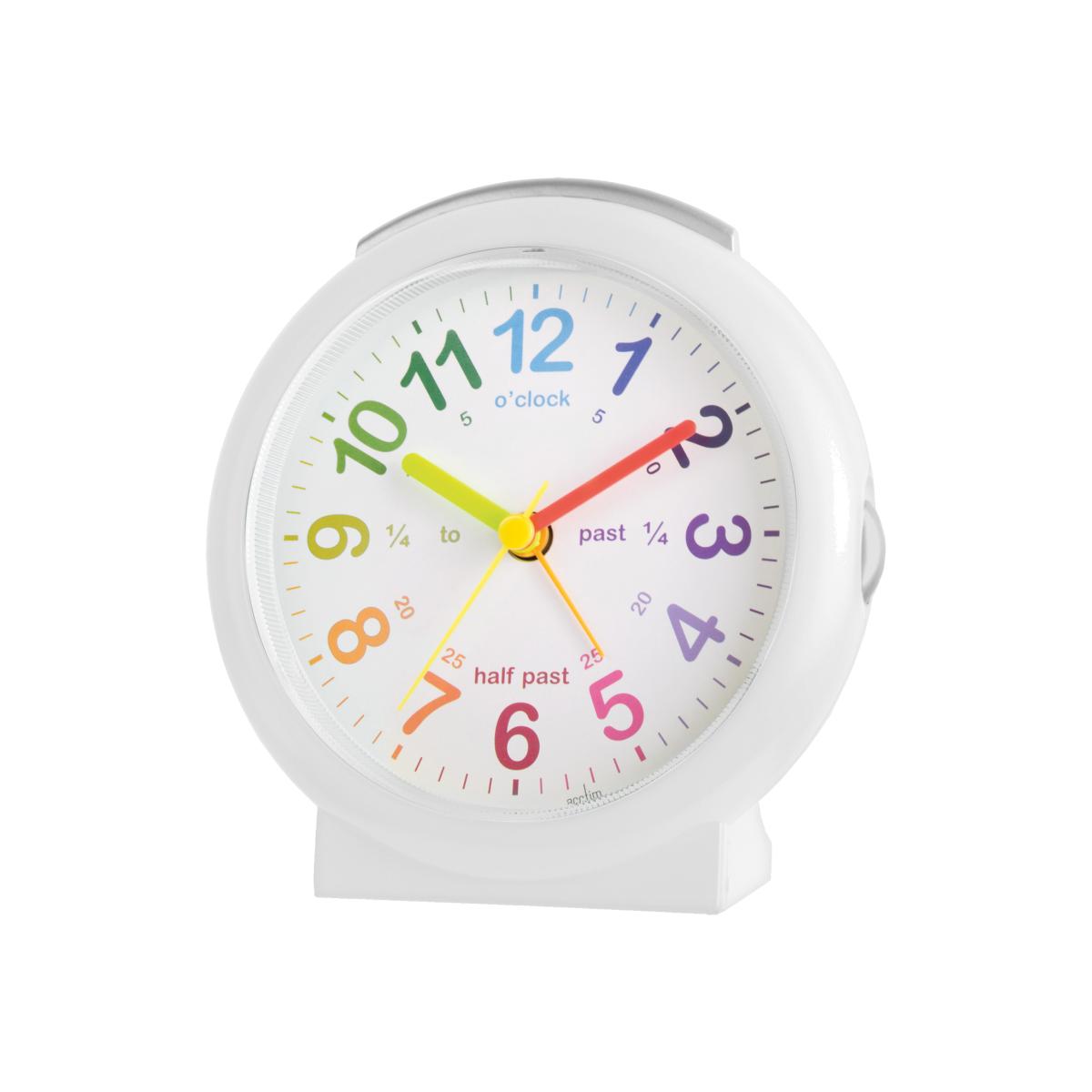 Lulu Time teaching alarm clock, brightly coloured numbers make learning the time more fun. Non-ticking sweep seconds hand. Crescendo alarm with snooze backlight